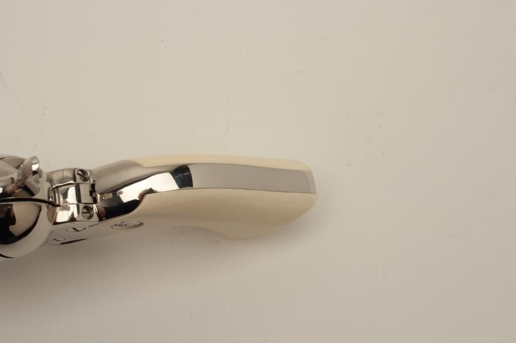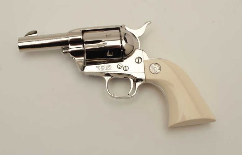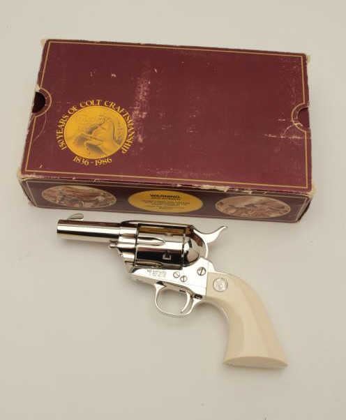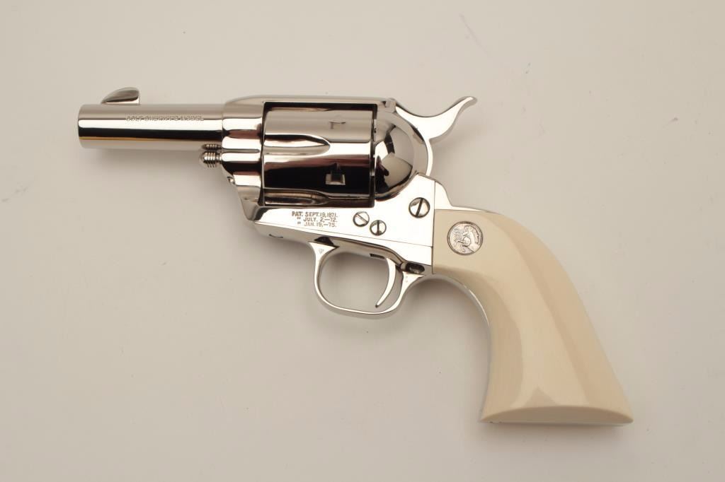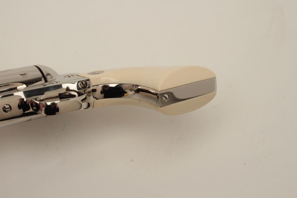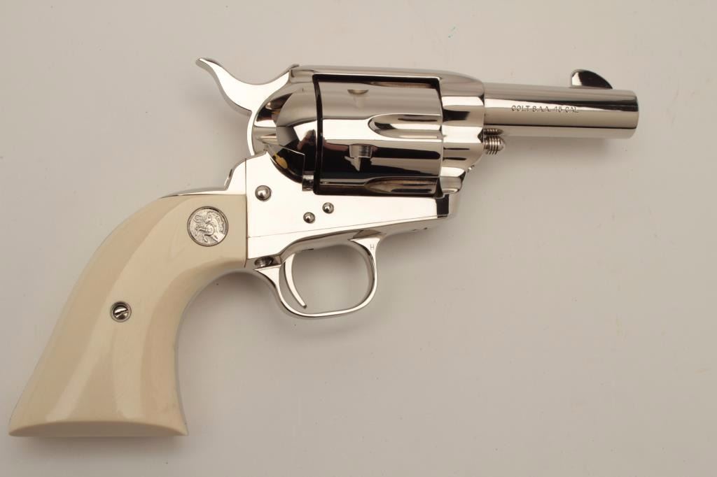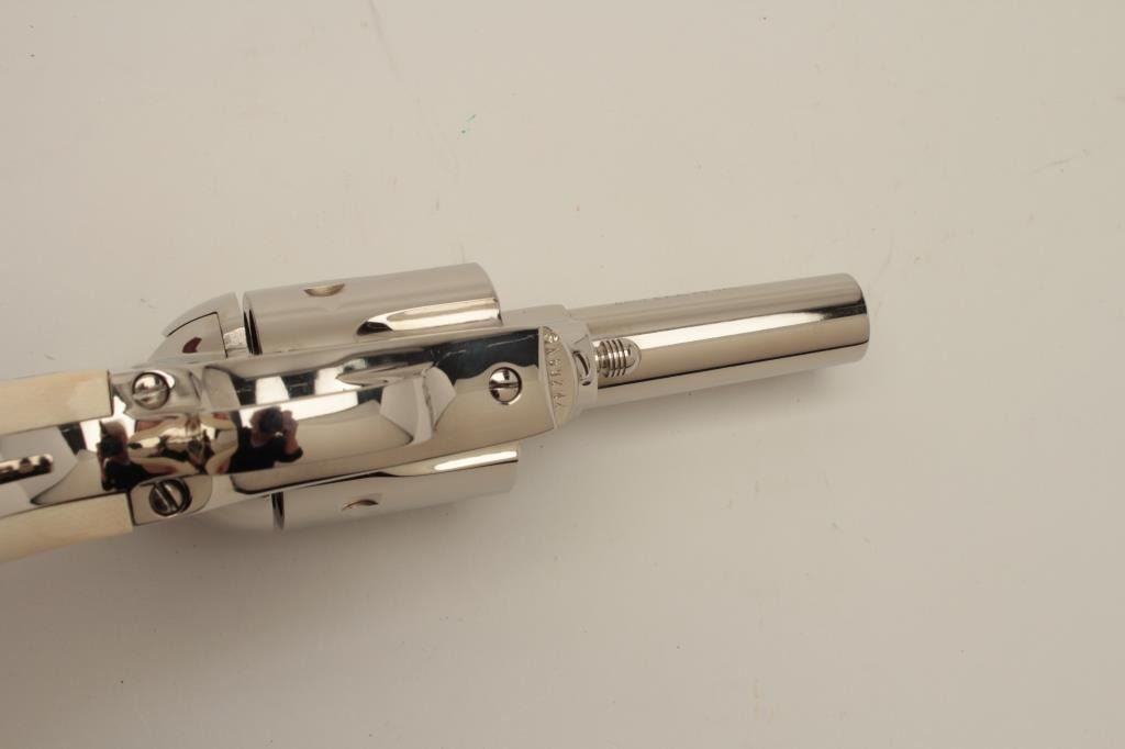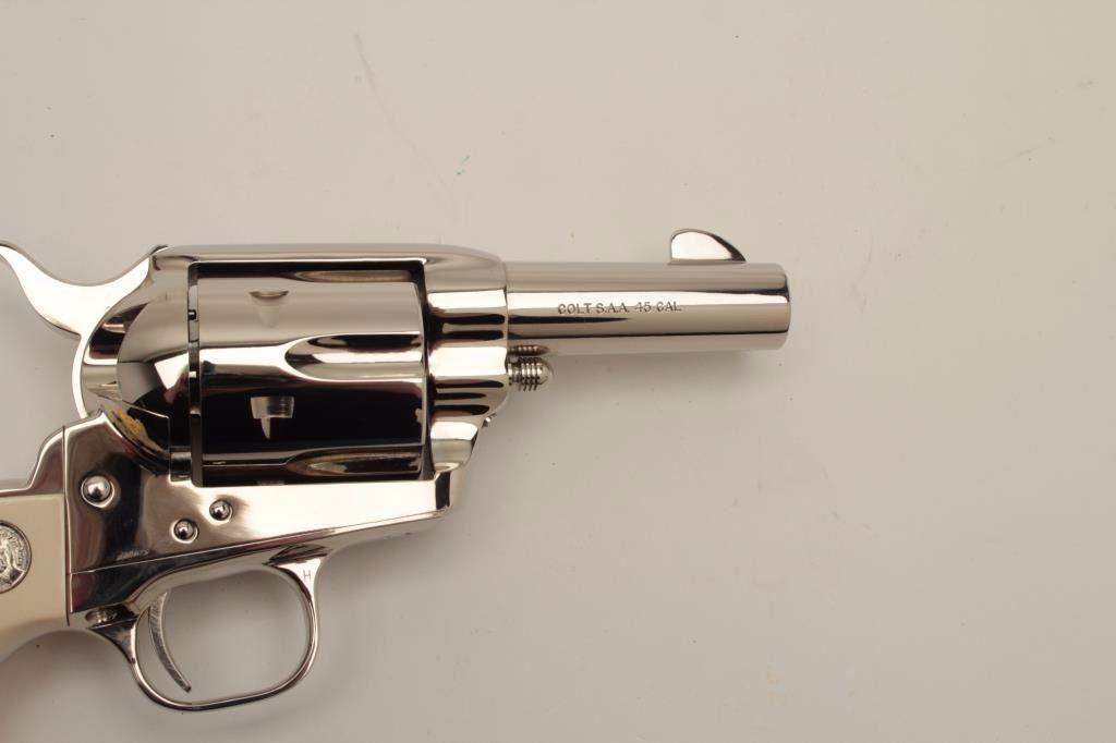 Special ordered Colt SAA “Sheriffs Model” revolver in .45 L.C. caliber, 3” barrel, nickel plated, smooth ivory medallion grips, blackpowder style frame and patent dates, shipped to Lew Horton Dist. On May 13, 1987,8 guns in shipment. In excellent to new in box condition showing no firing or use. Has been strapped and no operation. Almost mint. Copy of factory letter included. (Modern/PPT) Est.: $2000-$4000