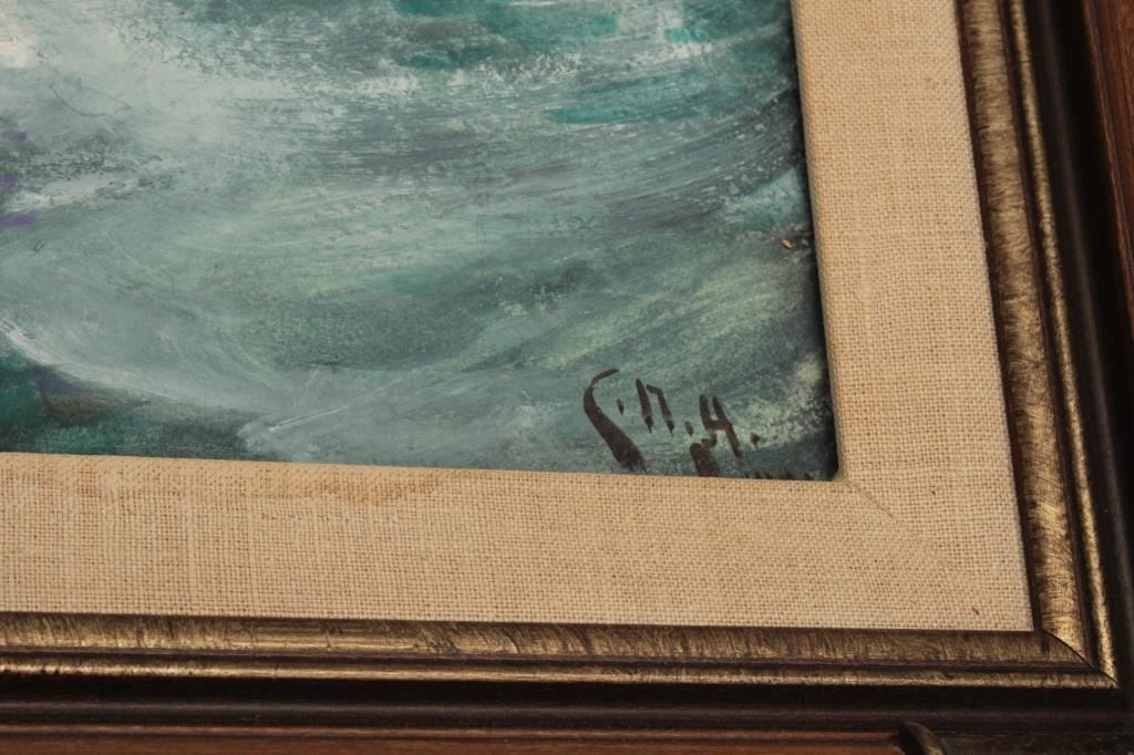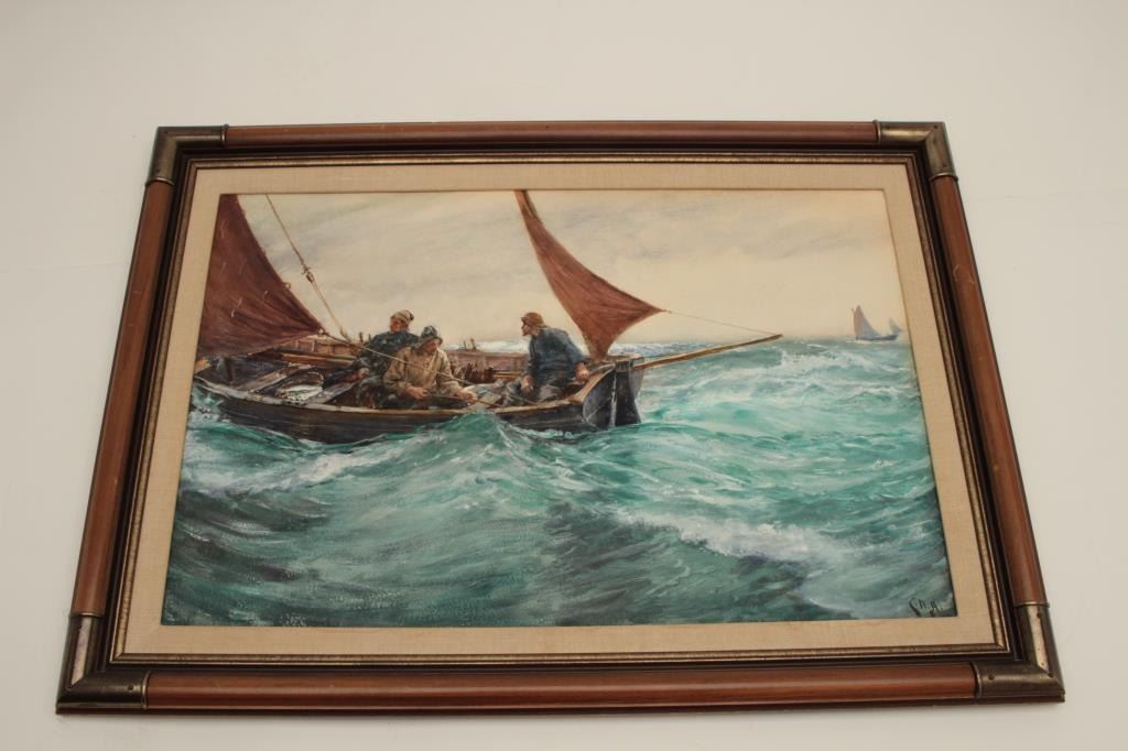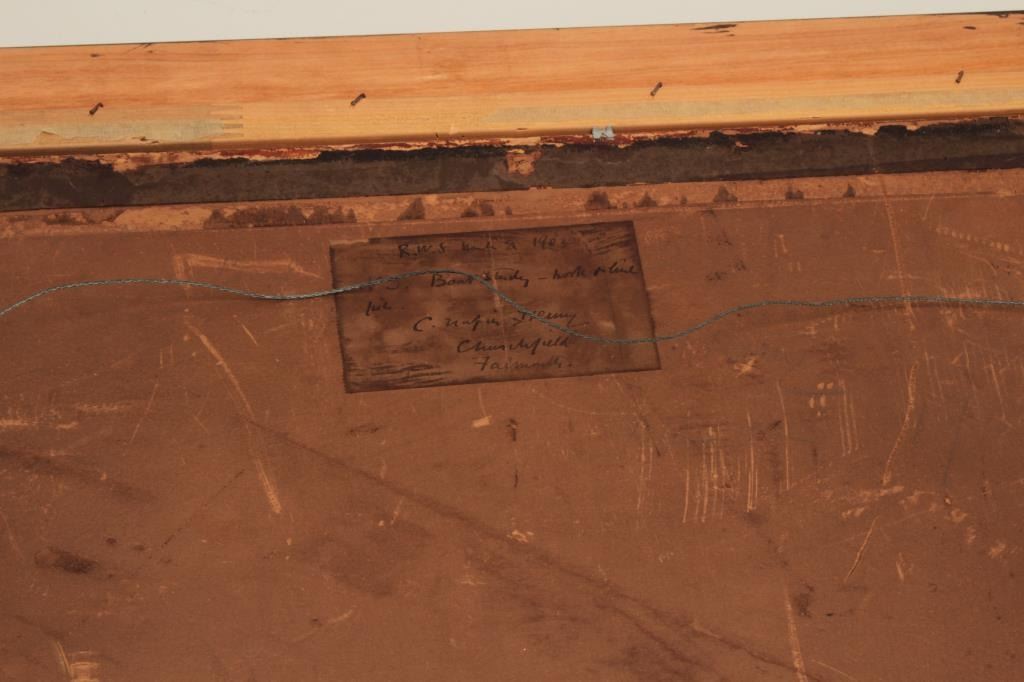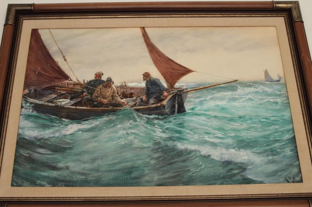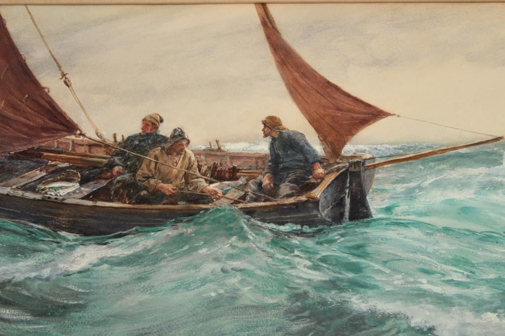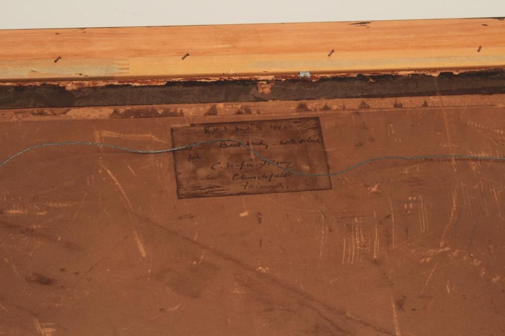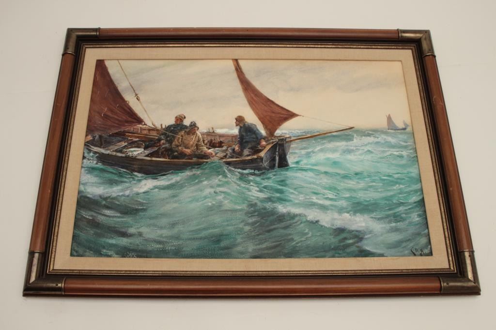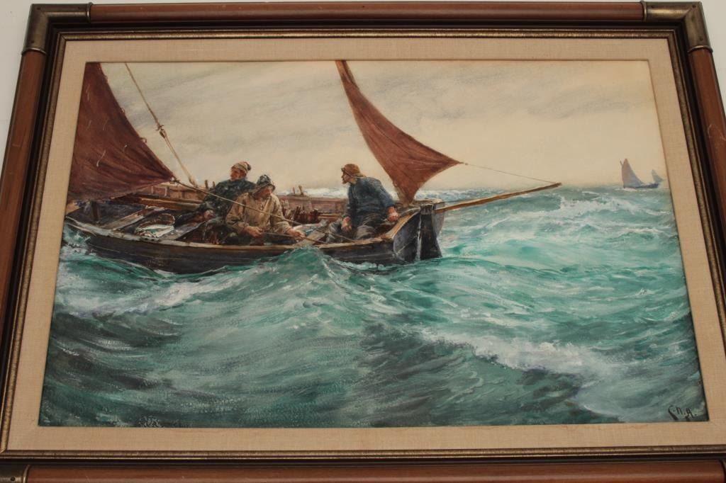Goache on artist board signed lower right “C.N.H. 1902” and also titled and signed on the label mounted on reverse “Boat Study”. Measures 18” x 27” image only. Very good plus condition with no issues. Could use minor or light freshening (cleaning). Hemy studied at Newcastle school of art with William Bell Scott. Inspired by John Ruskin and pre-Raphaelite painters. Also studied in Antwerp under Baron Hendrik Leys. Heexhibited at England’s Royal Academy in 1869 and was elected to full membership in 1910. He lived in London and Falmouth, England. He completed many nautical scenes due to his proximity to the ocean and ships. Before hisdeath in 1917 he exhibited over 80 time at Royal Academy and his works were heralded in his lifetime. Very good to near fine condition. No damage. Est.: $1500-$3000