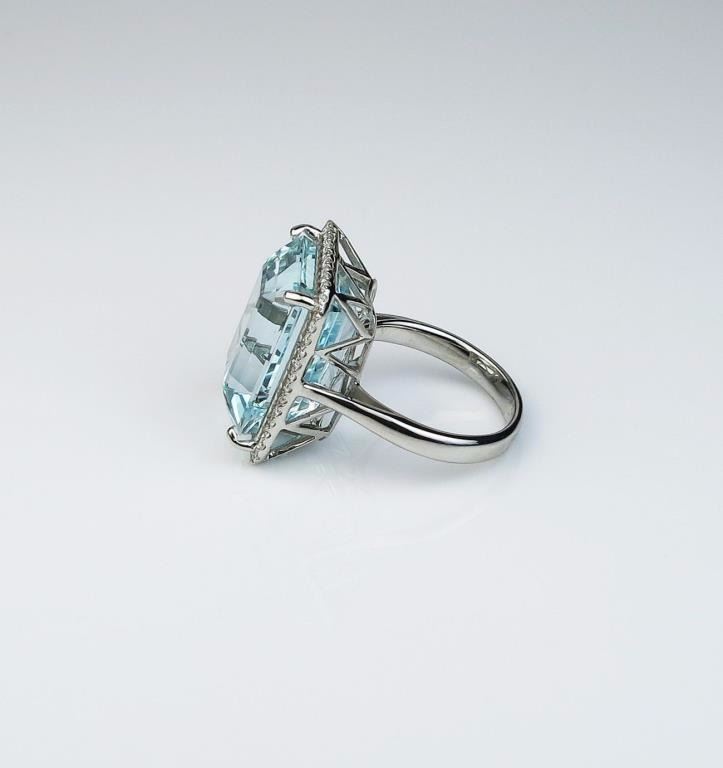 Stunning Aquamarine ring featuring a Fine Aquamarine weighing approx. 20.00 carats and surrounded by over 50 round diamonds weighing approx. 0.70 carats of F-G colors and VS/SI clarity set in a 14 karat white gold custommade setting. Retail $15,000-$20,000 Estimates $7,000-$9,000 Nice