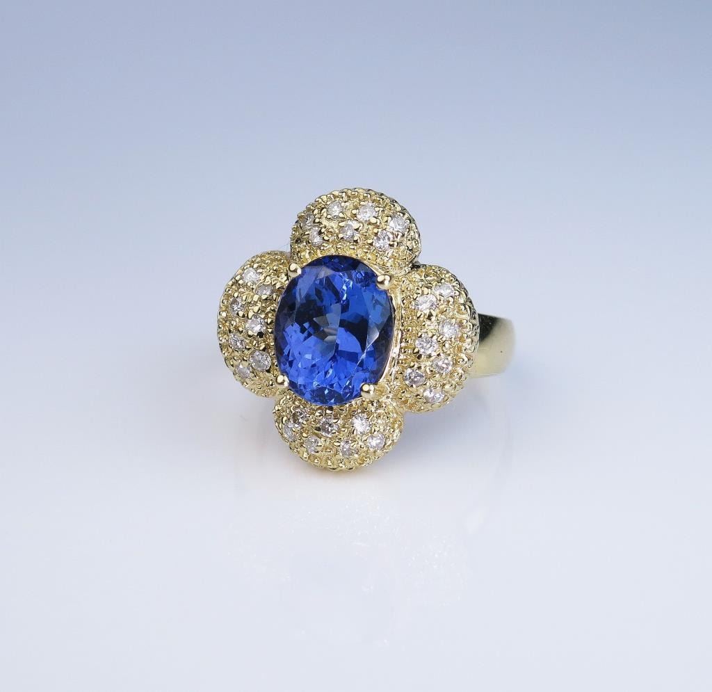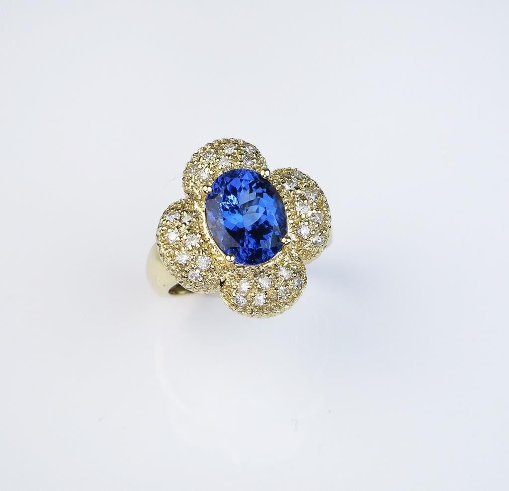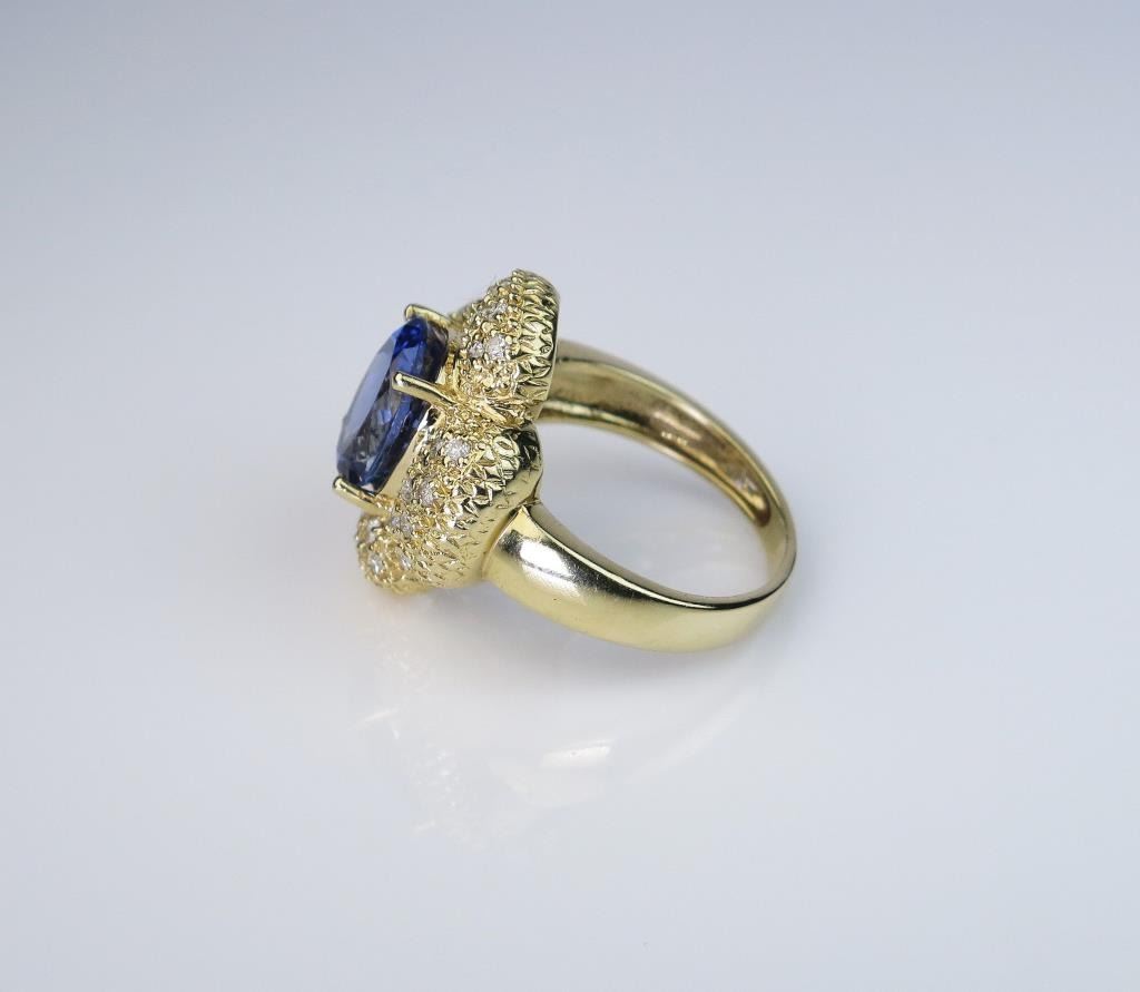 Gorgeous Tanzanite weighing approx. 4.50 carats and pave set with 28 round diamonds weighing approx. 0.70 carats of H-I colors set in a 14 karat yellow gold custom made ring. Retail $4,000-$6,000 Estimates$3,000-$4,000 Labor intensive