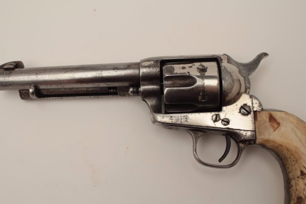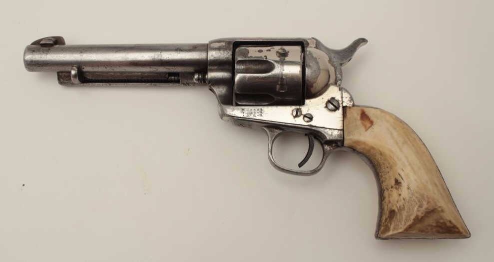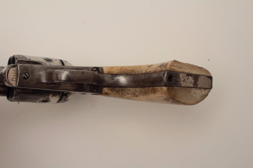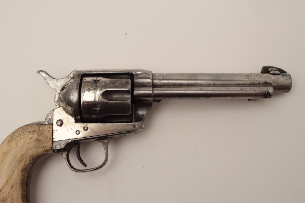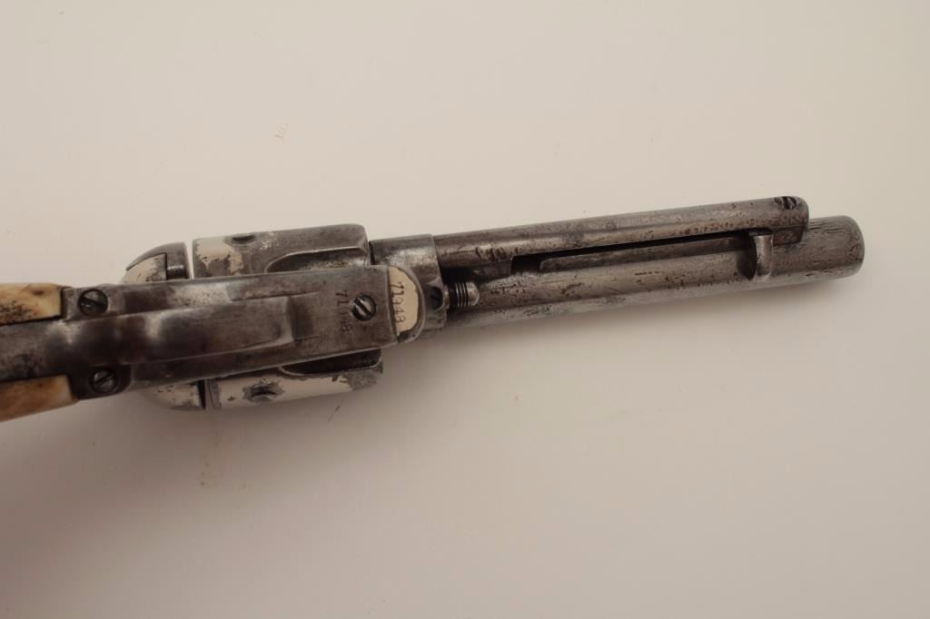 Colt Single Action .44-40 caliber with 7 ½” barrel reduced to 5 ½” with blade and post front sight type made by frontier gunsmiths like Fruend of Colorado and Hart of Tucson, S/N 71948 with 3 line patent dates. Allvisible matching serial numbers with no number on the cylinder. 20%-40% old of the period nickel finish that has lifted and cracked with the balance going to lightly polished gray patina on exposed metalsurfaces. A couple of screws replaced and back strap screw missing. Old handmade bone grips fitted to this back strap long ago (1 piece). Working well and fair bore. Has a good western frontier look. (Antique) Est.:$1750-$3500