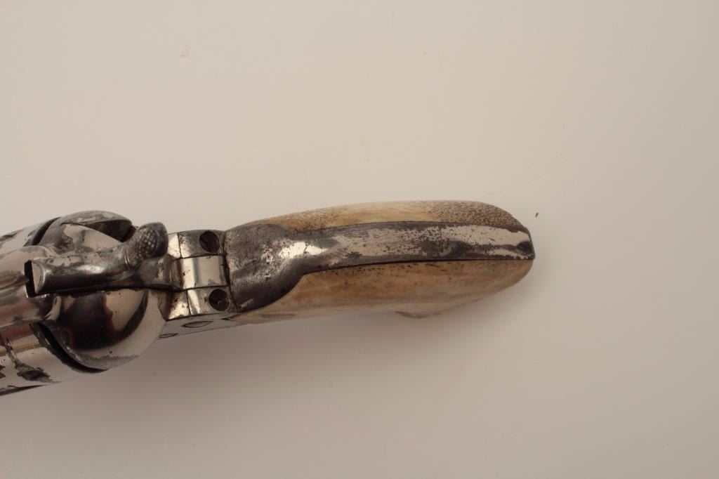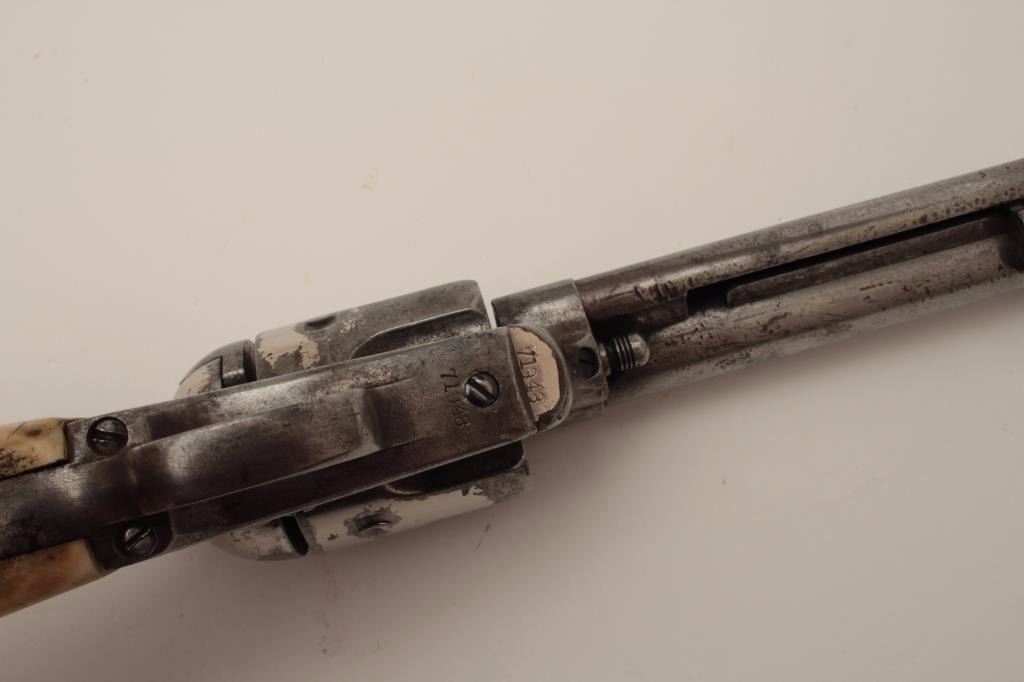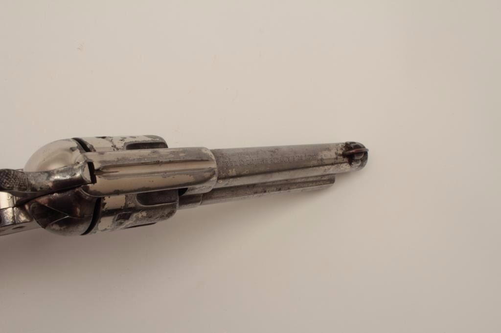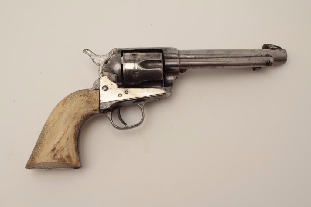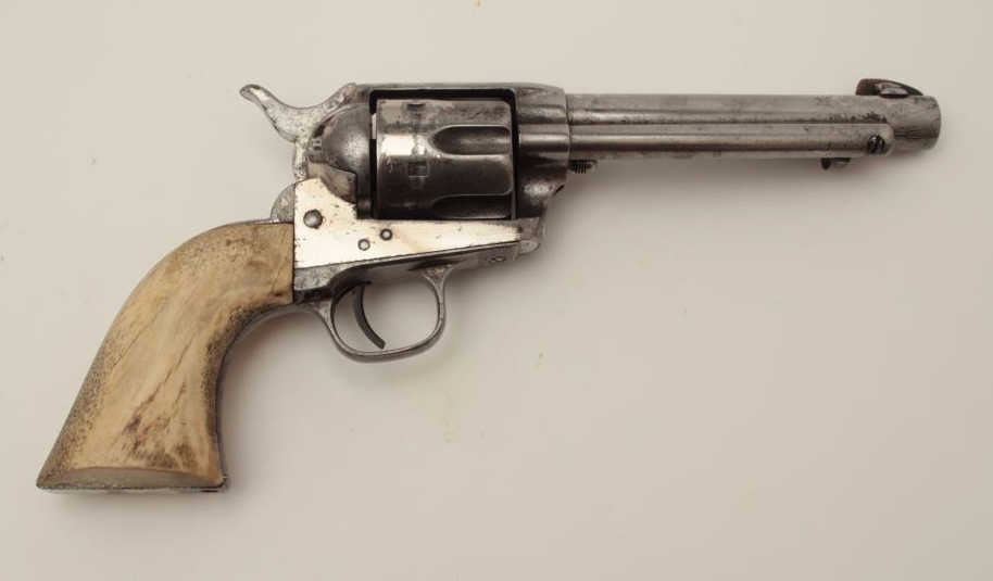 Colt Single Action .44-40 caliber with 7 ½” barrel reduced to 5 ½” with blade and post front sight type made by frontier gunsmiths like Fruend of Colorado and Hart of Tucson, S/N 71948 with 3 line patent dates. Allvisible matching serial numbers with no number on the cylinder. 20%-40% old of the period nickel finish that has lifted and cracked with the balance going to lightly polished gray patina on exposed metalsurfaces. A couple of screws replaced and back strap screw missing. Old handmade bone grips fitted to this back strap long ago (1 piece). Working well and fair bore. Has a good western frontier look. (Antique) Est.:$1750-$3500