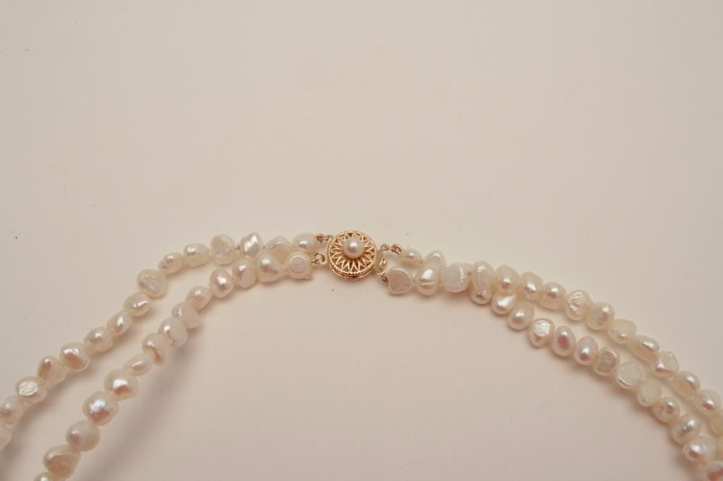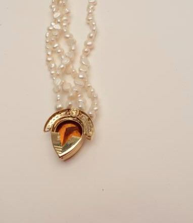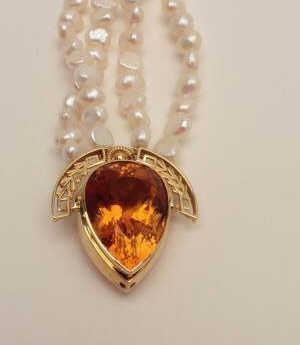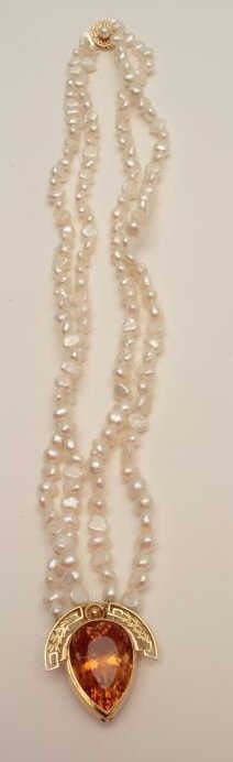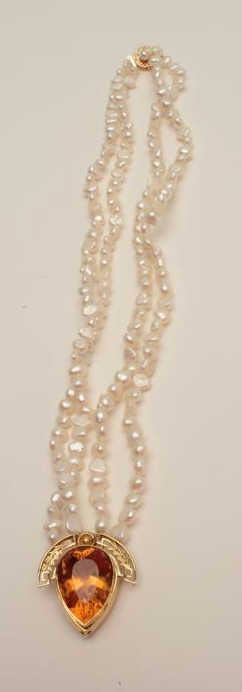 One 20 ct pear shape Madera citrine pendant in 18 k yellow gold in art deco style attached to a double strand Biwa pearl necklace. Est:$2,100-2,500