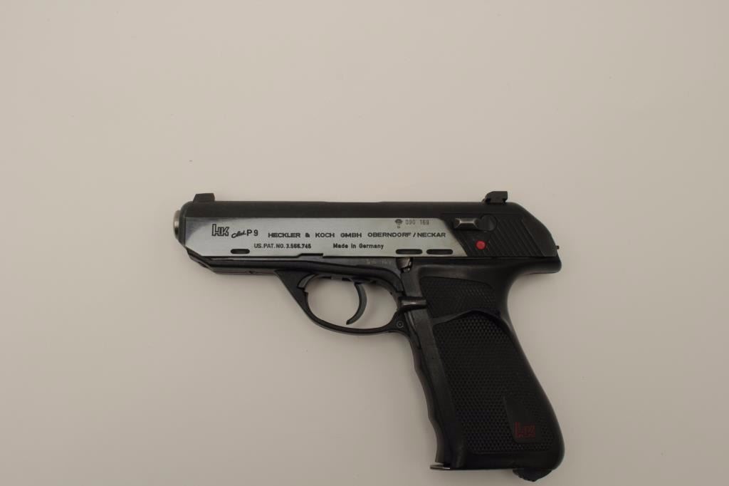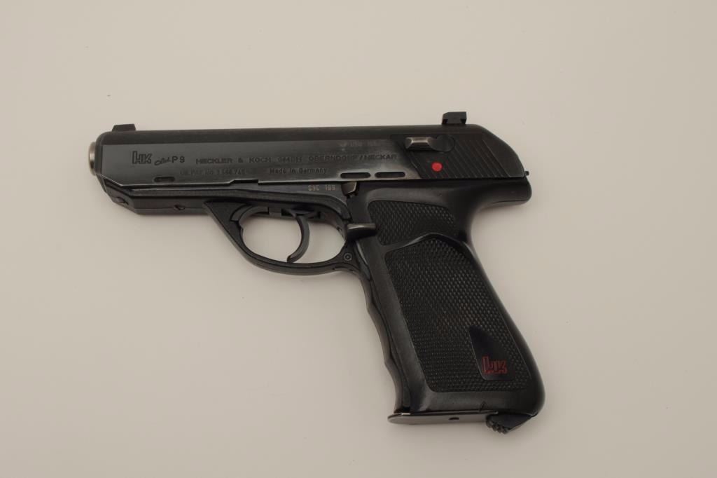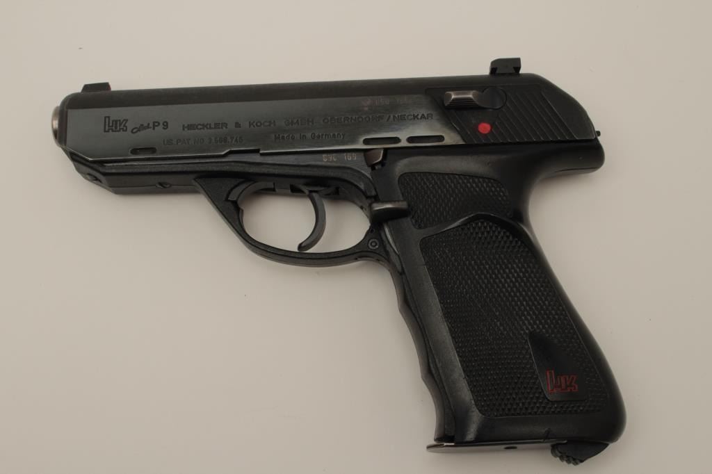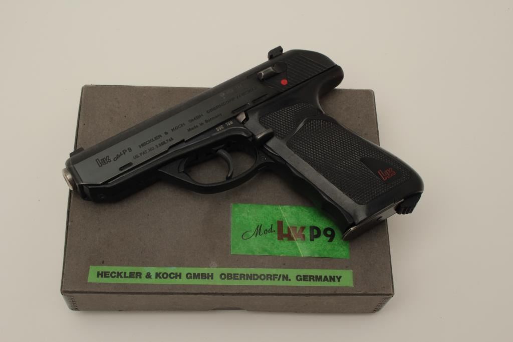 Lot 1536 Rare H&K P9 semi-auto pistol in 9mm, S/N 090169 in box with 2 mags. Only 485 produced in fine used