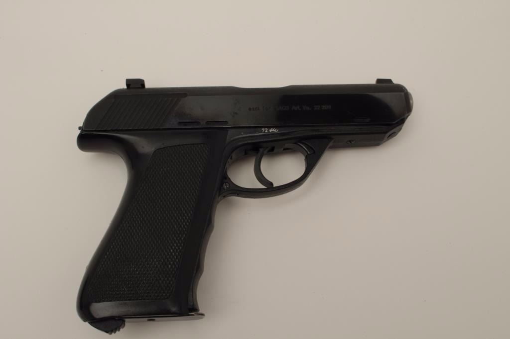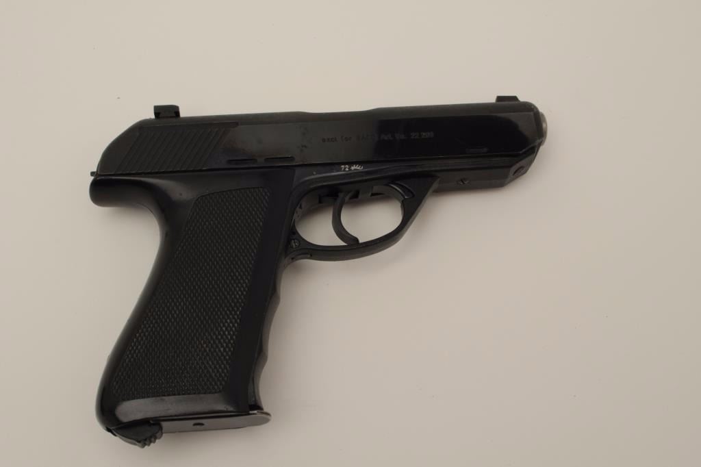 Rare H&K P9 semi-auto pistol in 9mm, S/N 090169 in box with 2 mags. Only 485 produced in fine used condition showing 96%-98% original blue with loss from holstering and use. Rarely offered and collectible.(Modern/PPT) Est.: $2000-$4000