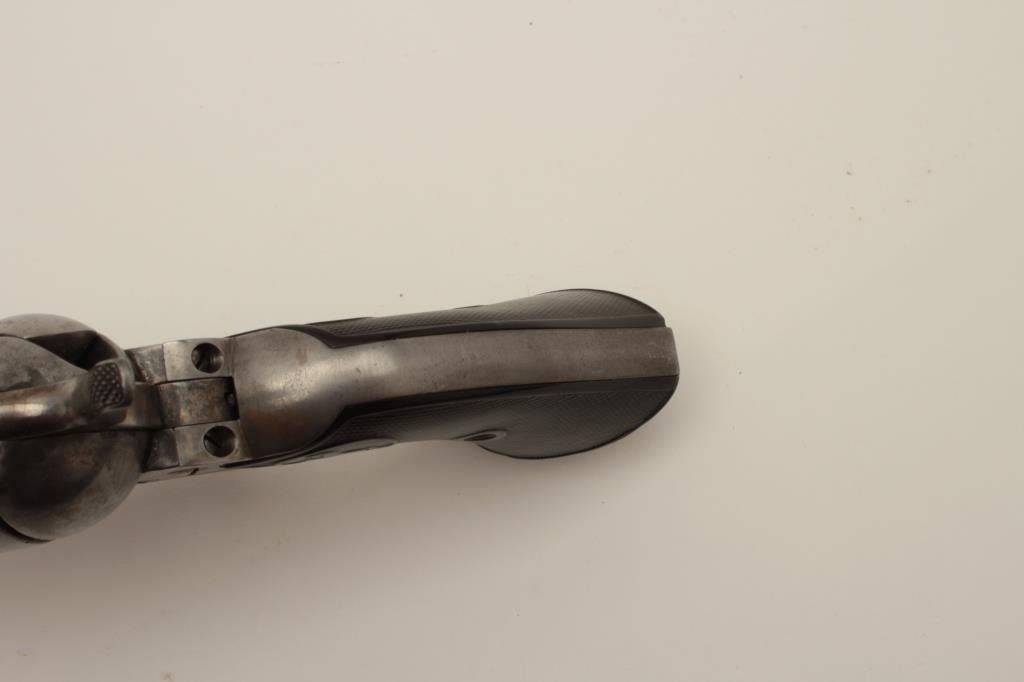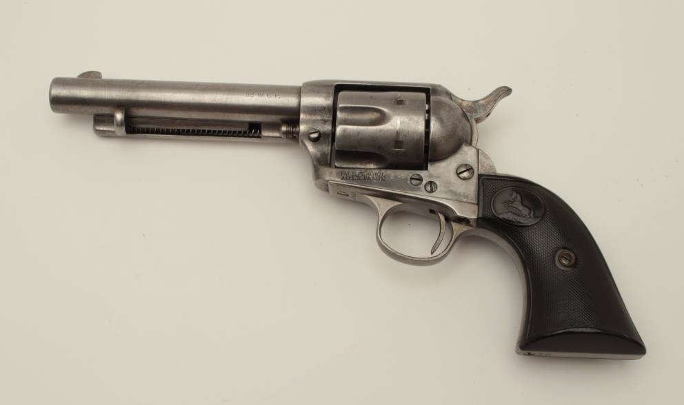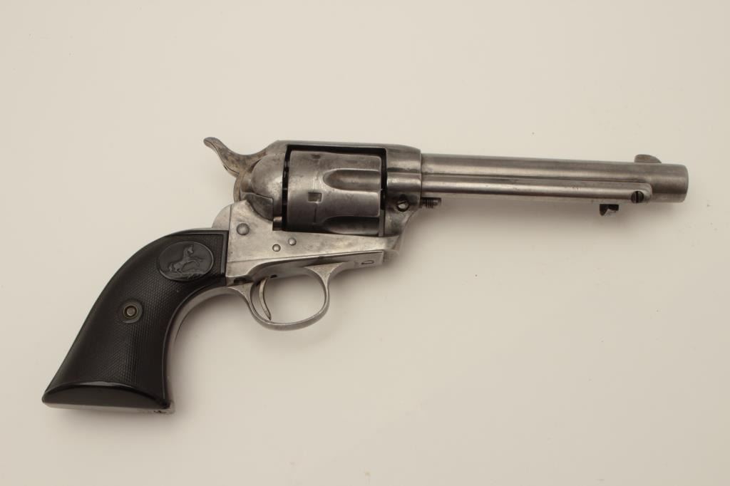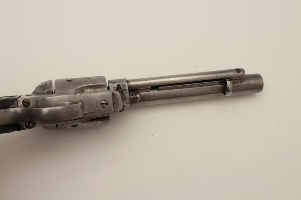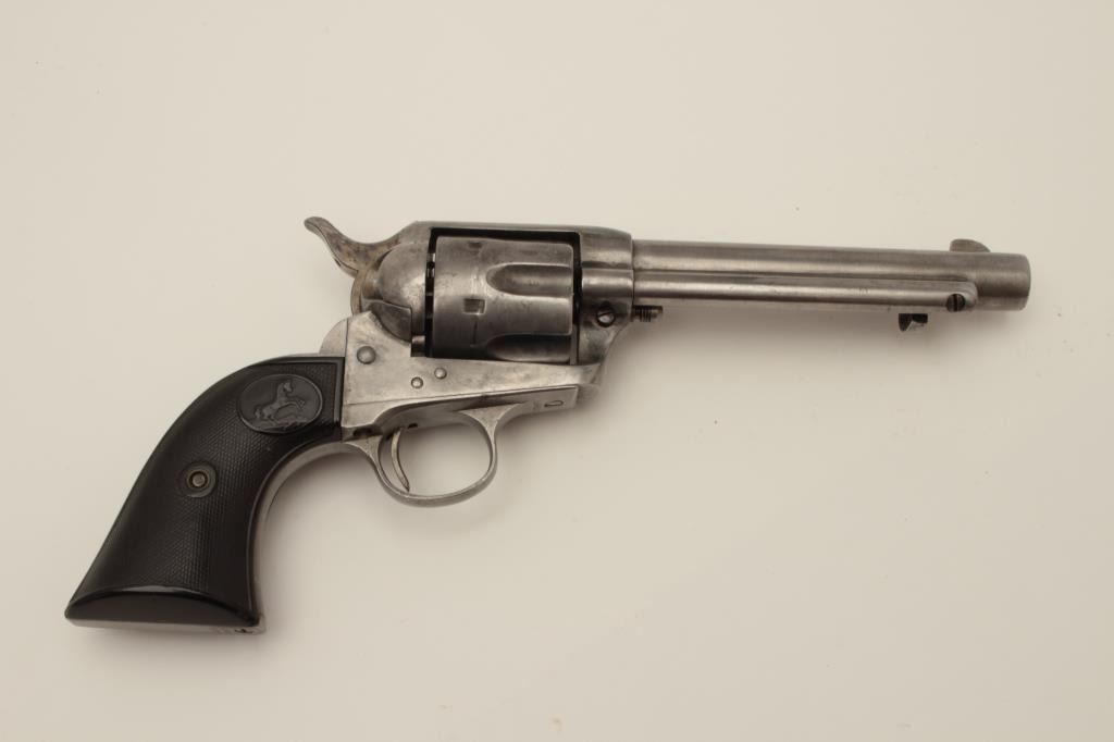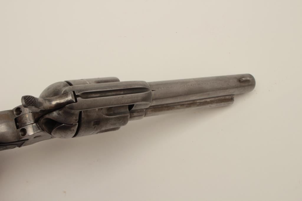 Colt SAA revolver in .32-20 caliber with a 5 ½” barrel, gray patina finish, hard rubber grips, S/N 196817 made 1899-1900. Light cleaning and polishing with good sharp markings. Wear to the high points andsmoothing from carry to grips. Good notches on the hammer and good bore. Main spring a little light or weak but working well. Made during western territorial era and may pull a good letter. (C&R) Est.: $1500-$3000