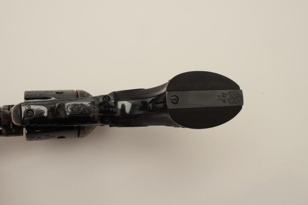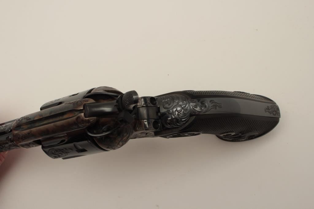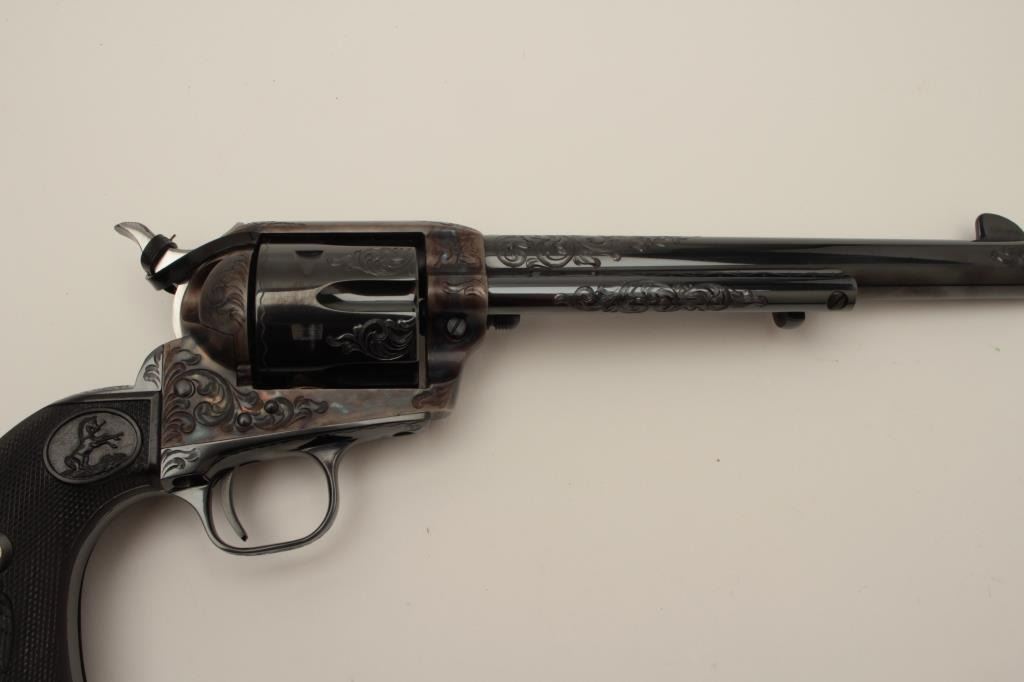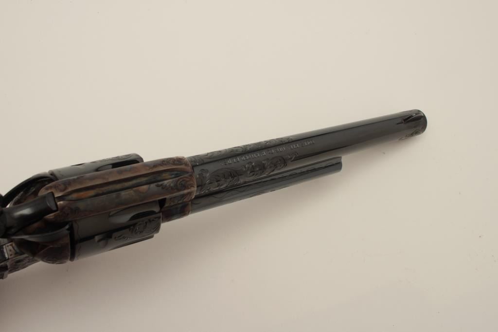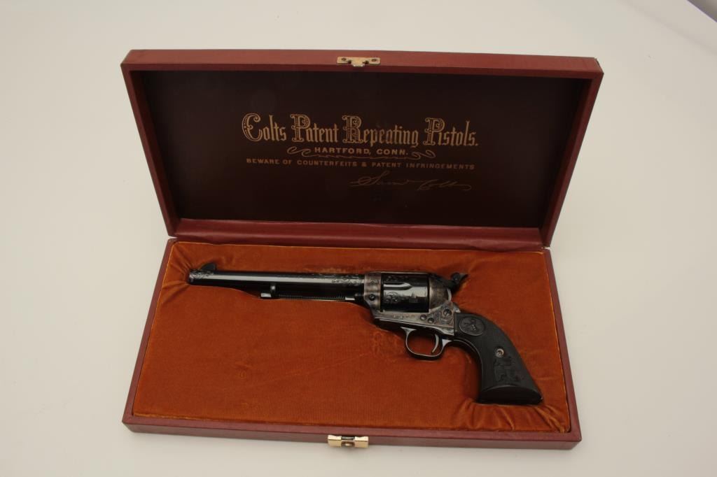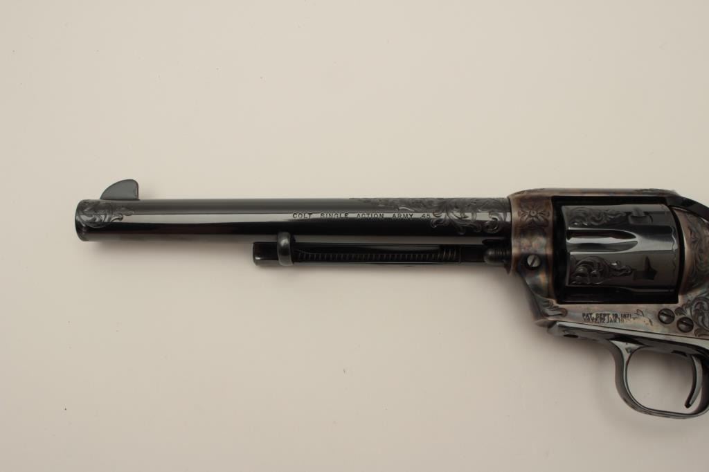 Colt SAA revolver in .45 long colt caliber with a 7 ½” barrel, factory “B” engraved, blue and case hardened finish, shipped Oct. 12, 1977 with 4 guns in shipment to order 10368. Excellent to new condition with noevidence of firing or use. No drag line (Kept tied down). In Colt custom workshop 1977 period case, S/N SA88604 early in third generation. Factory letter included. (Modern) Est.: $2500-$5000