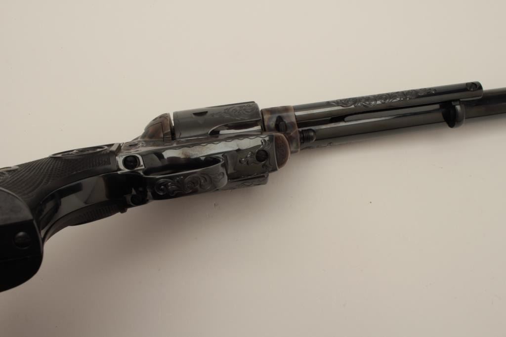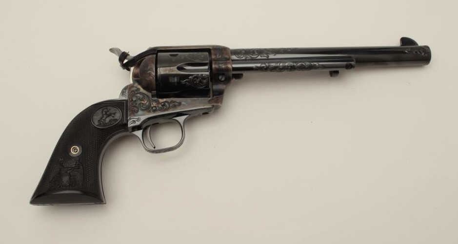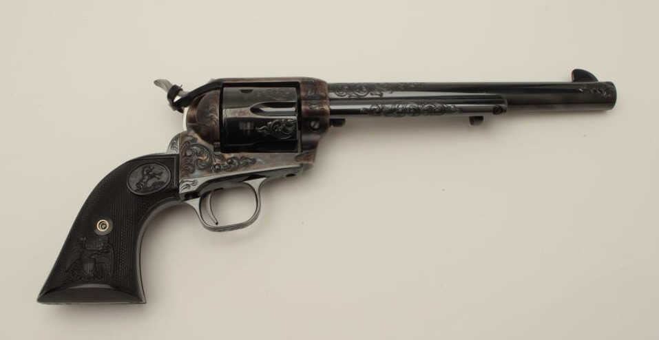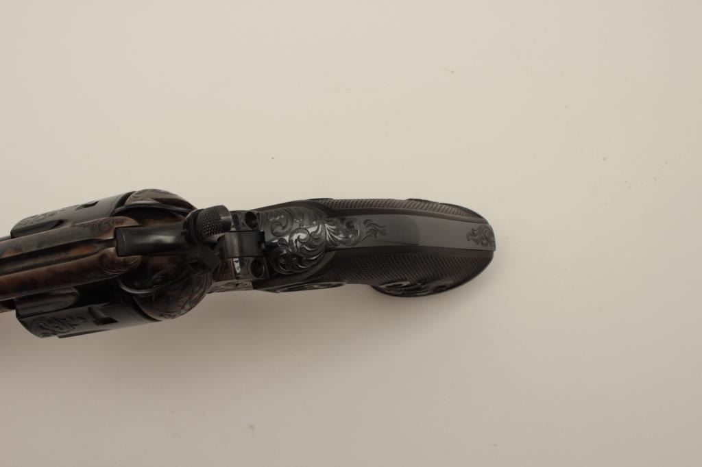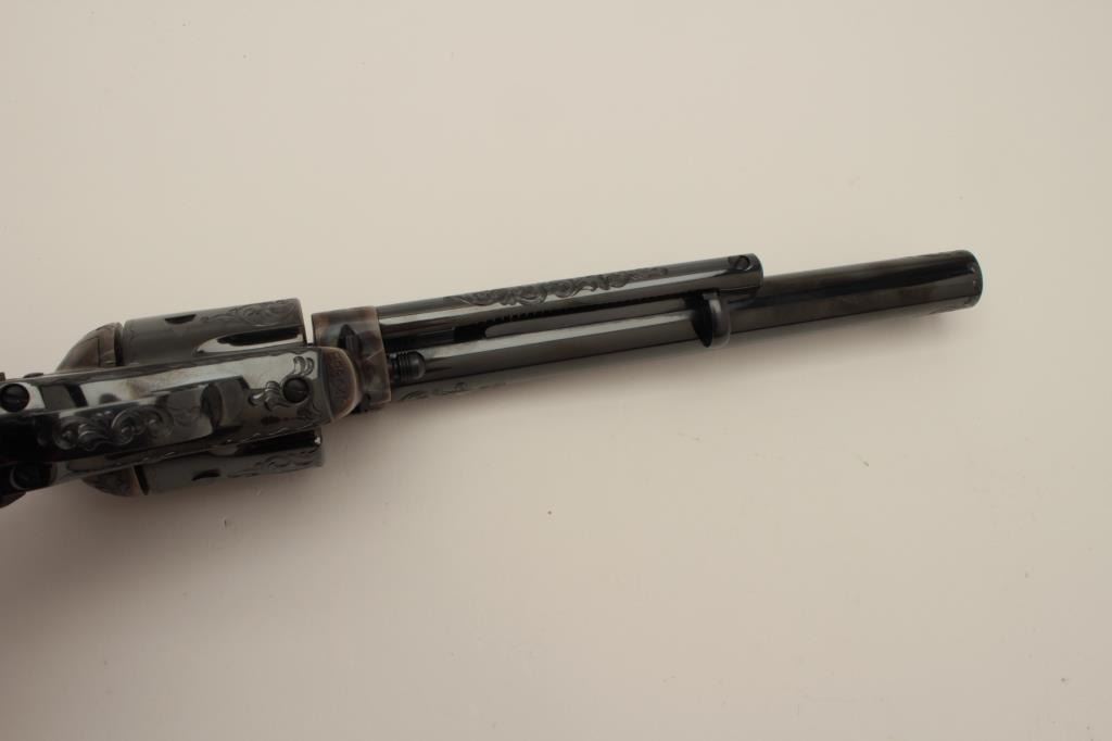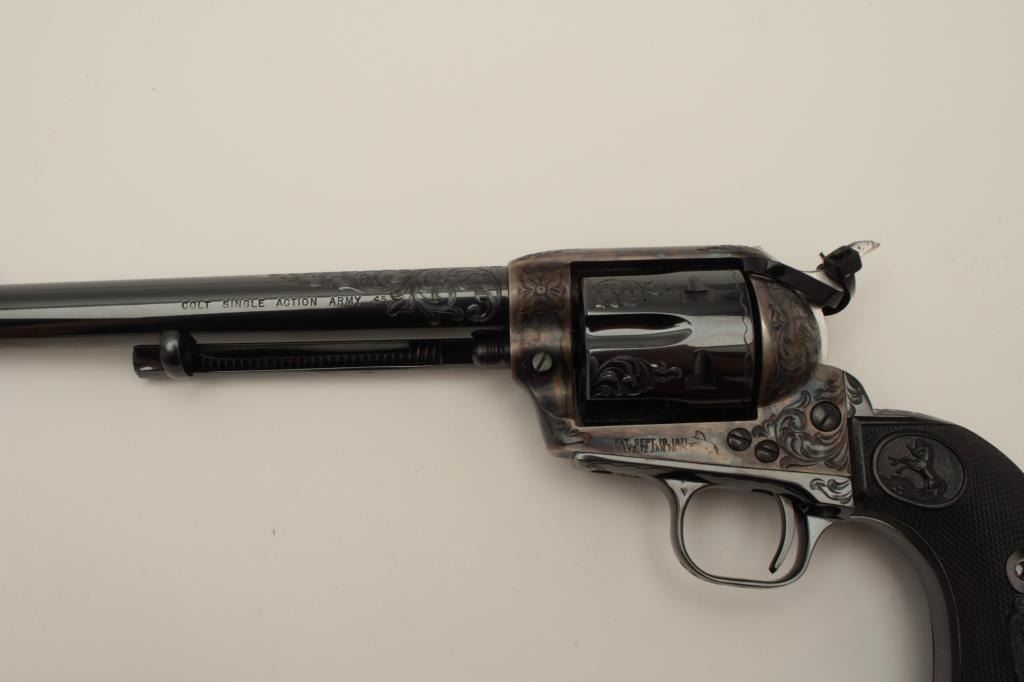 Colt SAA revolver in .45 long colt caliber with a 7 ½” barrel, factory “B” engraved, blue and case hardened finish, shipped Oct. 12, 1977 with 4 guns in shipment to order 10368. Excellent to new condition with noevidence of firing or use. No drag line (Kept tied down). In Colt custom workshop 1977 period case, S/N SA88604 early in third generation. Factory letter included. (Modern) Est.: $2500-$5000