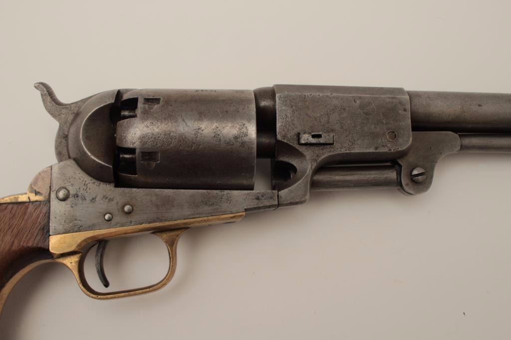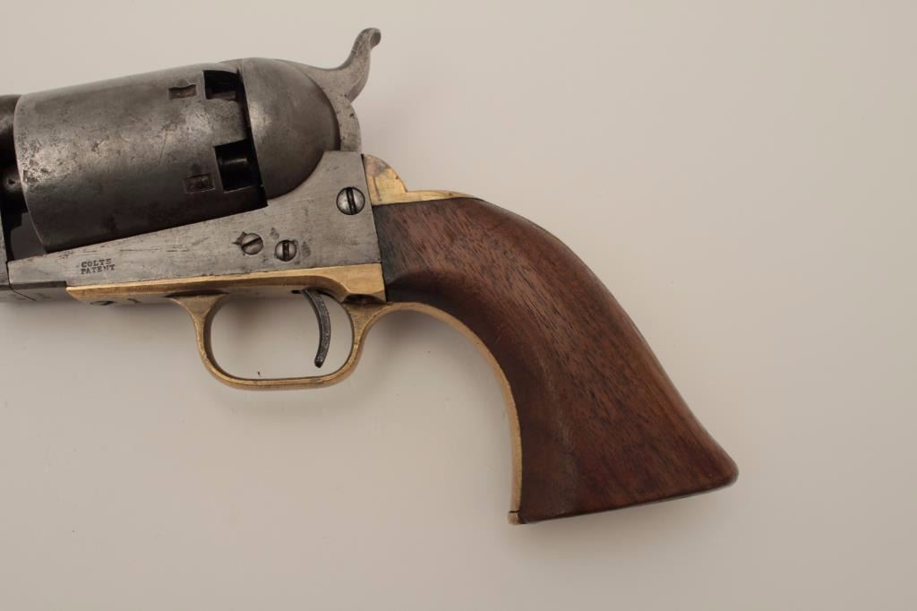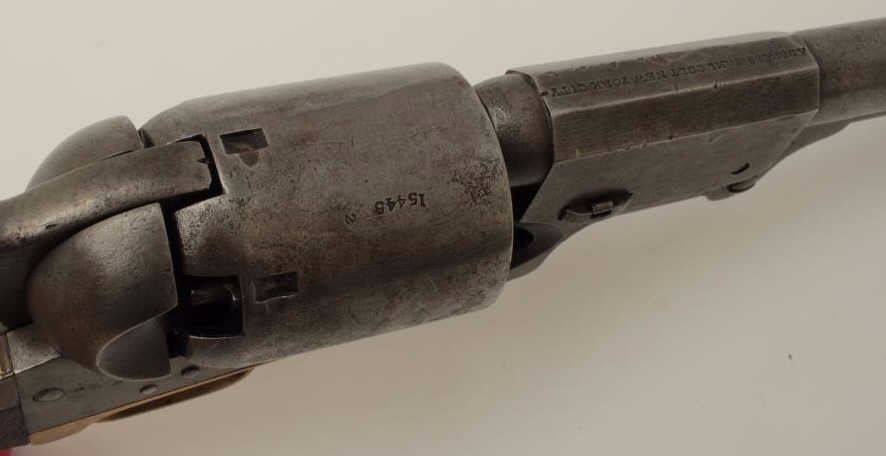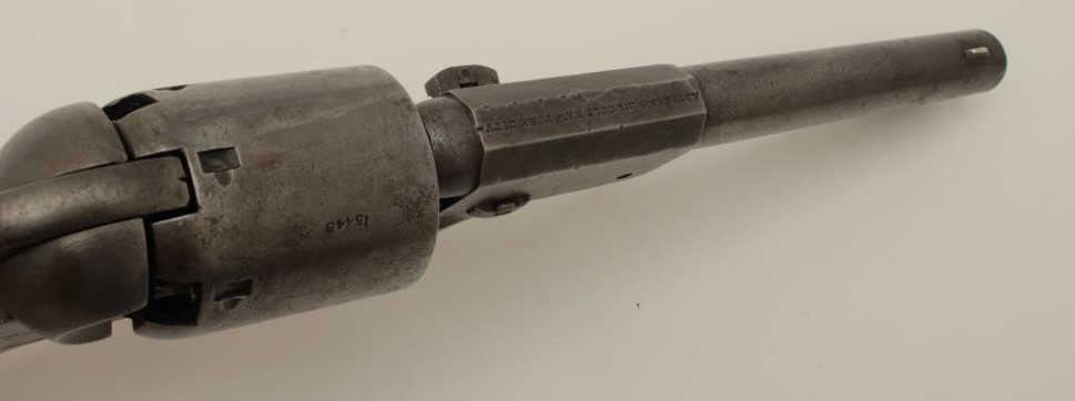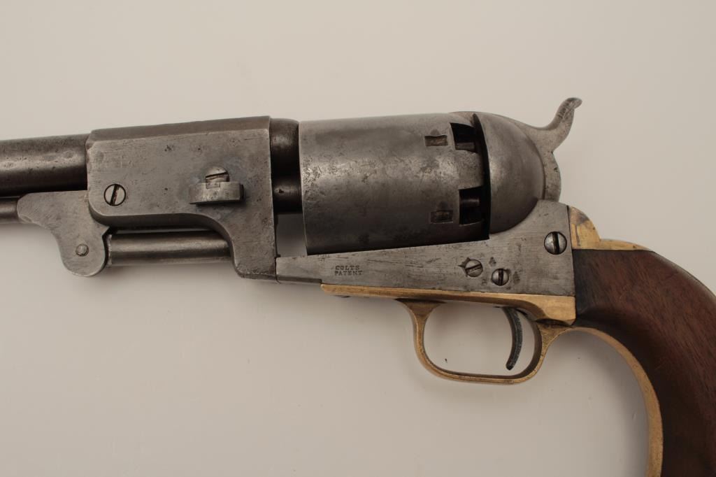 Colt 3rd Model Dragoon .44 caliber percussion in good condition, S/N 15445. Lightly cleaned metal surfaces that show some evidence of pitting around the frame and trigger screw particularly. Good barreladdress and patent markings. The grips show sanding and cleaning and the lever latch is replaced. Matching numbers and no cylinder scene remains. An acceptable Dragoon with minor restorations and cleaning. (Antique)Est.: $2500-$5000