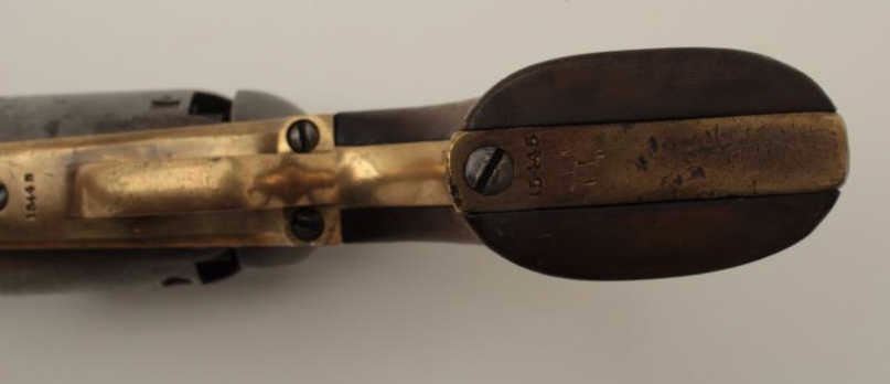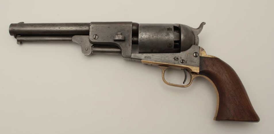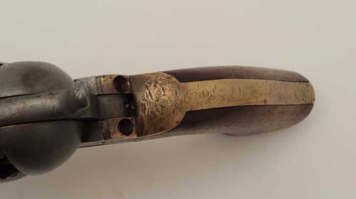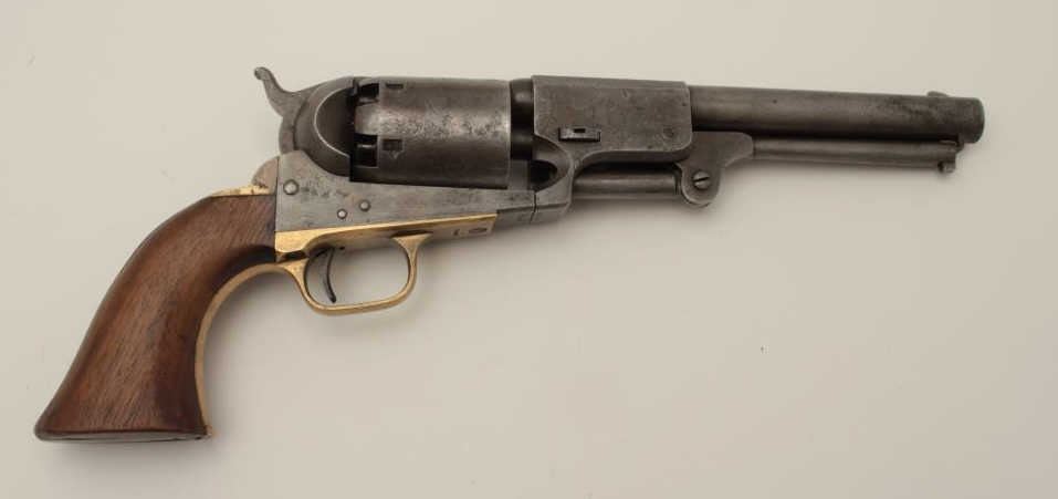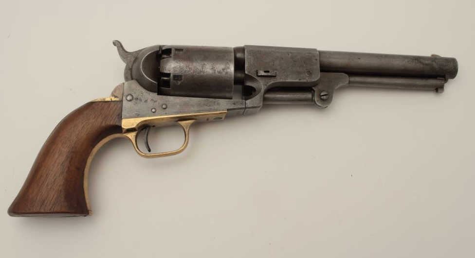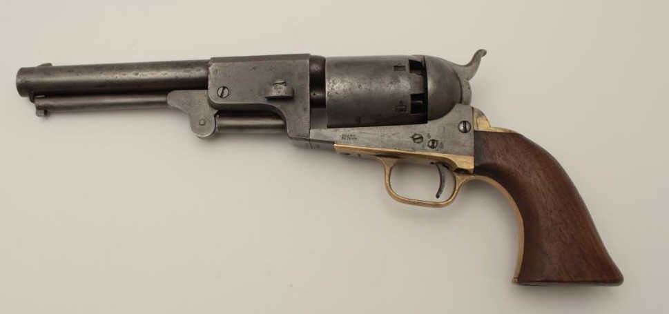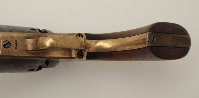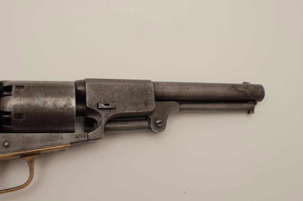 Colt 3rd Model Dragoon .44 caliber percussion in good condition, S/N 15445. Lightly cleaned metal surfaces that show some evidence of pitting around the frame and trigger screw particularly. Good barreladdress and patent markings. The grips show sanding and cleaning and the lever latch is replaced. Matching numbers and no cylinder scene remains. An acceptable Dragoon with minor restorations and cleaning. (Antique)Est.: $2500-$5000