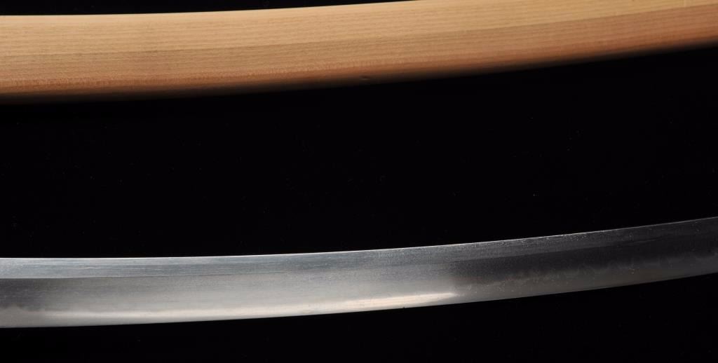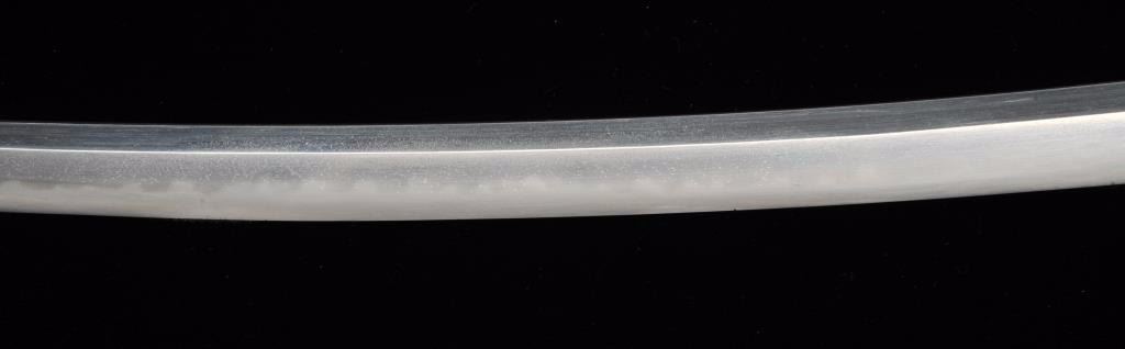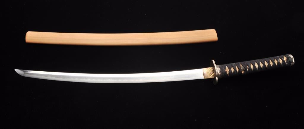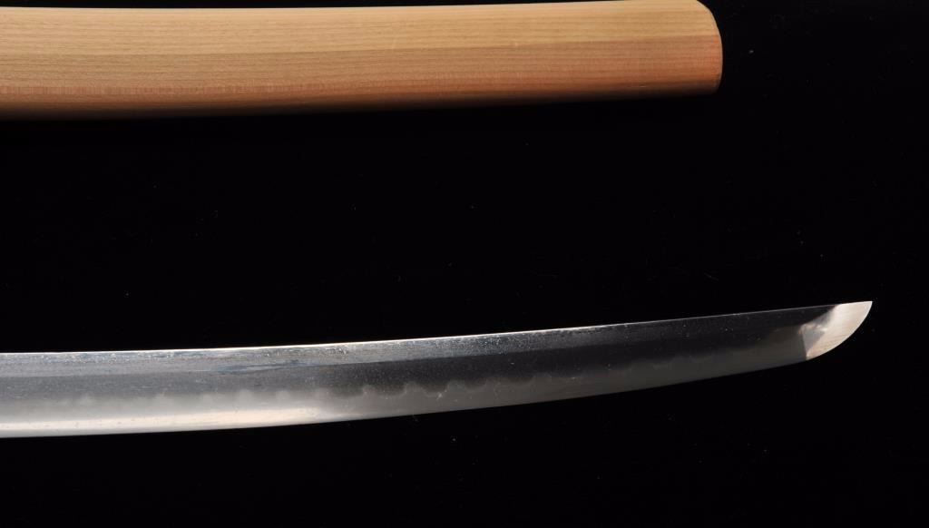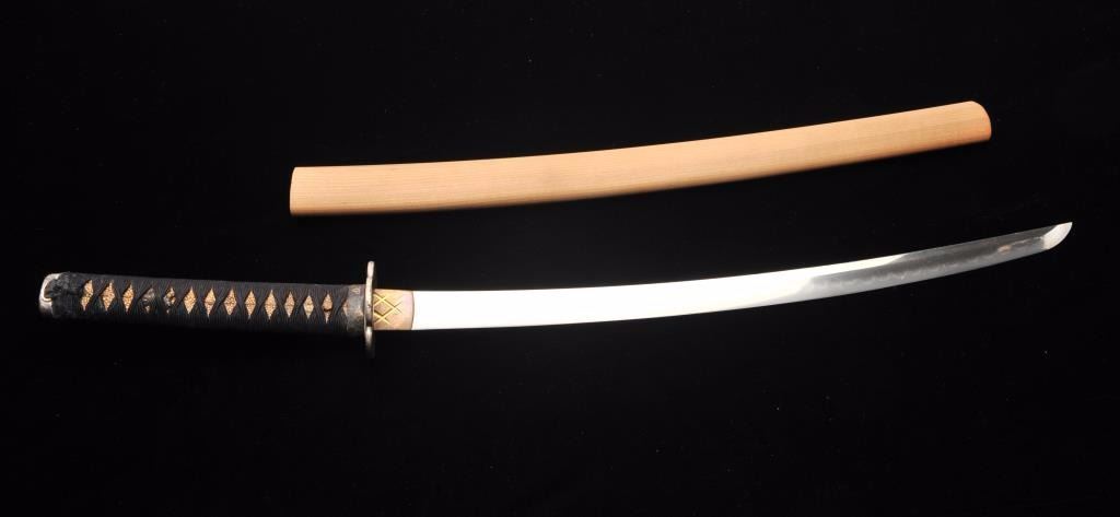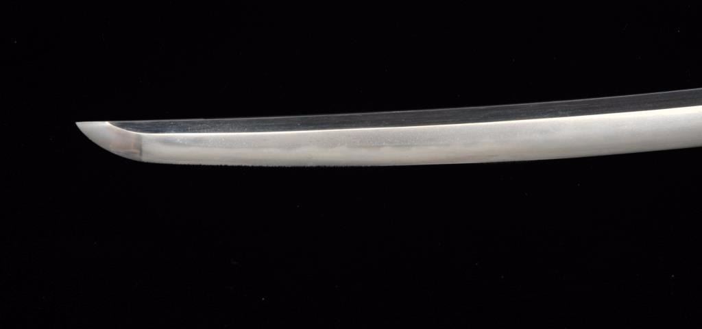 Koto period long wakasashi with a 20” blade signed with traditional mountings except blade resting in sira-siya (Storage case). The blade shows a fresh polish and fancy “Bumpy” temper line. Minor opening of grainand minute imperfections. Silver and brass tsuba and soft metal fittings well matched. Expertly re-wrapped grip. A quality blade. Est.: $600-$1200