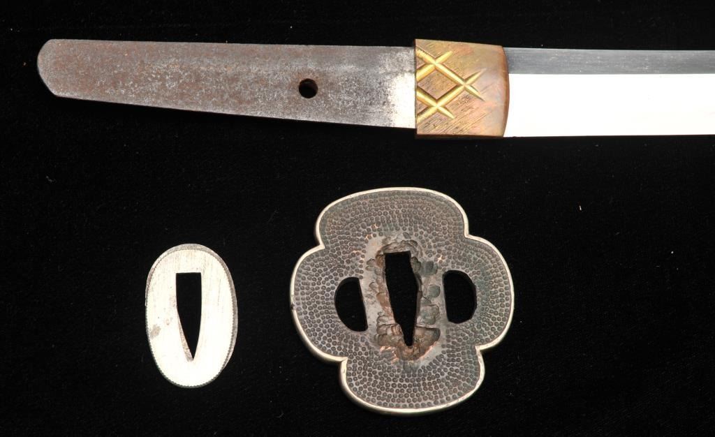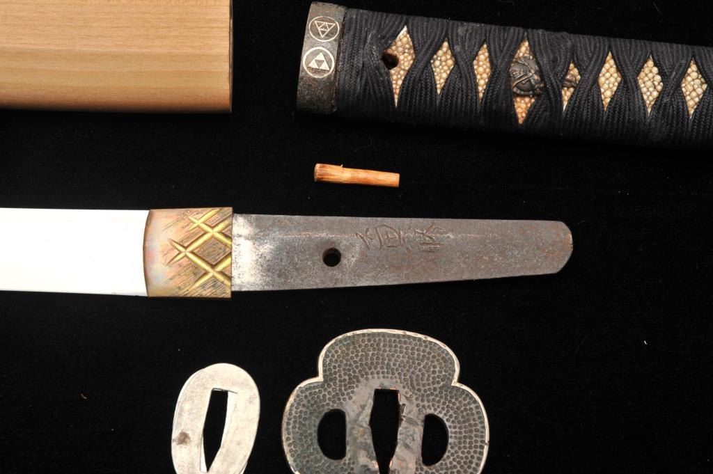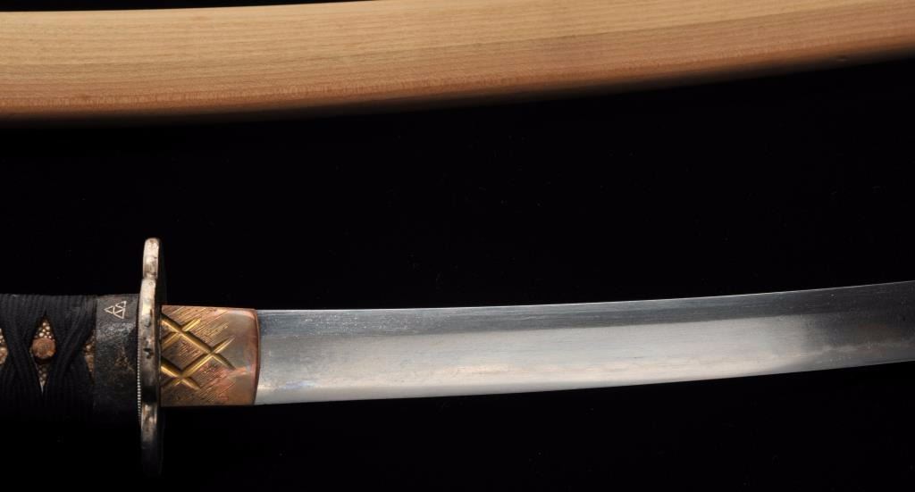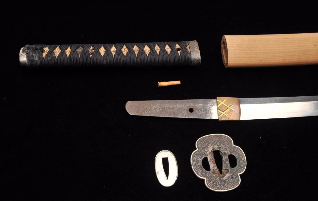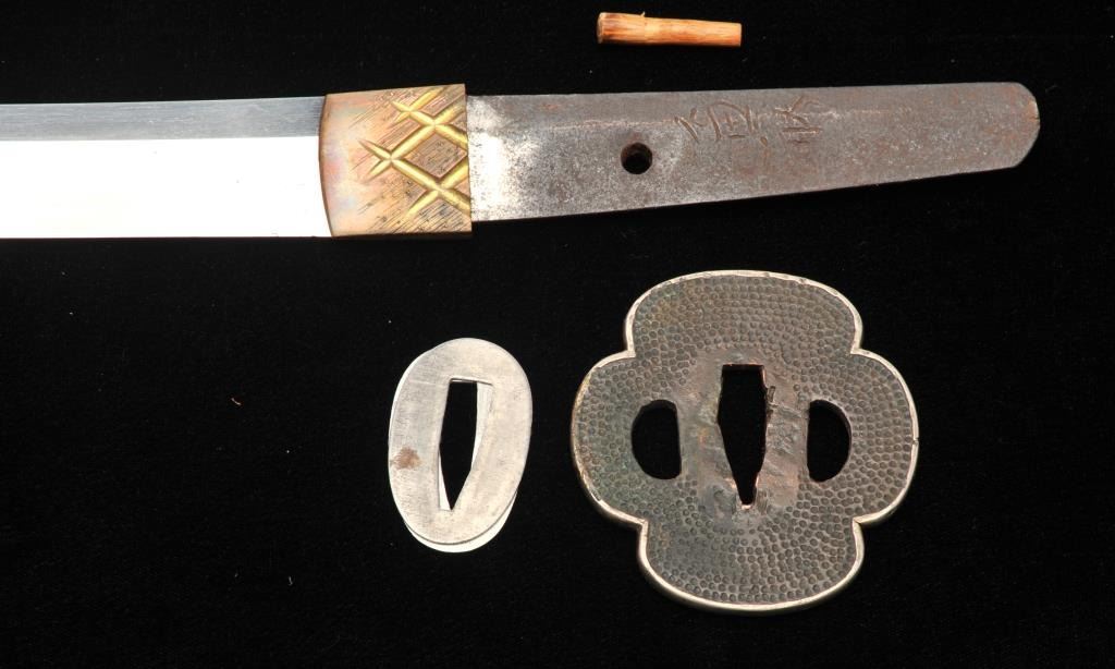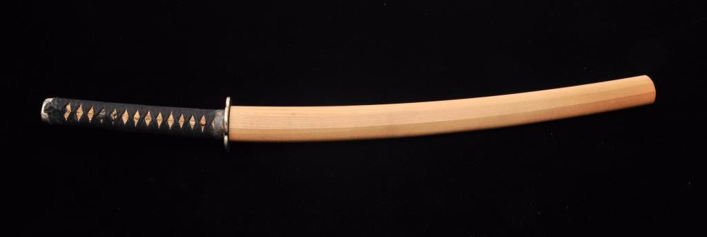 Lot 1553 Koto period long wakasashi with a 20” blade signed with traditional mountings except blade resting