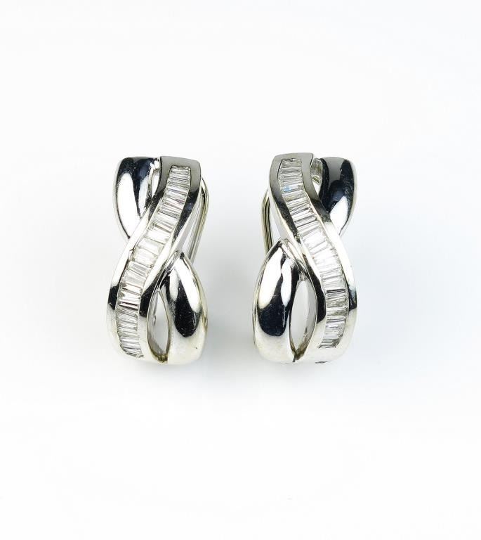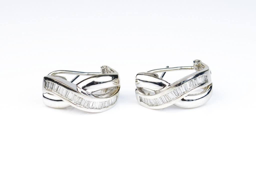 Extra fine ladies French clip back earrings channel with 48 baguette cut diamonds weighing approx. 1.20 carats of G-H colors and VS/SI clarity set in 14 karat white gold setting. Retail $2,500-$3,500 Estimates$1,500-$2,000 Nice