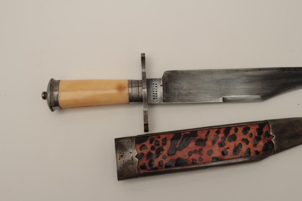 Very high quality clipped point bowie knife marked “Crookes and Clarke” circa 1860-1890. 7 7/8” well-made blade showing excellent grind and polish with faint original etching reading “La Muerta Antes, Que La Deshonra”which loosely translates to “Death Before Dishonor” and obviously made for Mexico or South American market. Well-made steel mounts with very nicely aged original grip. The original scabbard is retained and showssimulated turtle shell. The condition is very good plus to almost fine and 12 ¼” overall. Est.: $1750-$3500