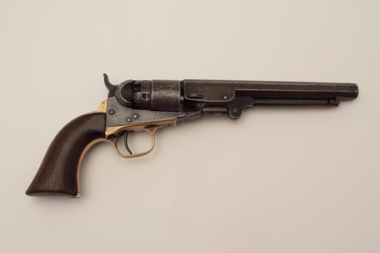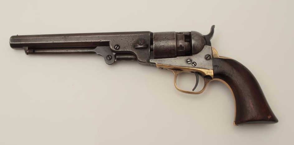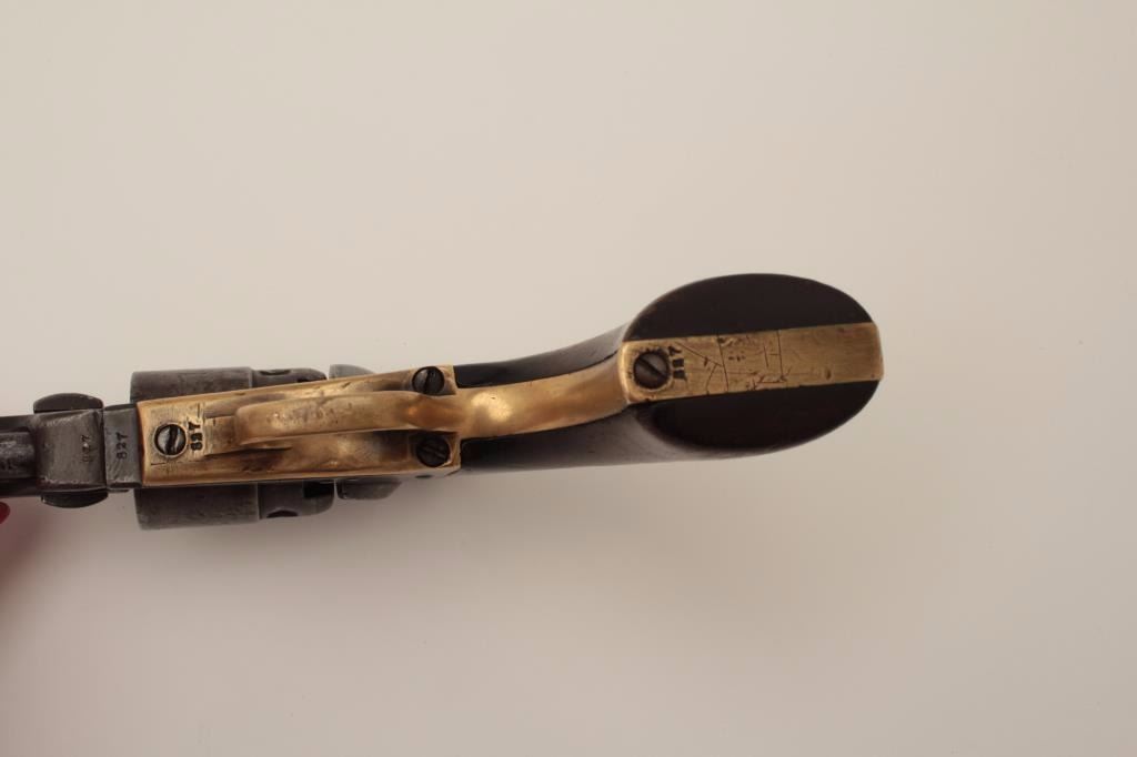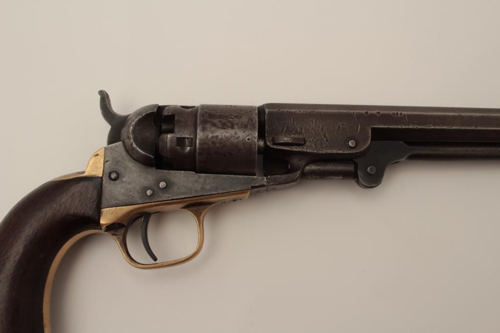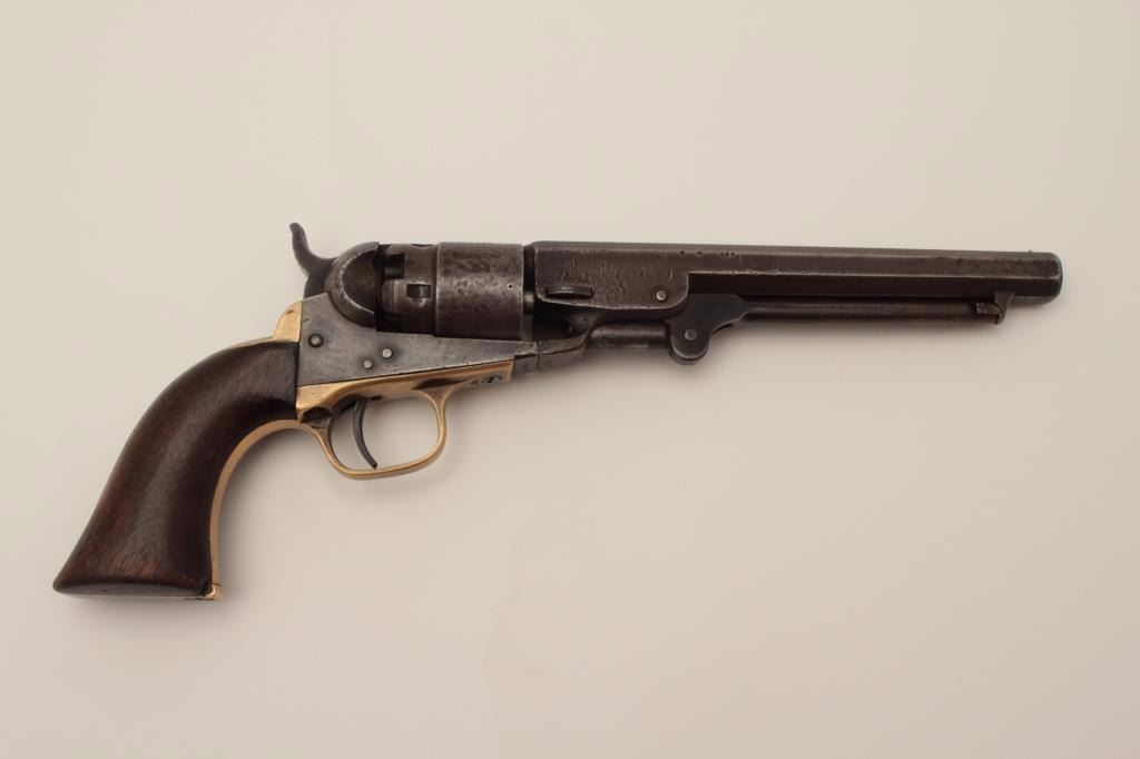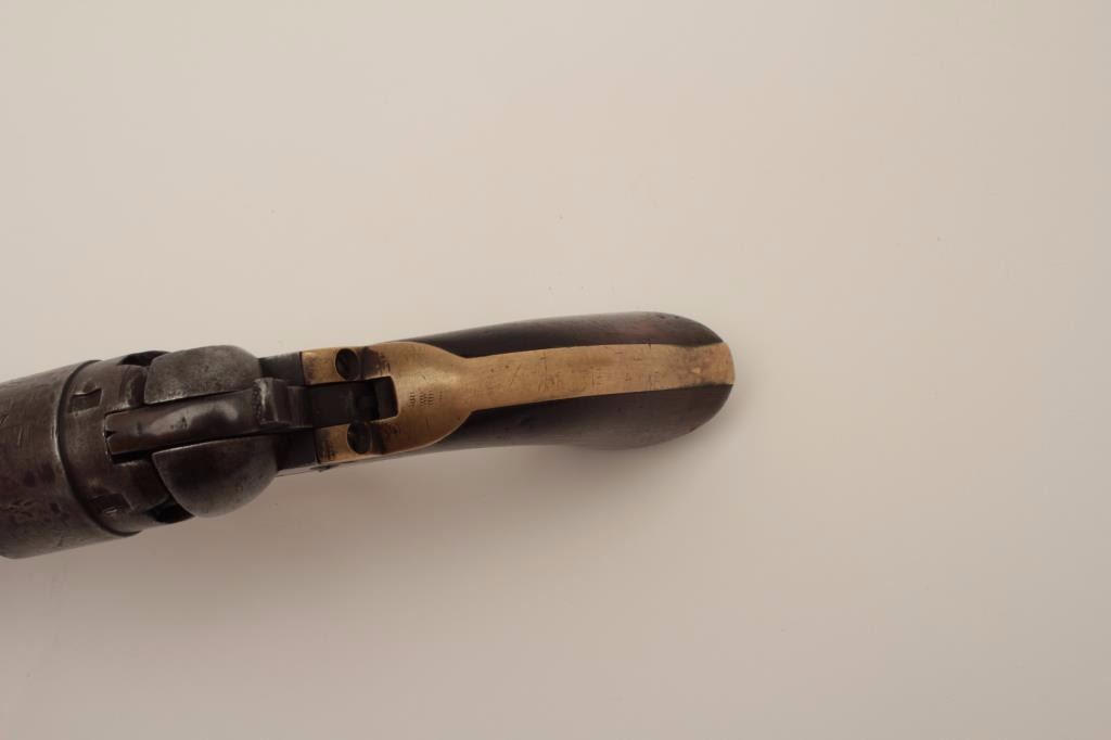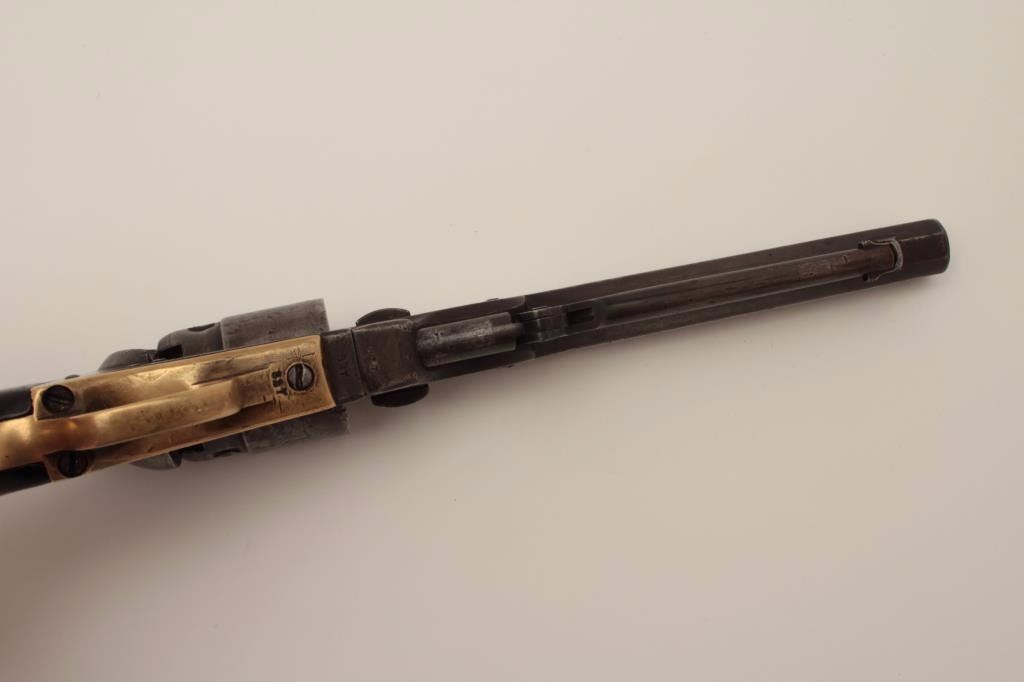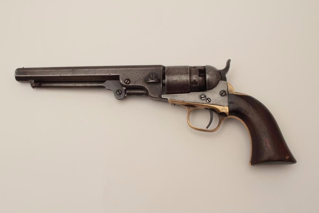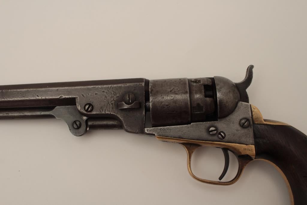 Colt Pocket Model of Navy caliber in .36 percussion with a 6 ½” barrel, S/N 827 and made during the Civil War showing a patina finish with faint visible traces of blue and case mixed in brown/gray. The address andpatent markings are good. Traces of cylinder scene and there are dings and dents on the cylinder. The loading lever shows restoration. The grips are very good and all matching visible serial numbers. H.R.scratches on the butt. The action works well and tight. Hard to find with a 6 ½” barrel and an early serial number. (Antique) Est.: $750-$1500