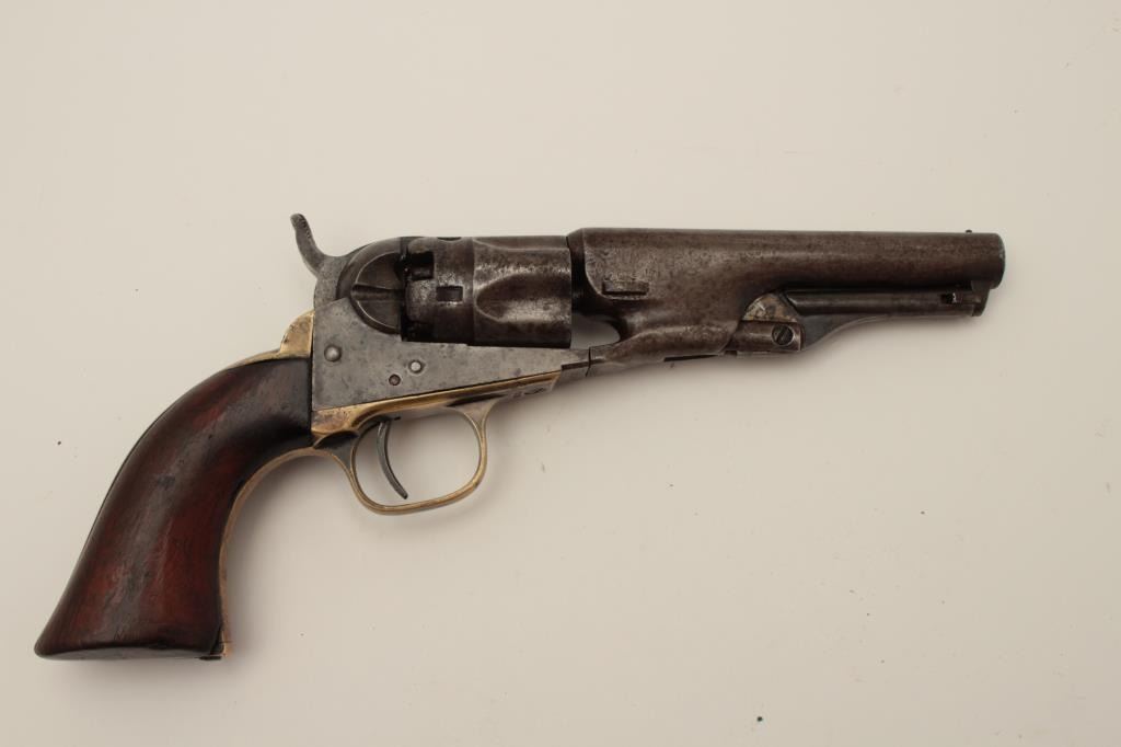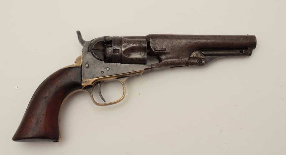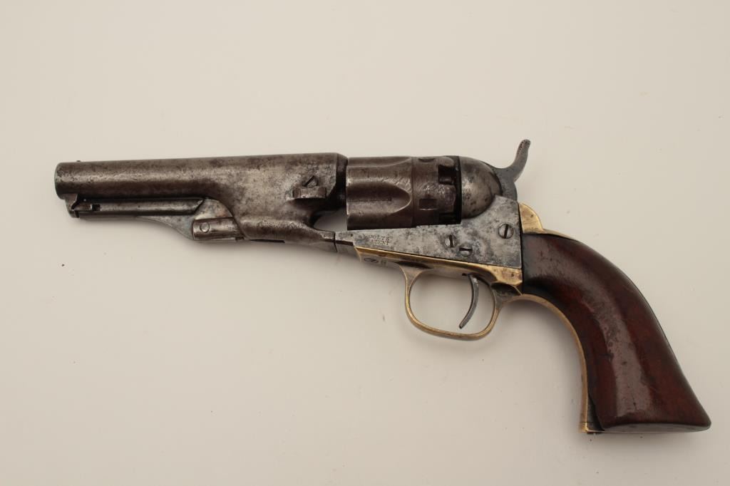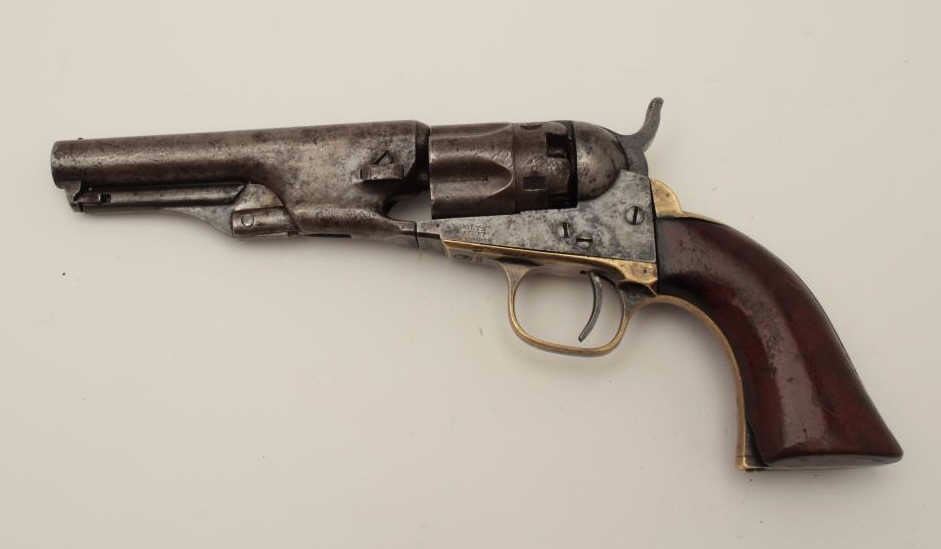 Colt 1862 Police with a 4 ½” barrel in .36 caliber percussion, S/N 3033 showing early New York address and in overall good condition with a gray patina and faint hints of finish within the patina along with lightscattered pitting. Good markings and all matching visible serial numbers. Very good grips with 50% plus varnish and small losses to each toe. Brand or symbol lightly scratched in buttstrap (small). Traces ofsilver plate. The action is working but not locking up. (Antique) Est.: $800-$1600