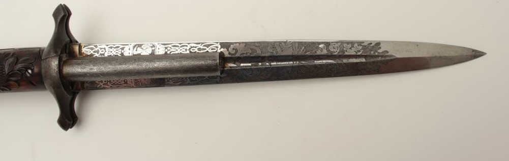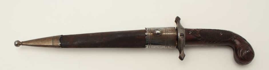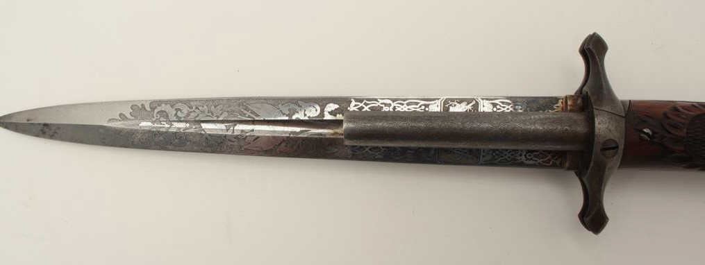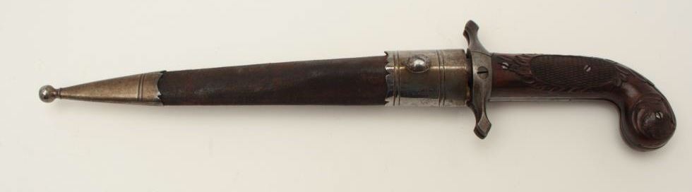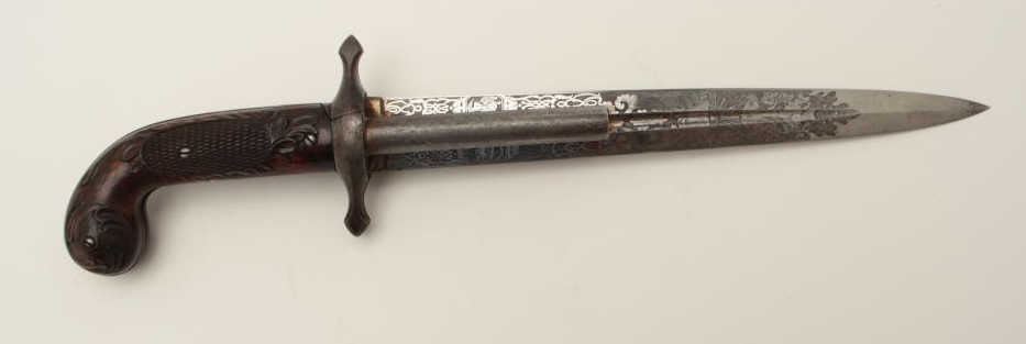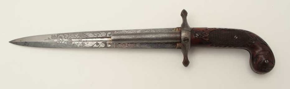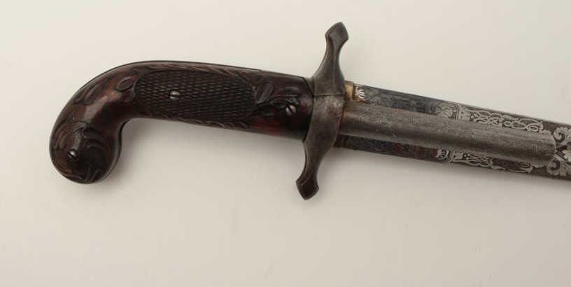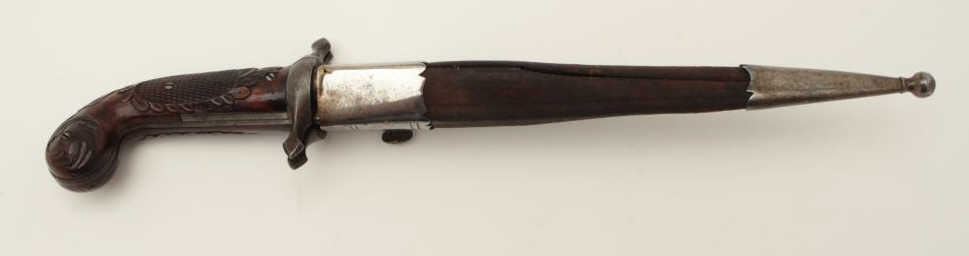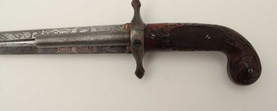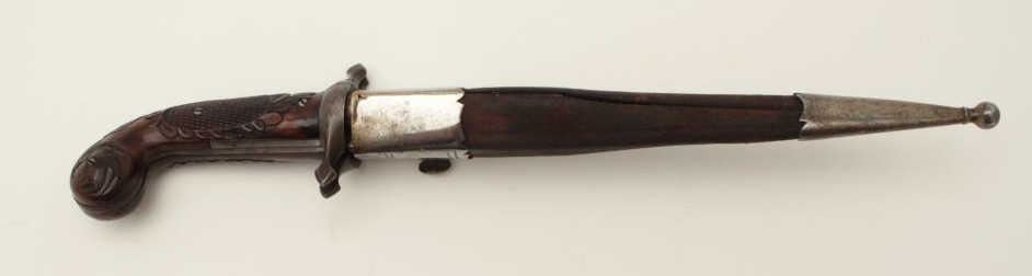 Dumonthier style French percussion double barrel pistol showing ornately etched blade with rose pattern Damascus on blade and pistol barrels. The only known specimen decorated in this fashion. Also ornatelycarved and checkered deluxe wood stocks and retaining original scabbard. The pistol measures 13 ¾” overall with a 9 ½” blade. The barrels measure 3 3/8” and approximately .36 caliber rifled. The pistol is near fine with excellent blade. The scabbard is good to very good with opening to the seam on one side. An outstanding oddity. Est.: $4,000-$8,000