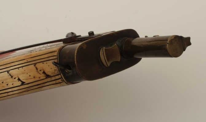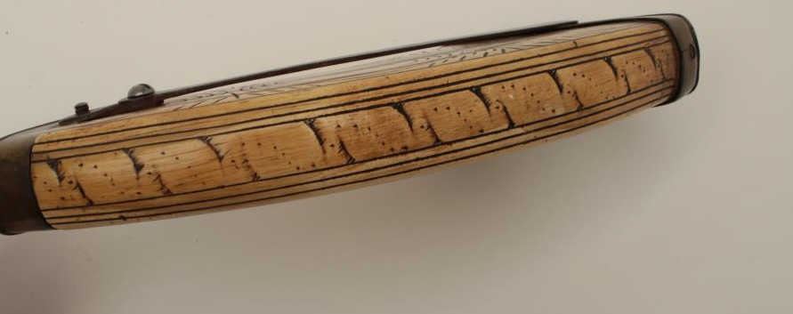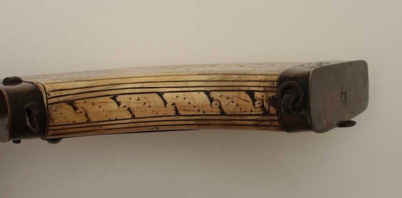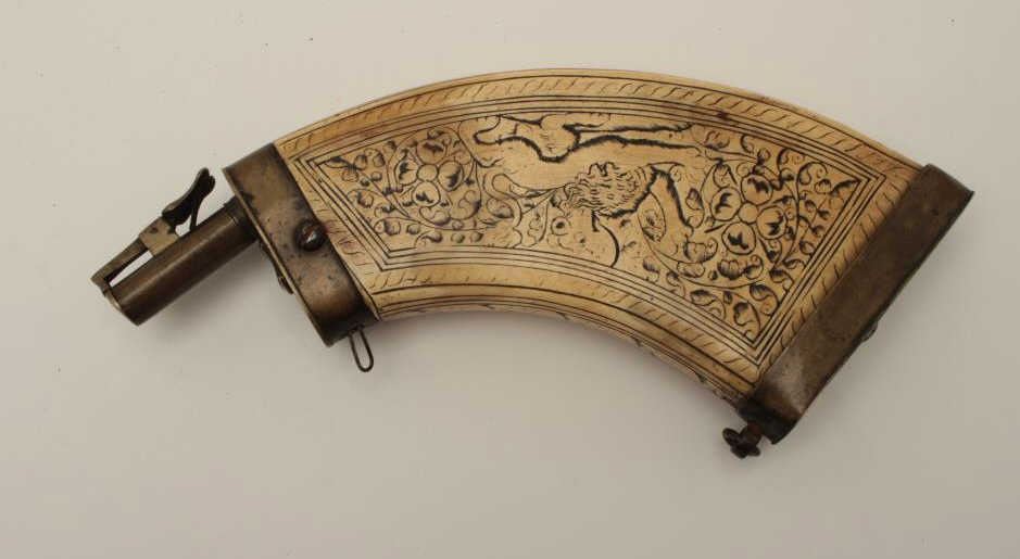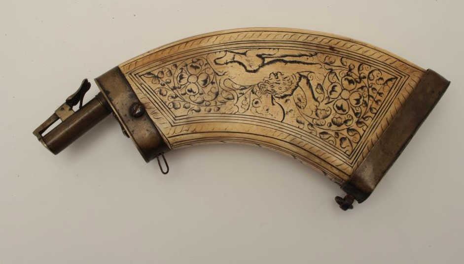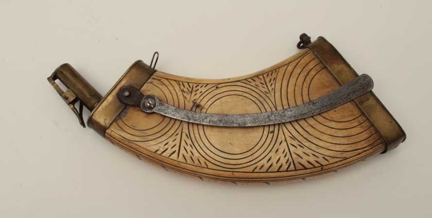 Lot 1588 Wheelock powder flask of flattened and carved cow horn originally made in 16th-17th century and re