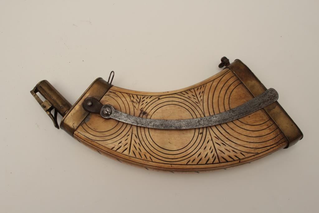 Wheelock powder flask of flattened and carved cow horn originally made in 16th-17th century and remounted in brass during the 19th century showing slight reduction in size. The body is now 8” and was 9” plus. The original iron belt hook is retained. It is our theory that the iron mounts were rusted an obsolete so owner had a smith fashion brass mounting with spring charger for fowling piece during the 19th century. Thecondition is very good plus and an interesting flask that may well have traveled to colonies where nothing in the way of guns or accessories were wasted and often recycled and upgraded to newer options.(Antique) Est.: $600-$1200
