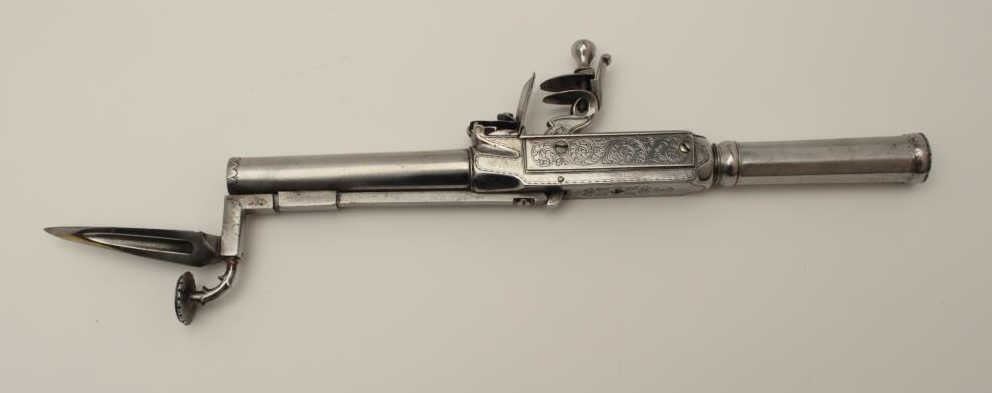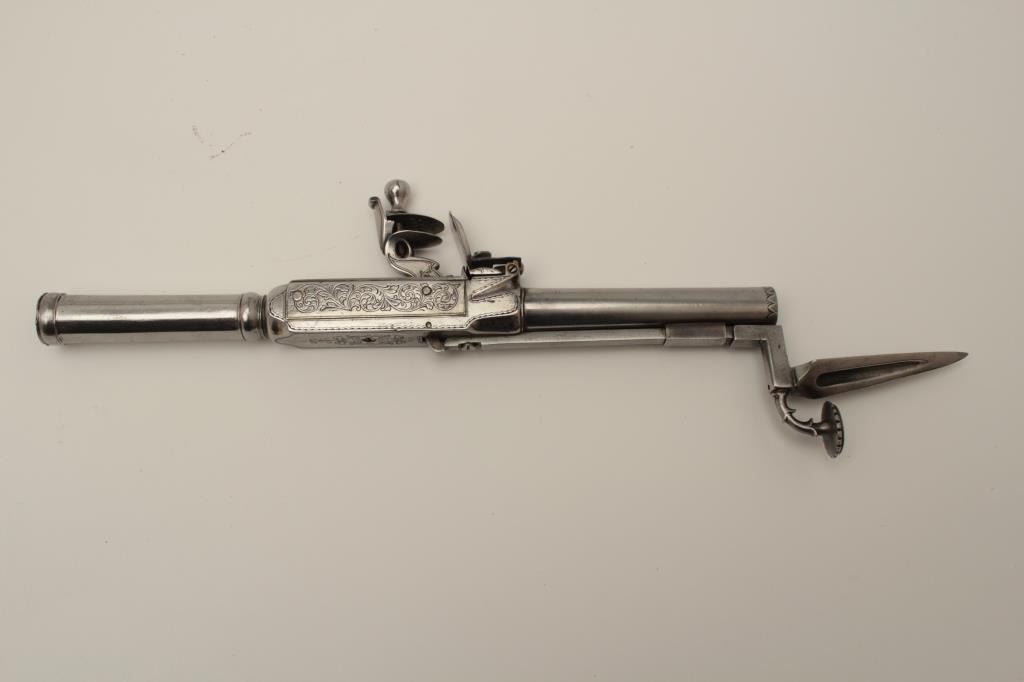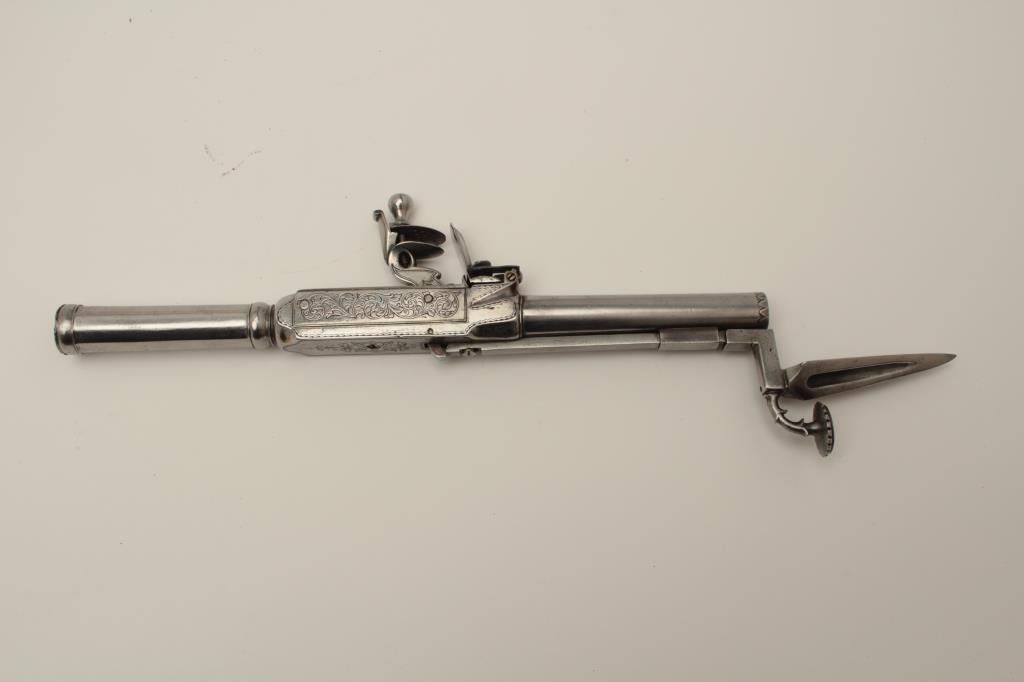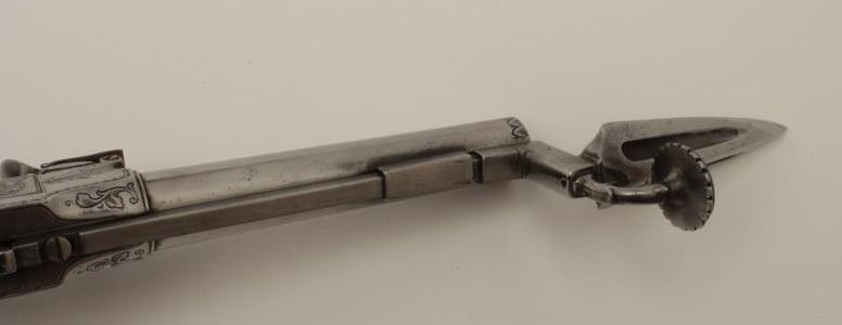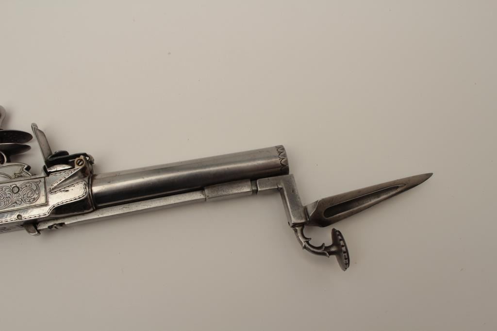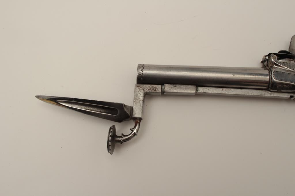 Flintlock oddity game killer made to attach to lance or pole and fired when stabbed into prey. Probably designed for boar. The weapon measures approximately 15 ½” with a 3” long and thick reinforced piercing blade showingcenter hammer with scroll engraving. Fine to near excellent condition. Est.: $1750-$3500