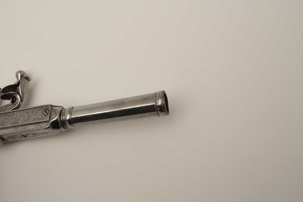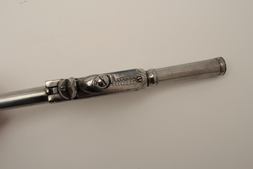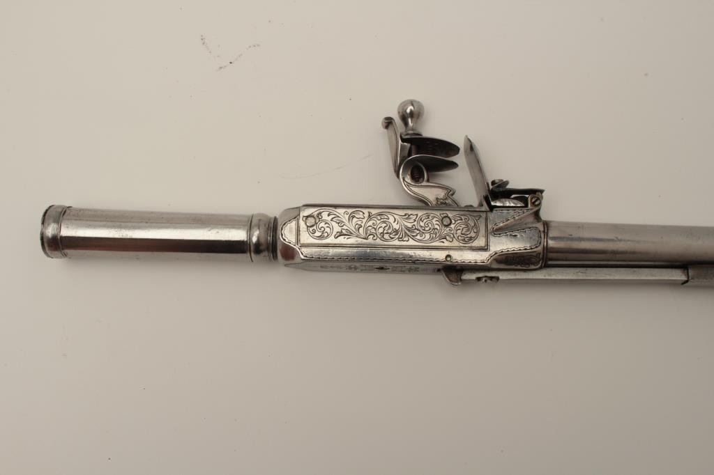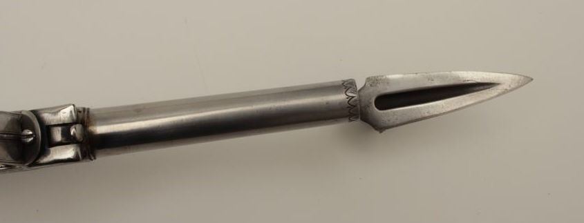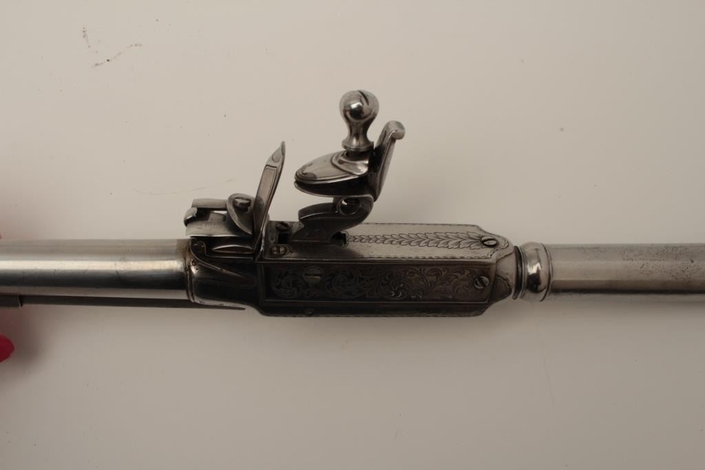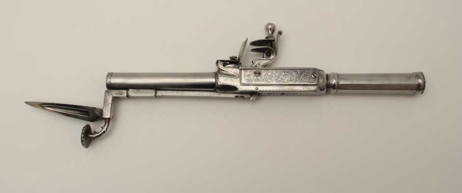 Flintlock oddity game killer made to attach to lance or pole and fired when stabbed into prey. Probably designed for boar. The weapon measures approximately 15 ½” with a 3” long and thick reinforced piercing blade showingcenter hammer with scroll engraving. Fine to near excellent condition. Est.: $1750-$3500