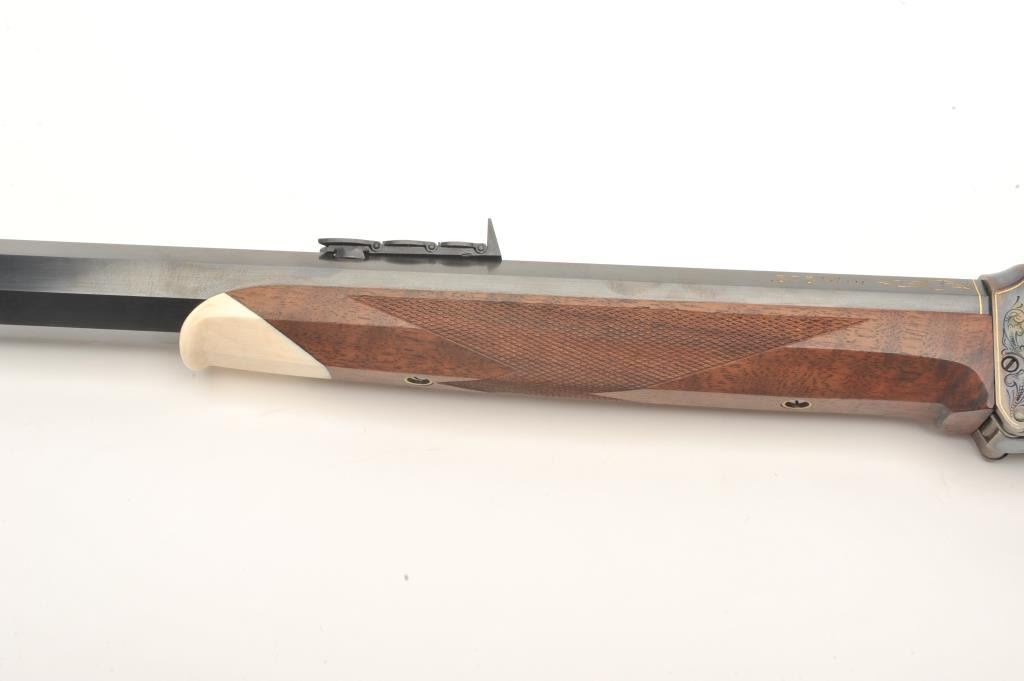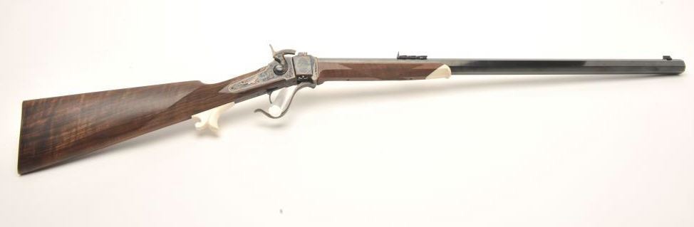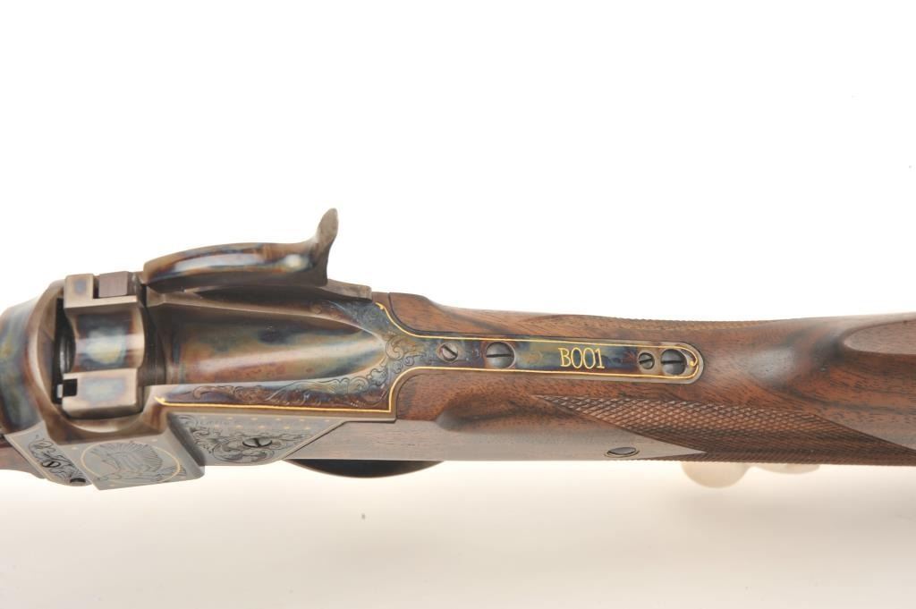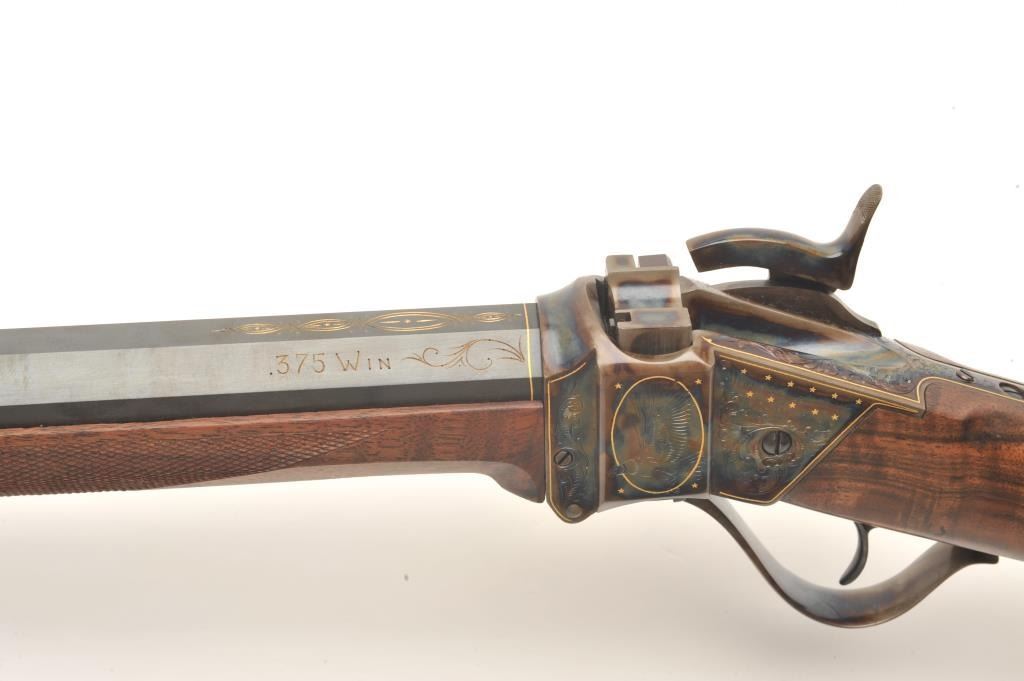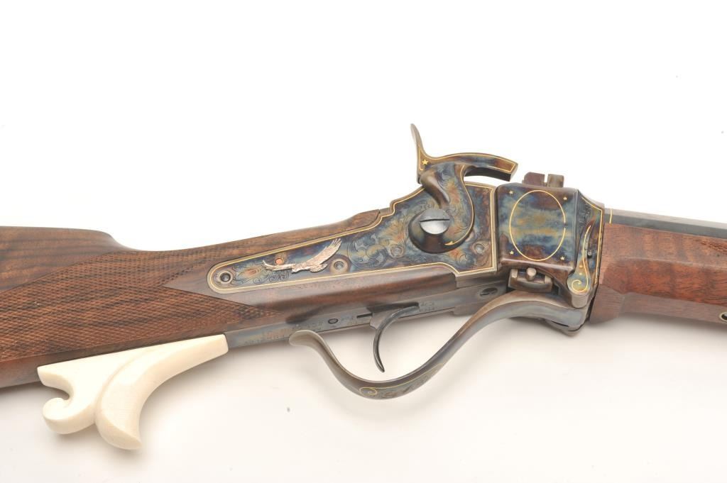 1 of a kind custom Sharps style rifle made for Safari Club fund raising event. Marked “Lil Reliable” on the barrel in .375 Winchester (Big Bore 94 is same caliber not Holland & Holland magnum). Marked on thebottom of the tang “Made by Ron Otto & Aaron Pugsley for S.C.I. 06” and S/N B001. 26” octagon barrel of medium to slightly heavy weight and 42 ½” overall. The barrel measures 1 1/16” across flats. The rifle is handengraved with scroll and game scenes burdened in gold with silver overlay of eagle at the rear of the lock plate. The action is marked “Little Sharps Mfg. Co., Big Sandy Montana” on left rear of action. Select wood checkered stock showing ornate bullet trap with engraved cover and also a raised silver overlay of standing bear. Ivory fore end cap and pistol grip. Retaining all of its original royal blue and vibrant case colors.Almost mint 99.9%. Slight handling only with no evidence of firing or use. Compare at $12,000 plus. Est.: $6,000-$12,000