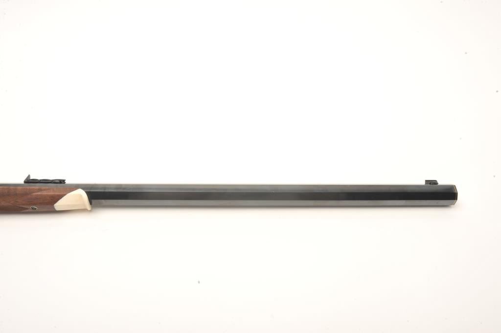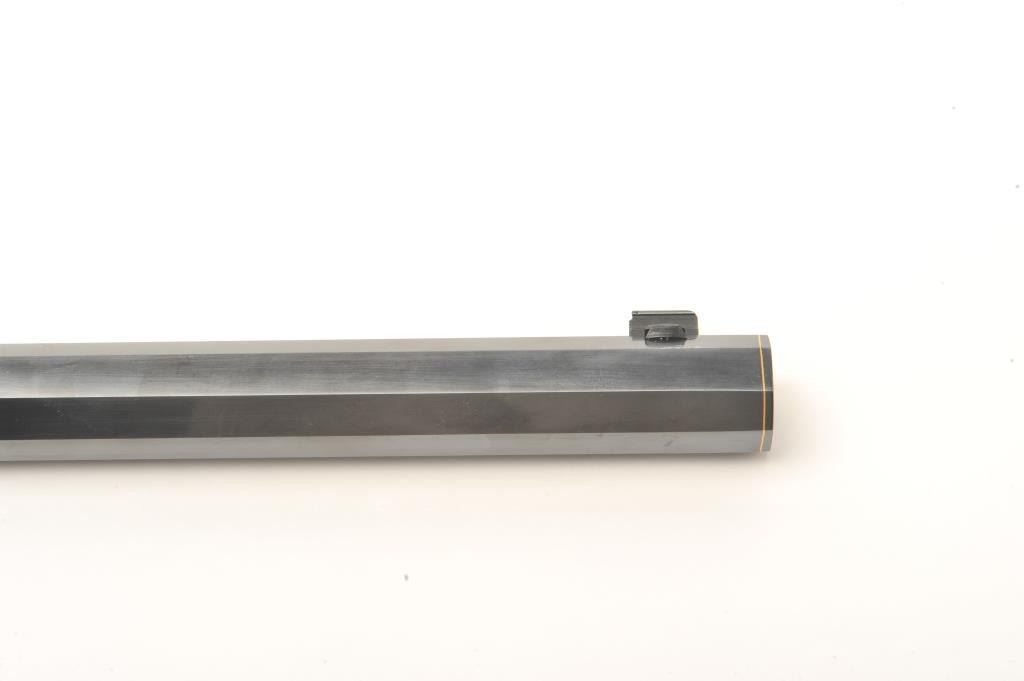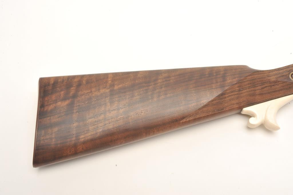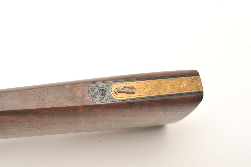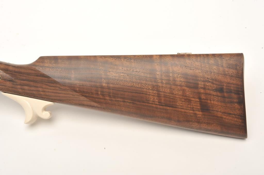 1 of a kind custom Sharps style rifle made for Safari Club fund raising event. Marked “Lil Reliable” on the barrel in .375 Winchester (Big Bore 94 is same caliber not Holland & Holland magnum). Marked on thebottom of the tang “Made by Ron Otto & Aaron Pugsley for S.C.I. 06” and S/N B001. 26” octagon barrel of medium to slightly heavy weight and 42 ½” overall. The barrel measures 1 1/16” across flats. The rifle is handengraved with scroll and game scenes burdened in gold with silver overlay of eagle at the rear of the lock plate. The action is marked “Little Sharps Mfg. Co., Big Sandy Montana” on left rear of action. Select wood checkered stock showing ornate bullet trap with engraved cover and also a raised silver overlay of standing bear. Ivory fore end cap and pistol grip. Retaining all of its original royal blue and vibrant case colors.Almost mint 99.9%. Slight handling only with no evidence of firing or use. Compare at $12,000 plus. Est.: $6,000-$12,000
