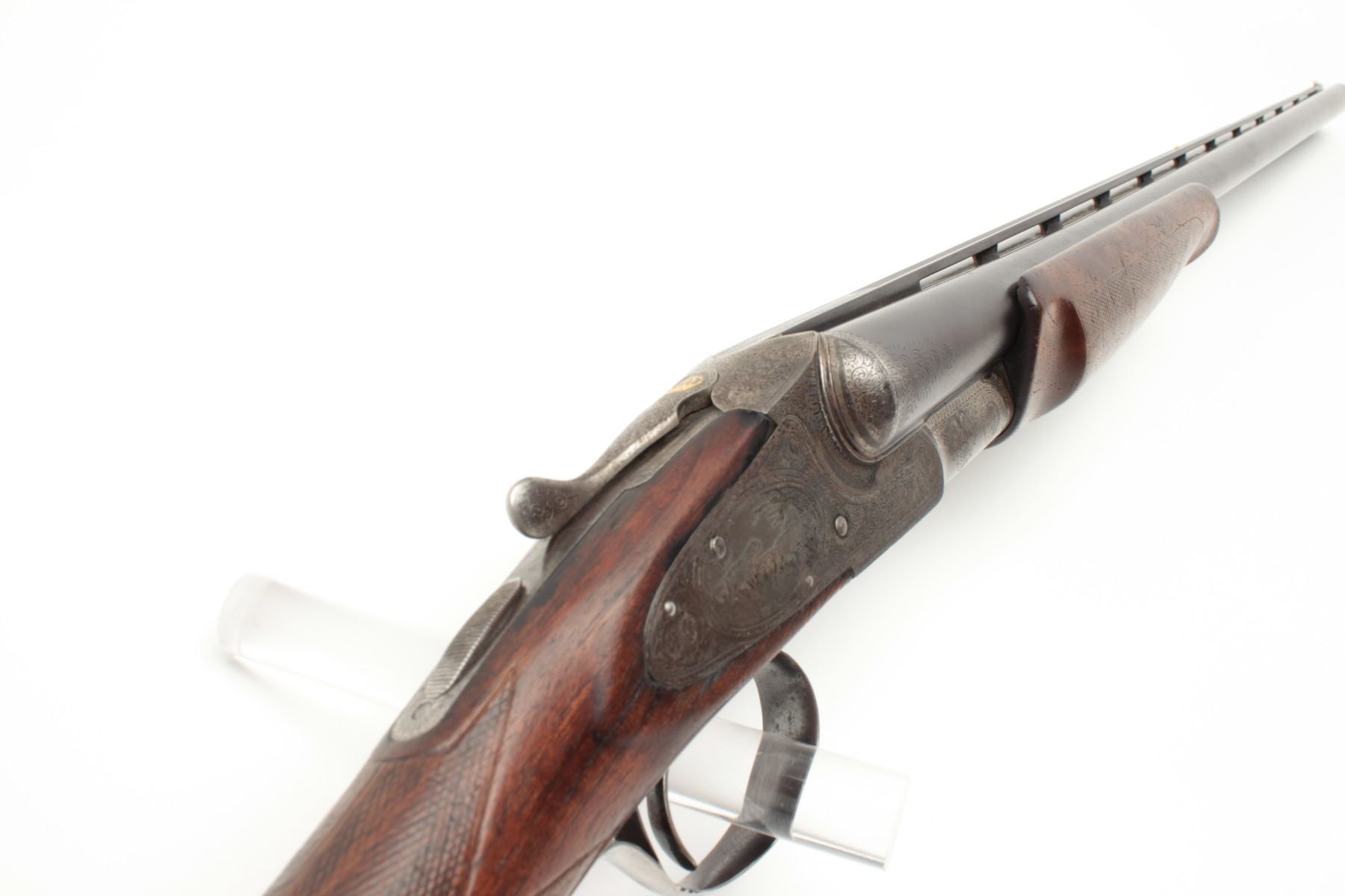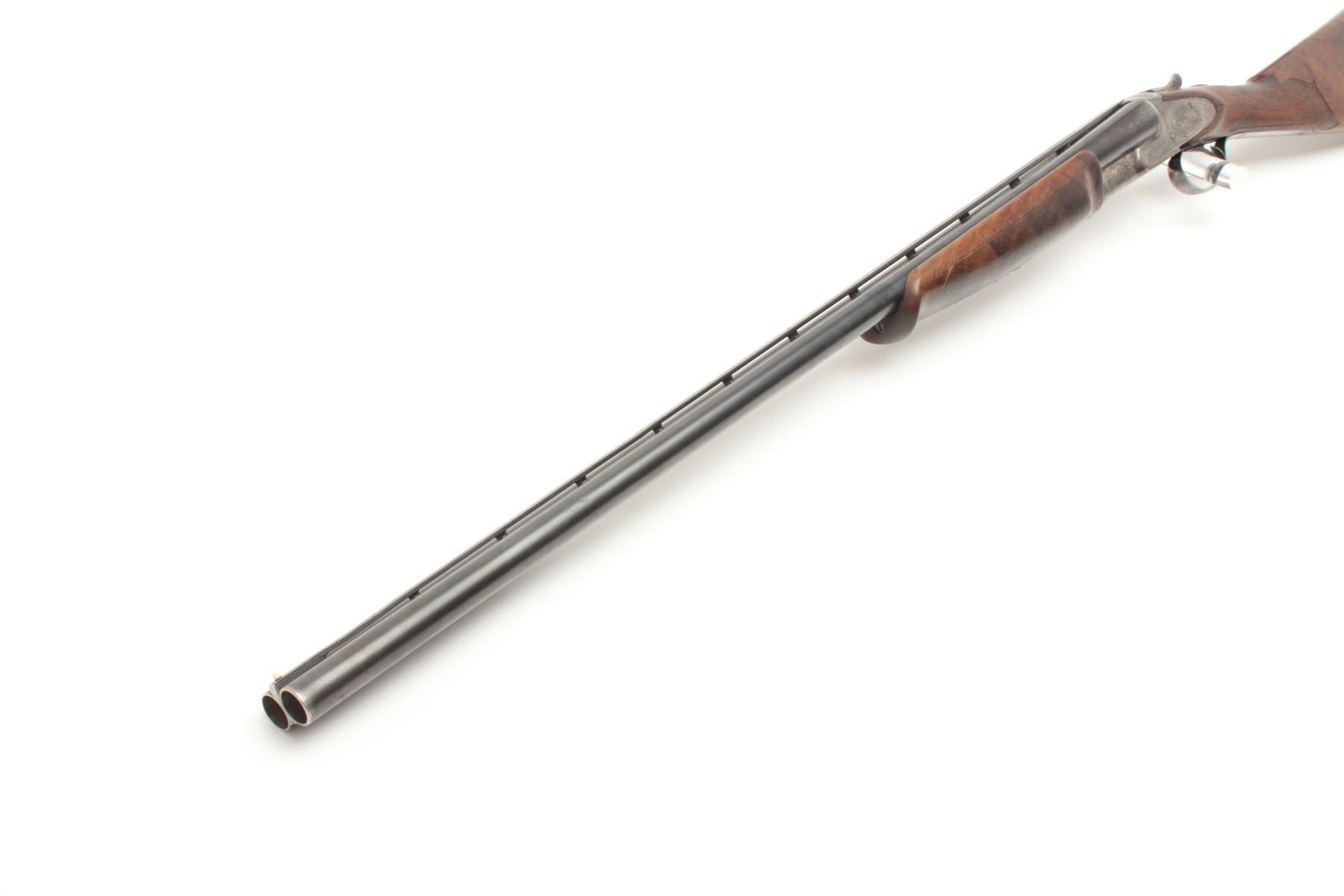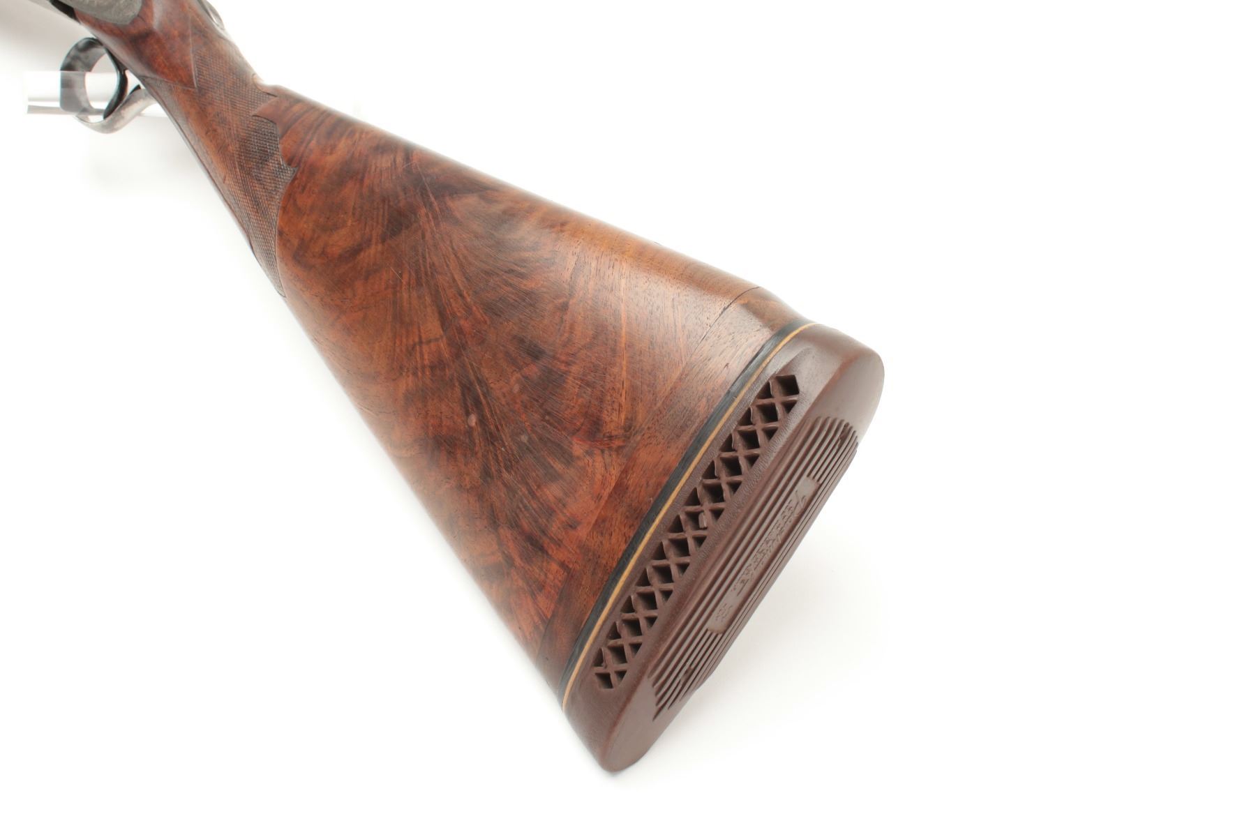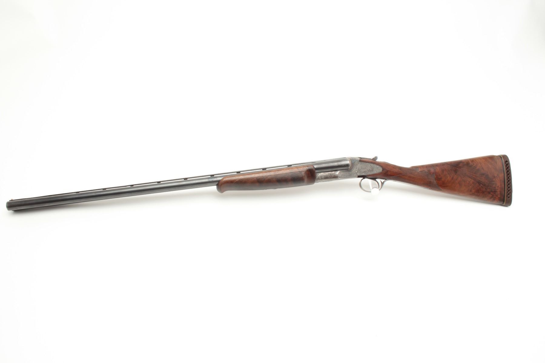 L.C. Smith Crown Grade SxS Shotgun in 12GA with 30” barrels, factory vent rib, single trigger (marked hunter 1 trigger), auto ejectors, choked modified right barrel, and full left barrel, S/N 13021. The metalremains in very good plus condition showing 85%-95% original toning and thinning blue. The frame is crisp with well-defined engraving and 20%-40% case colors going to silvery gray patina. The bores are brightwith no barrel problems and the action is tight. The stock is trap style with a beaver tail fore end and shows wear, repair and damage. The buttstock has been shortened to 13 ½” and a piece of wood and rubber recoilpad added to “stretch” to 14 ¾” to end of pad. The stock shows a loss underneath left lock plates and stress crack behind each lock plate. The fore end checkering is worn. The stock should be restored or replaced in ouropinion. All in all a desirable Crown Grade with scarce configurations from a local family who purchased 2nd hand after WWII. (C&R) Est.: $5,000-$10,000