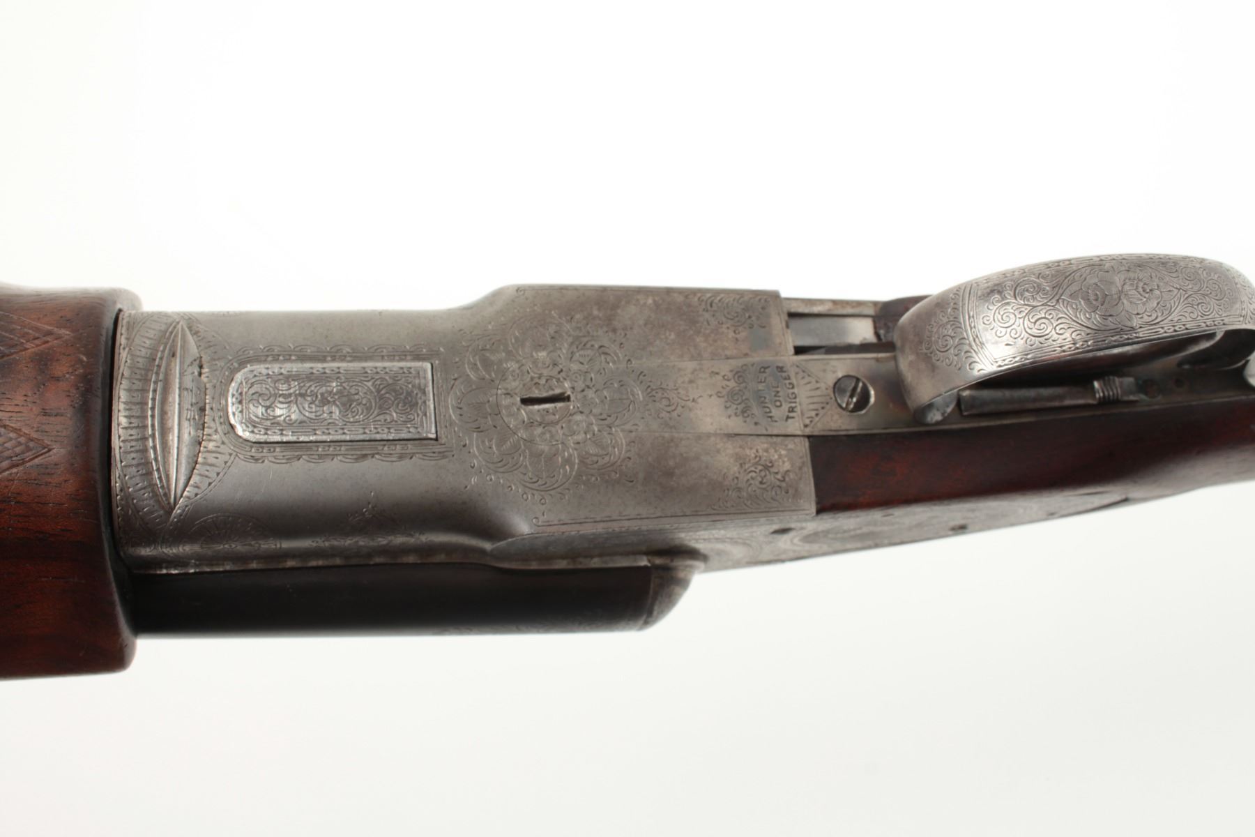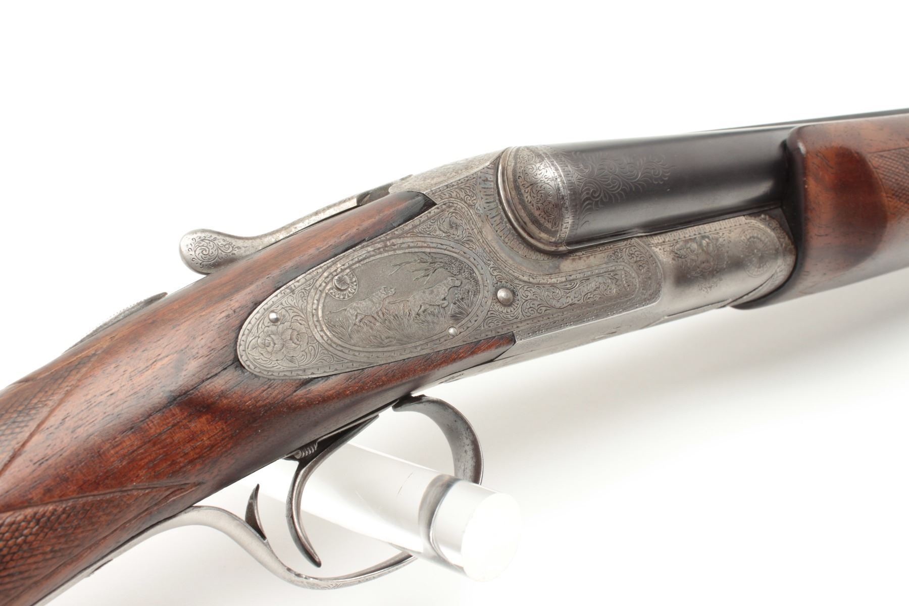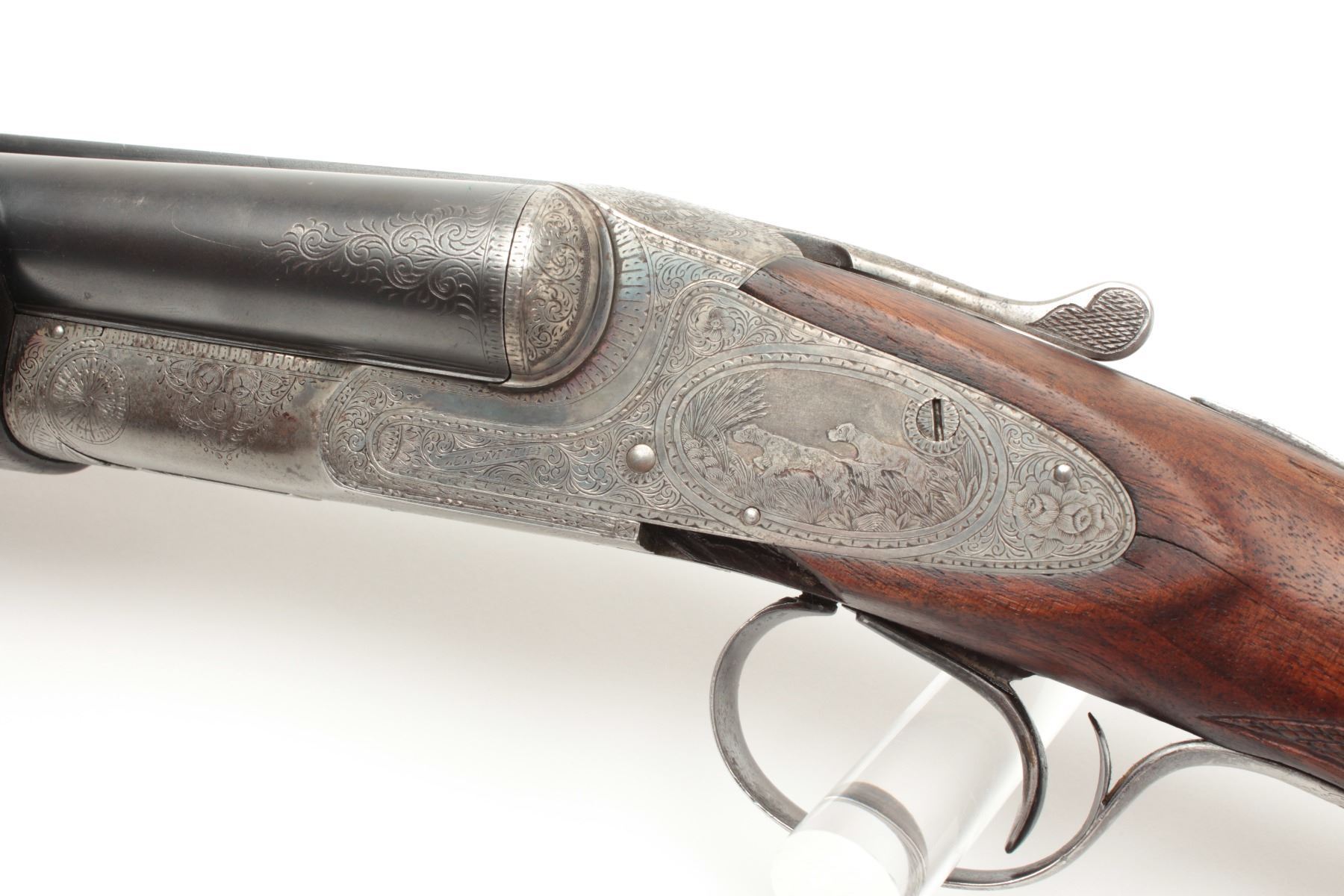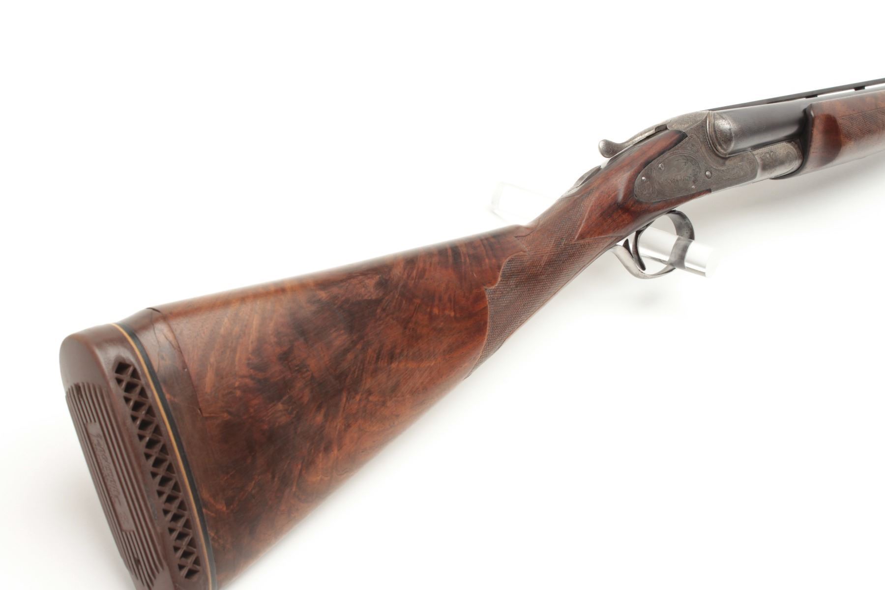 L.C. Smith Crown Grade SxS Shotgun in 12GA with 30” barrels, factory vent rib, single trigger (marked hunter 1 trigger), auto ejectors, choked modified right barrel, and full left barrel, S/N 13021. The metalremains in very good plus condition showing 85%-95% original toning and thinning blue. The frame is crisp with well-defined engraving and 20%-40% case colors going to silvery gray patina. The bores are brightwith no barrel problems and the action is tight. The stock is trap style with a beaver tail fore end and shows wear, repair and damage. The buttstock has been shortened to 13 ½” and a piece of wood and rubber recoilpad added to “stretch” to 14 ¾” to end of pad. The stock shows a loss underneath left lock plates and stress crack behind each lock plate. The fore end checkering is worn. The stock should be restored or replaced in ouropinion. All in all a desirable Crown Grade with scarce configurations from a local family who purchased 2nd hand after WWII. (C&R) Est.: $5,000-$10,000
