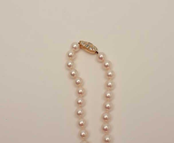 Natural “Gem” quality pink rose or “Angel skin” color matched cultured pearls of approximately 8-8 ½ MM with a 14K diamond mounted clasp. Measures 36” in length with 101 pearls. Gemologist appraised at $20,000in 1984. Purchased in Beverly Hills. Estate consigned. The best compliment we can give this set is they are the grade normally collected by the Japanese buyers who appreciate their rarity in this grade. Est.:$5,000-$10,000