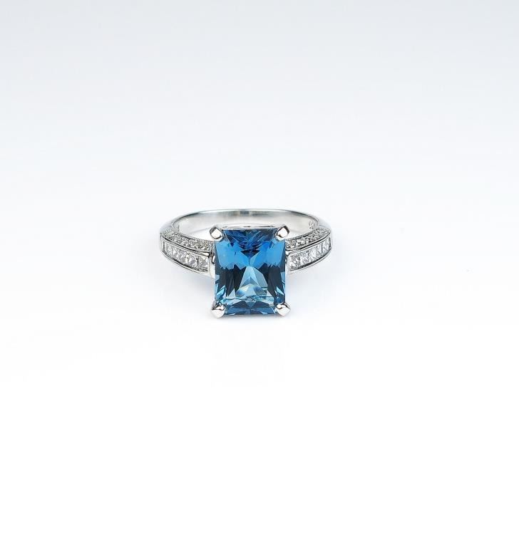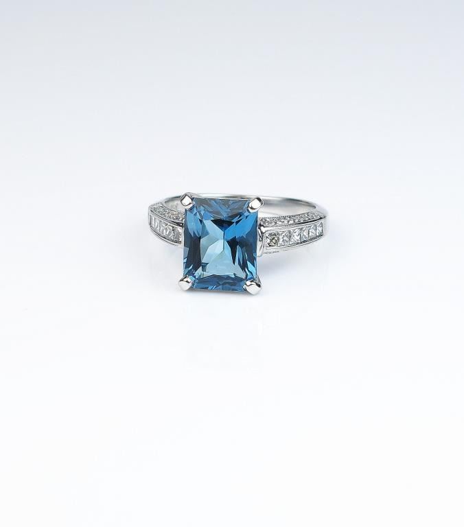 Gorgeous ladies ring set with a fine London blue Topaz weighing approx. 3.50- 4.00 carats and set with 32 fine Princess and round cut diamonds weighing approx. 0.70 carats of G-H colors and VS clarity in a 14 karat whitegold custom setting. Retail $2,000-$3,000 Estimates $1,000-$1,500 Nice