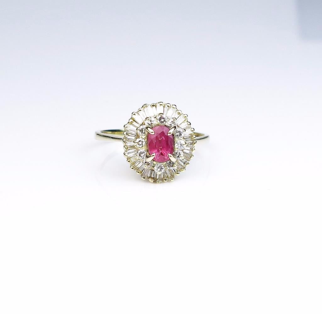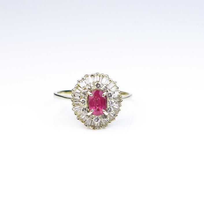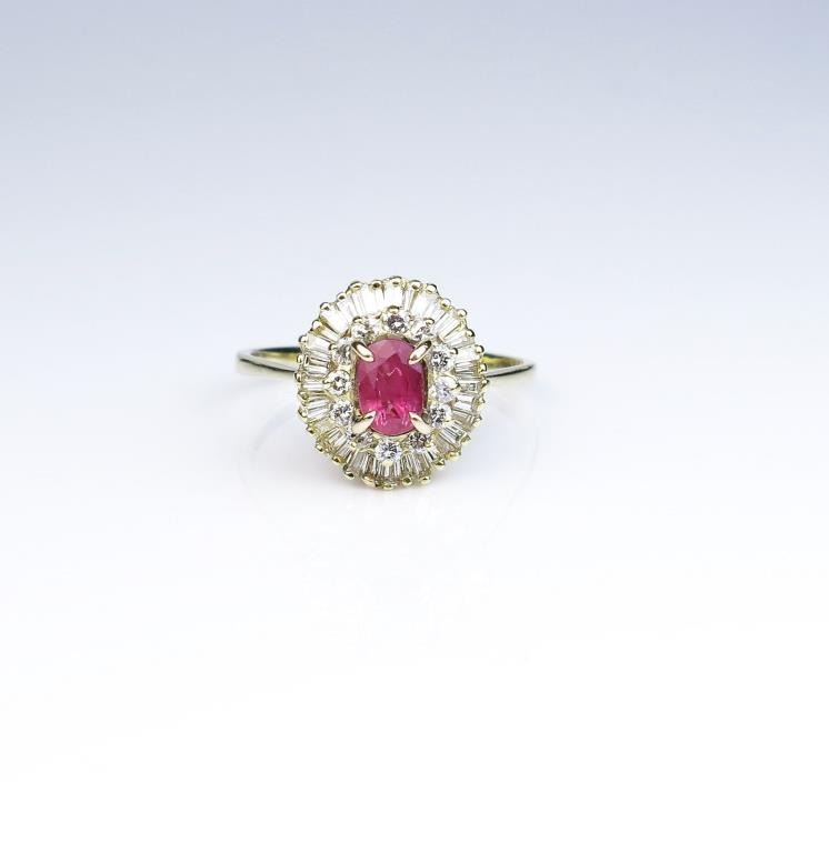 Lot 1603a Dazzling ballerina design ring set with a purplish pink ruby and surrounded by over 50 baguette an
