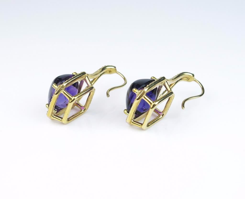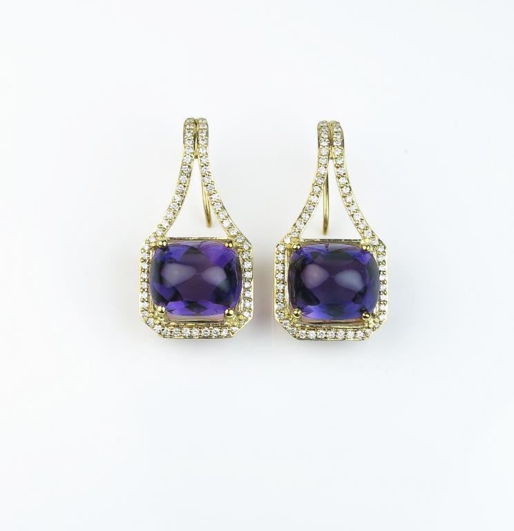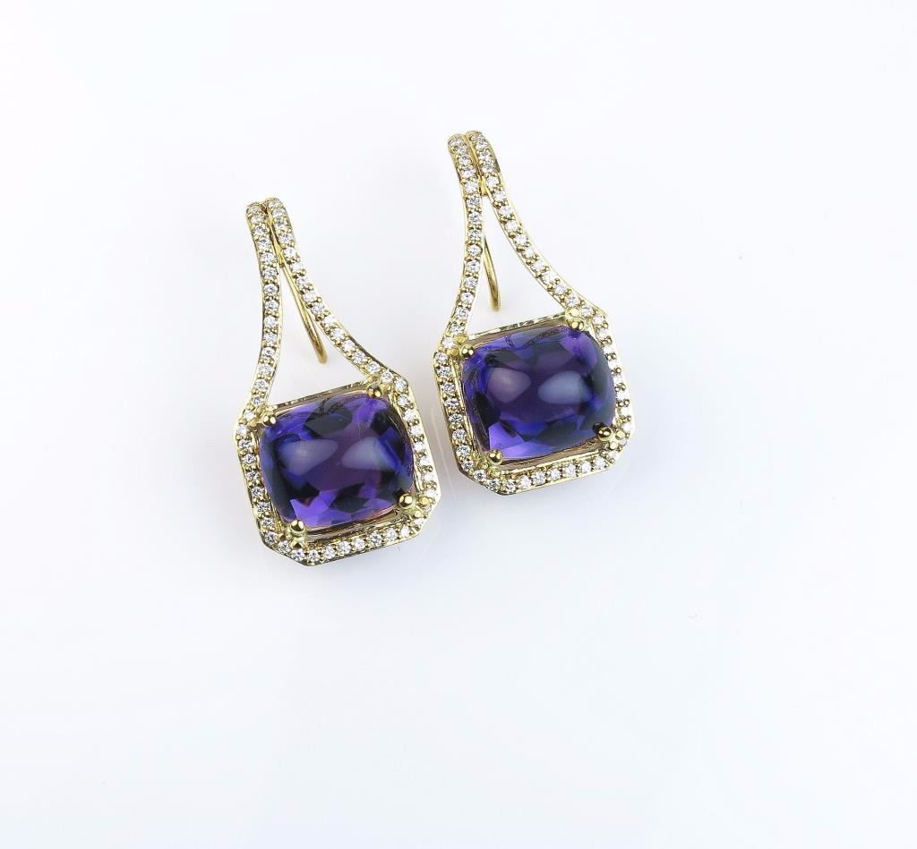 Spectacular ladies custom made earrings featuring two extra fine VS quality Cabochon Amethyst weighing approx. 10.00 carats and accented with over 115 ‘IDEAL’ cut diamonds weighing approx. 1.50 carats of F-G colorsand VS clarity set in an 18 karat yellow gold custom made setting. Retail $5,000-$7,000 Estimates $4,000-$5,000