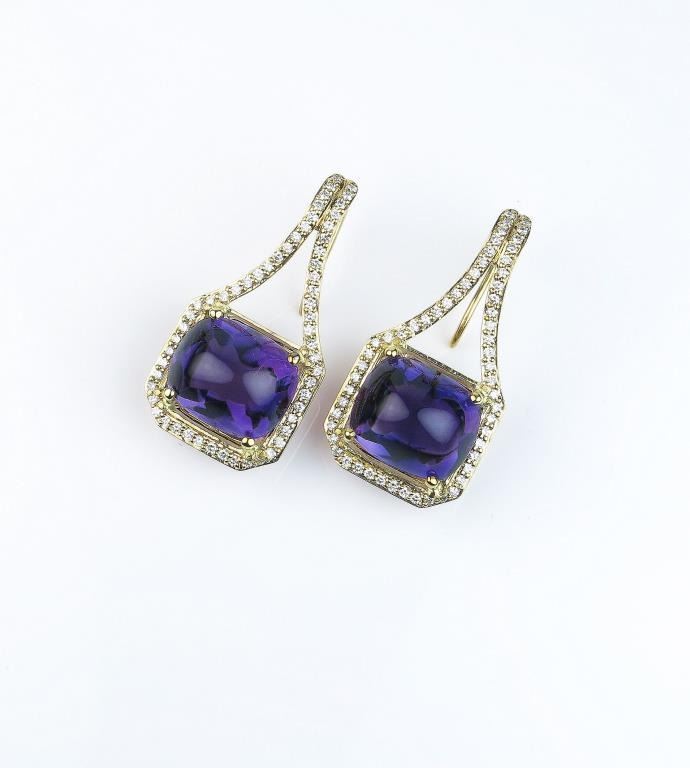 Lot 1604 Spectacular ladies custom made earrings featuring two extra fine VS quality Cabochon Amethyst weig