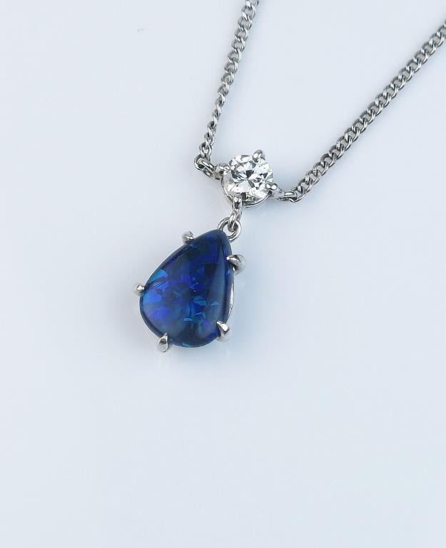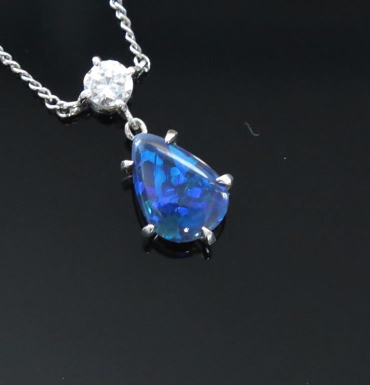 High quality ladies pendant featuring an extra fine Australian Black Opal weighing approx. 1.50-2.00 carats and side diamond of approx. 0.32 carats of H-I color and VS clarity set in 14 karat white gold setting.Retail $3,000-$4,000 Estimates $1,500-$2,000 Fine Black Opals are becoming rare and expensive.
