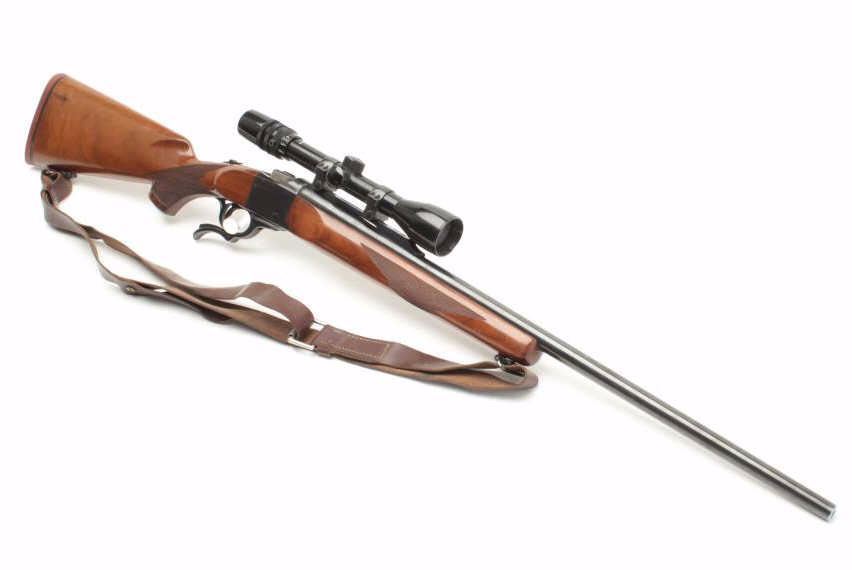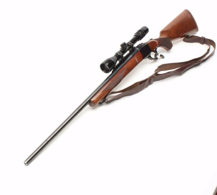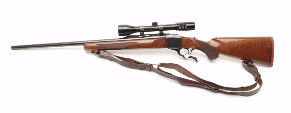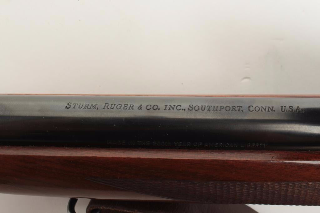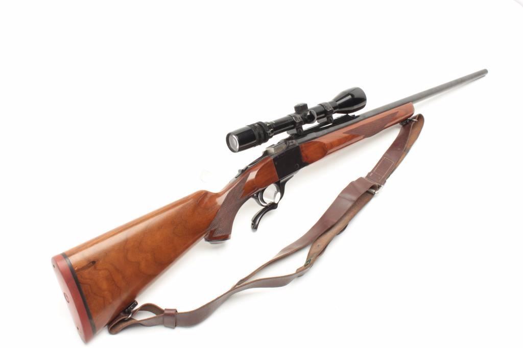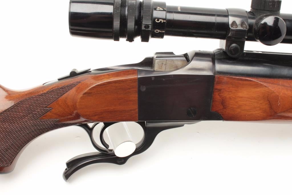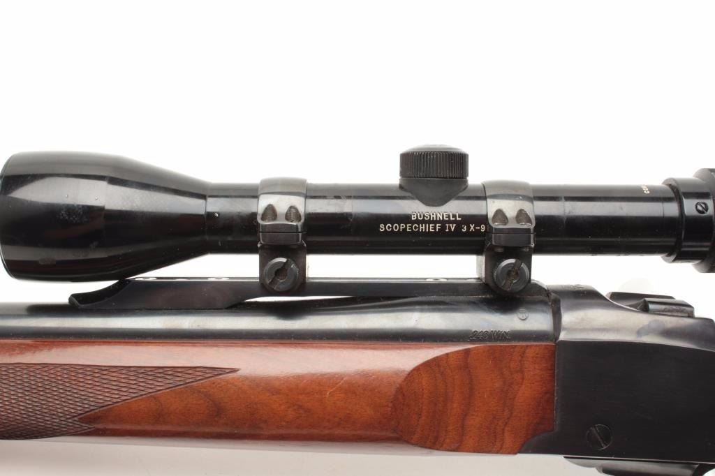 Ruger No. 1 Single Shot rifle in .243 caliber with Bushnell 3x9 scope on factory mount. Quick detachable swivels with leather sling. 26” barrel and made “200th Year of Liberty” (1976). Fine to excellent used condition and95%-98% overall. Minor use with some storage marks in the stock. (C&R) Est.: $400-$800