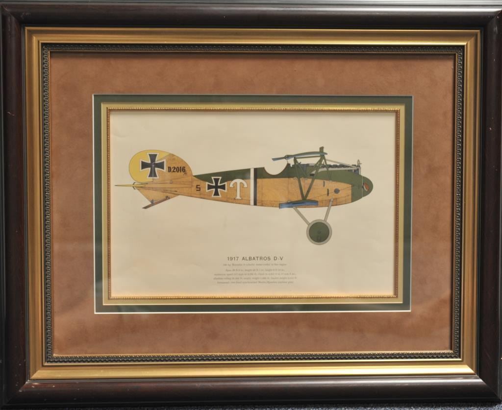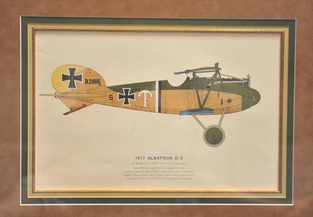 Lot of 2 beautifully framed and matted large color prints, one of a 1917 Sopwith Camel bi-plane approximately 24” x 30” overall and one of a 1917 German Albatros D.V. bi-plane, approximately 24” x 30” overall. From theBill Bettis Nieuport 17 Restaurant collection. Est.: $200-$400.