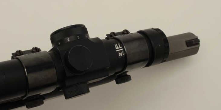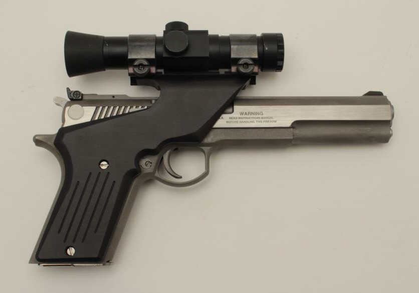 AMT Automag III Semi-Auto pistol in .30 carbine caliber with stainless steel and scope mount attached to the right grip with red dot pistol scope. Fine used condition. Out of production and collectible.(Modern/PPT) Est.: $300-$600