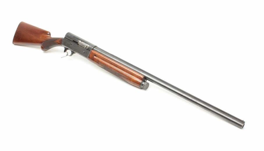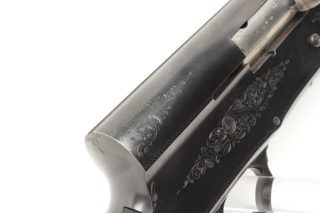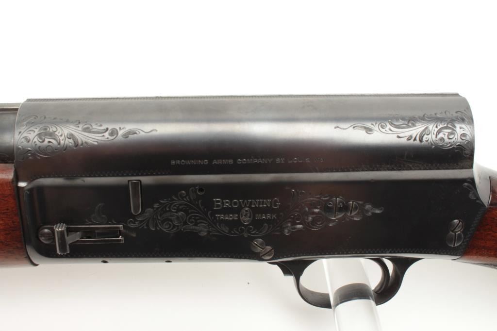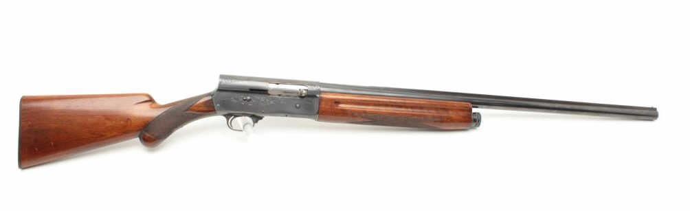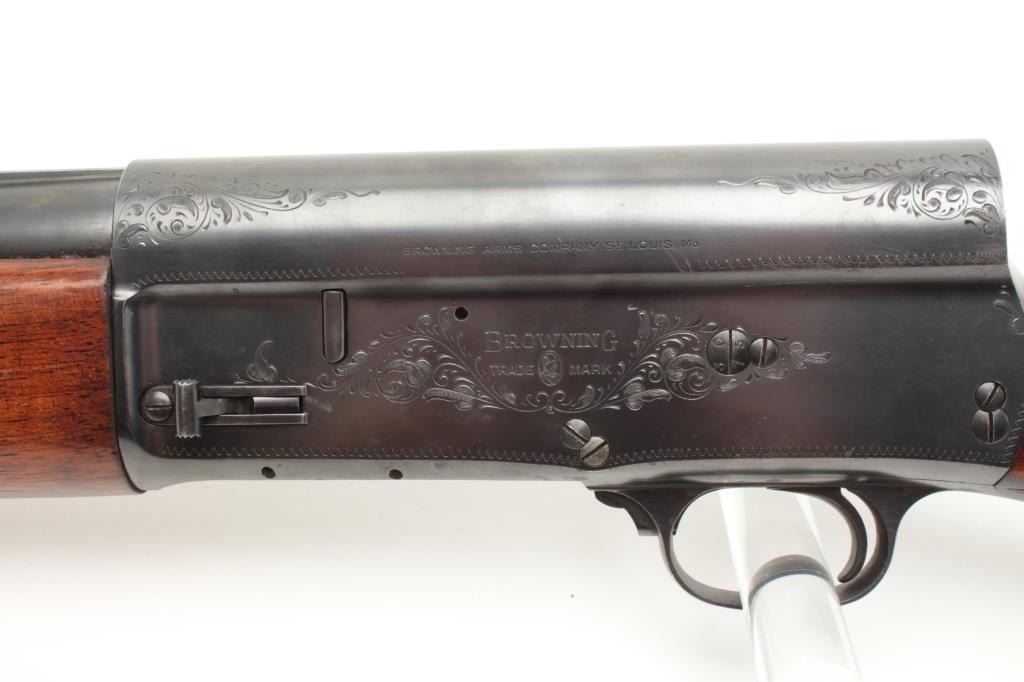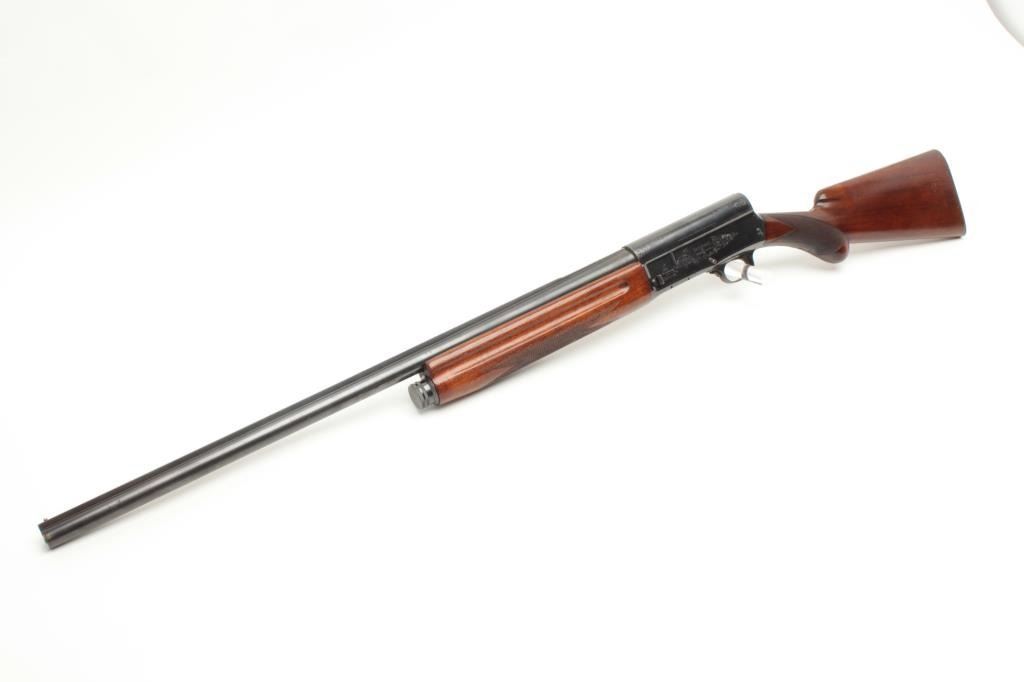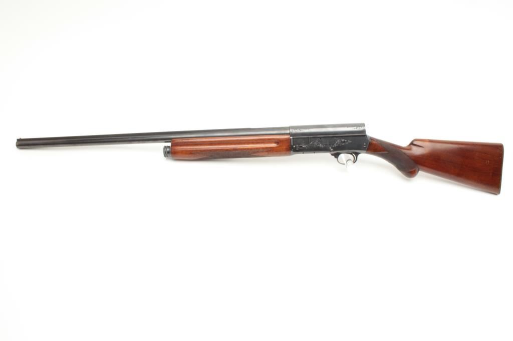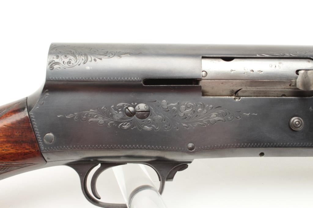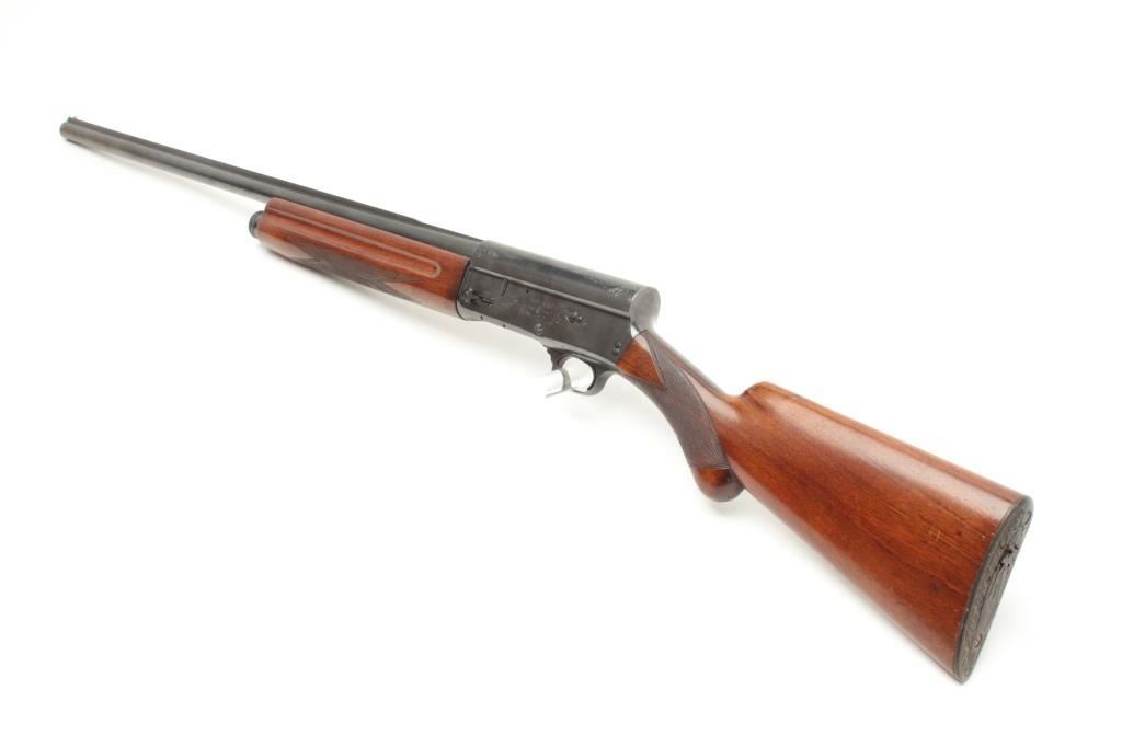 Browning A5 12 GA Semi-Auto shotgun, early Belgium production, S/N 253705 with 28: barrel and raised non vent rib choked modified. Round pistol grip and original butt plate. 90%-95% with minor storage and dingsin the wood. Good action and fair bore. (C&R) Est.: $300-$600