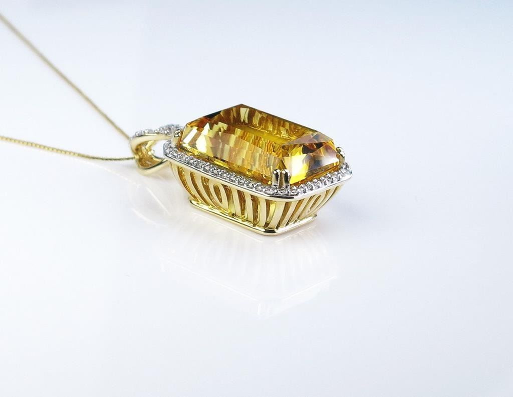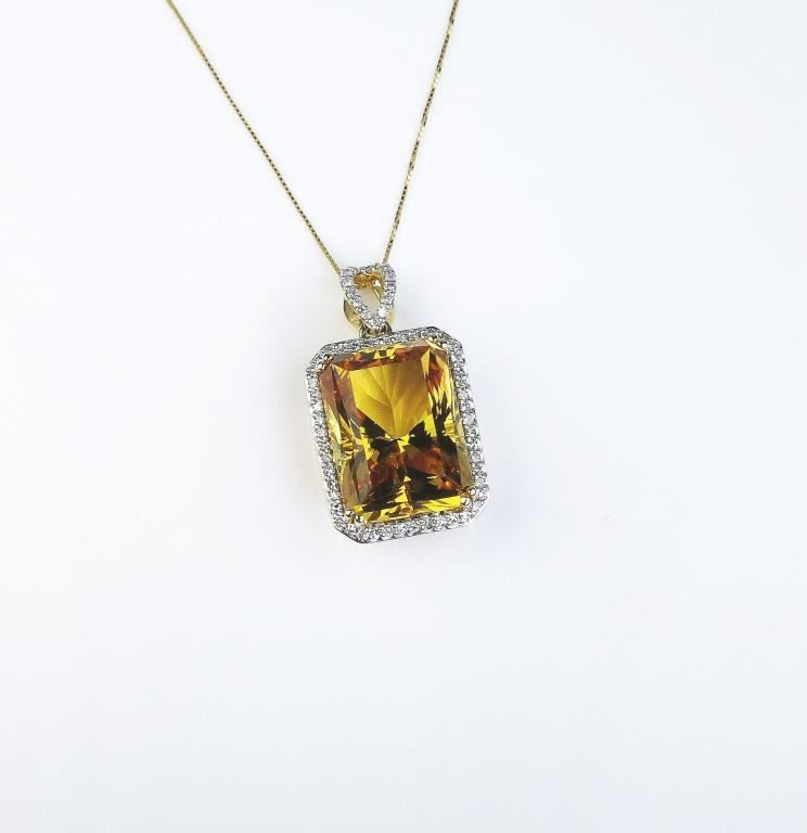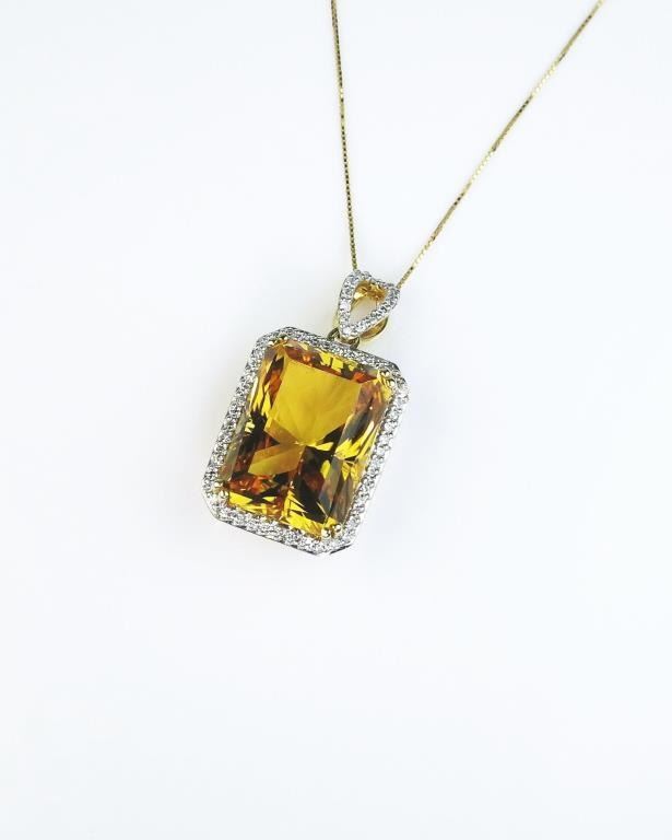 Dazzling pendant featuring a radiant cut Citrine weighing approx. 15.00 carats and micro set with over 62 round diamonds weighing approx. 0.30 carats of G-H colors and VS clarity set in 14 karat yellow gold.Retail $2,000-$3,000 Estimates $1,000-$1,500