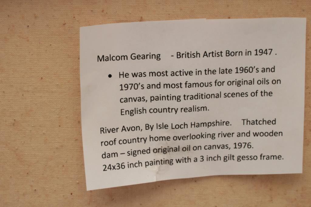 Original oil painting signed Malcom Gearing measuring 24” x 36” and titled “River Avon, by Isle Loch Hampshire. From a major Pasadena collection. Est.: $300-$600