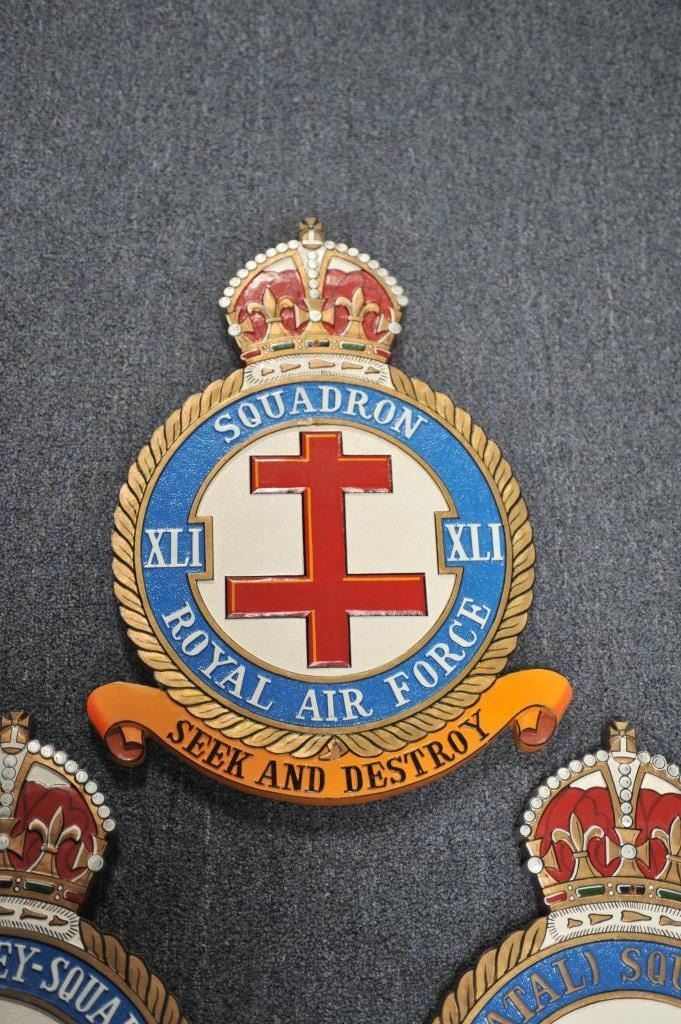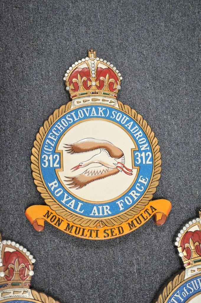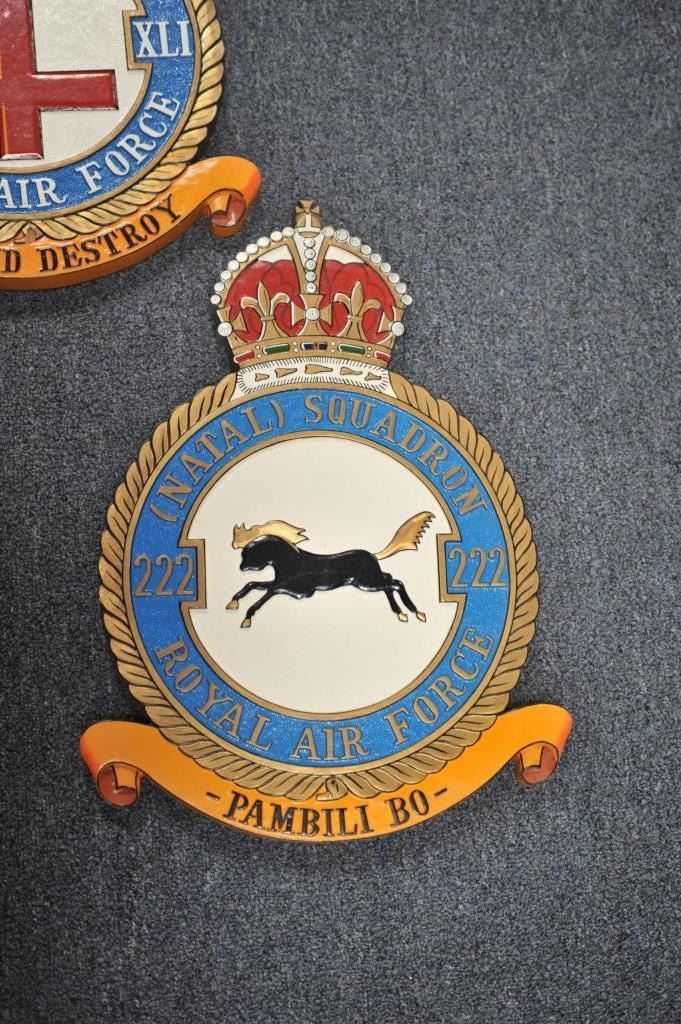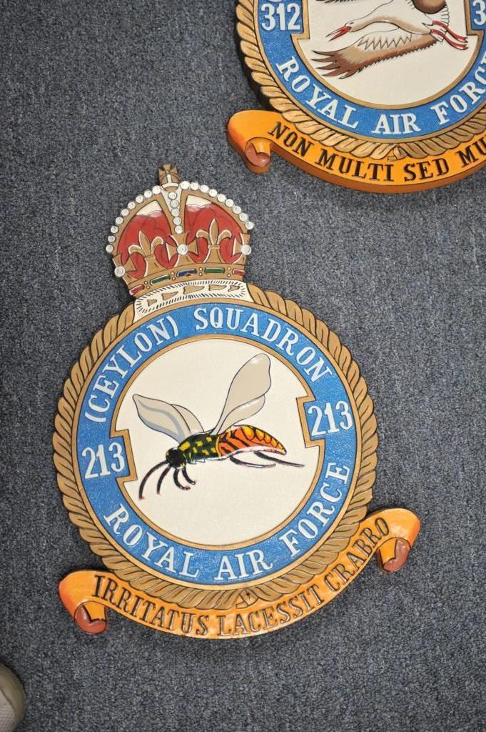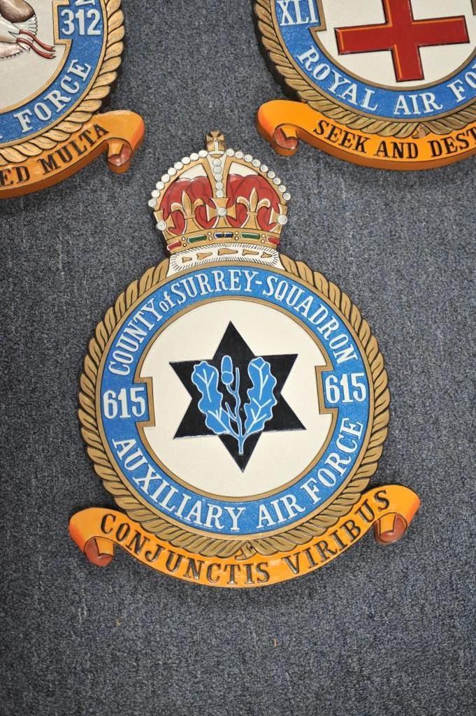 Lot 1684 Lot of 5 carved and painted wooden R.A.F. Squadron plaques, each approximately 18” X 13” overall.