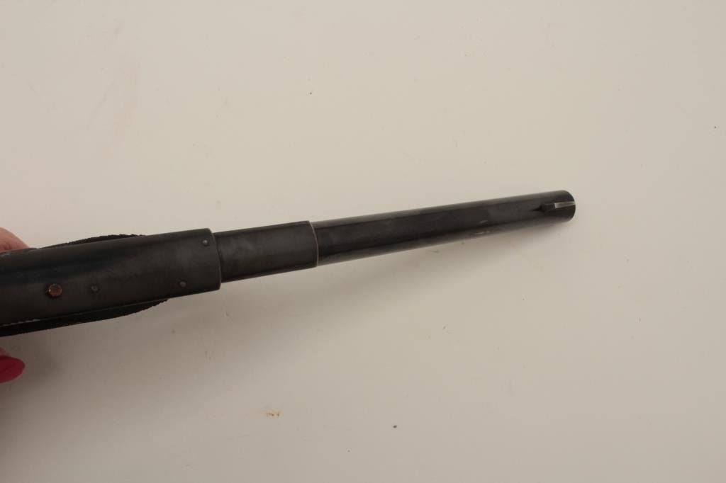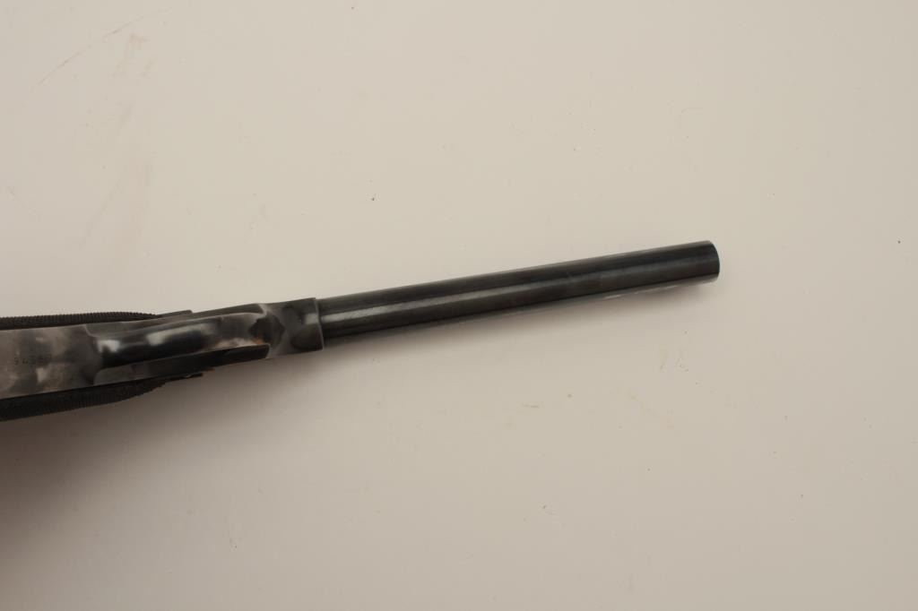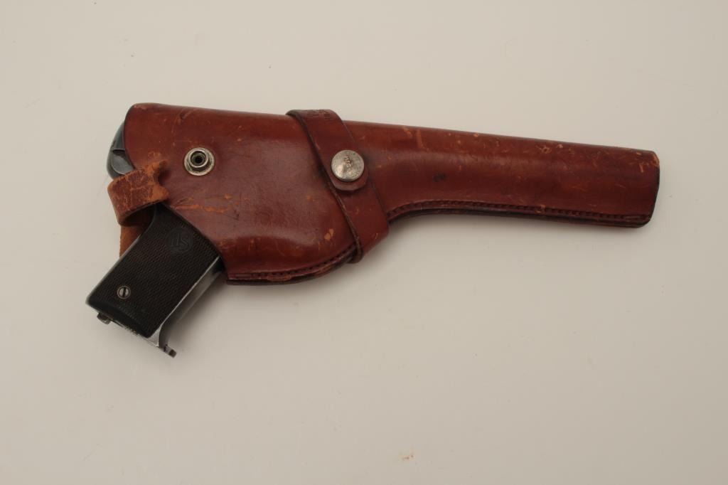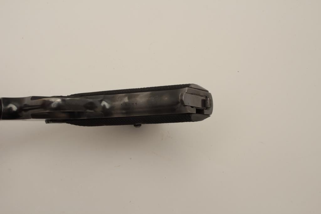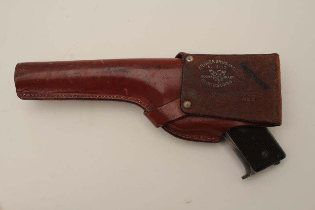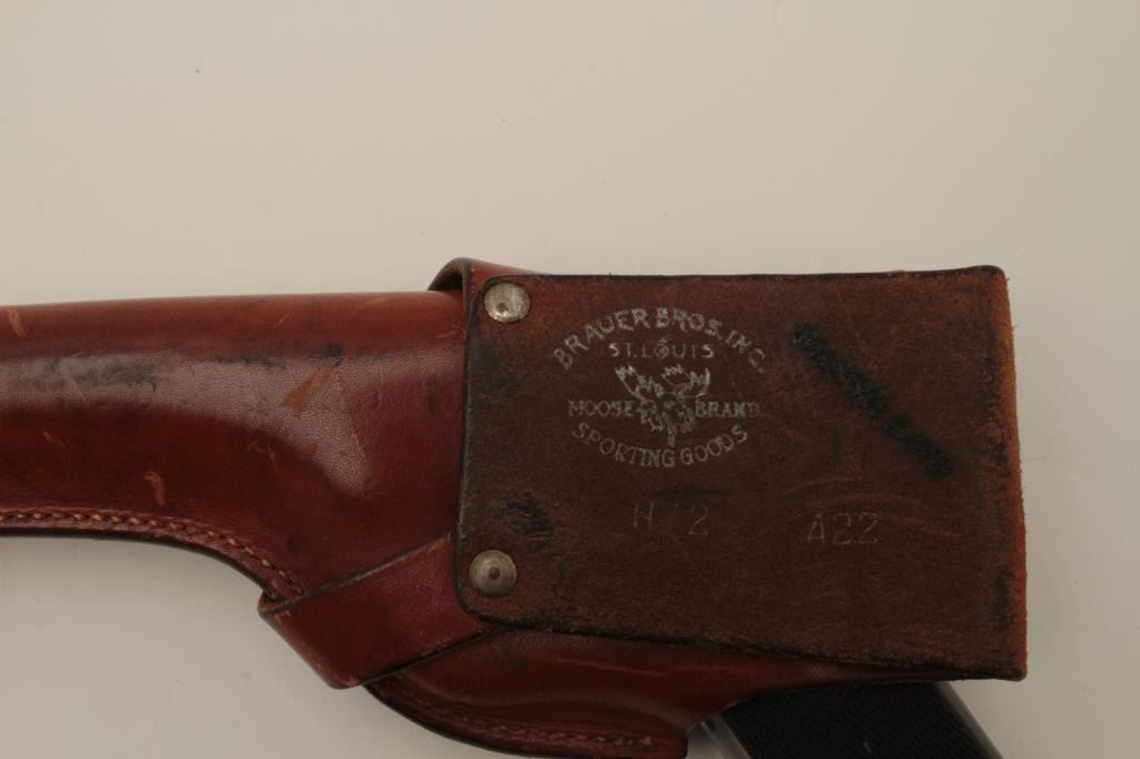 Hi Standard Model B .22 L.R. caliber semi-auto pistol, S/N 59276. A fairly scarce and collectible early Hi Standard with a 6” barrel, approximately 80%-90% original blue with loss on the straps from handling. Thestocks have toned to a brownish color but very good. Fine bore and some minor scratches in finish. Correct clip and holster included. (C&R/PPT) Est.: $300-$600
