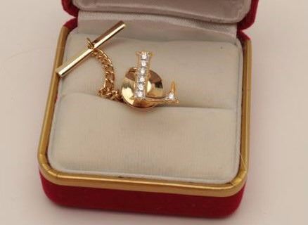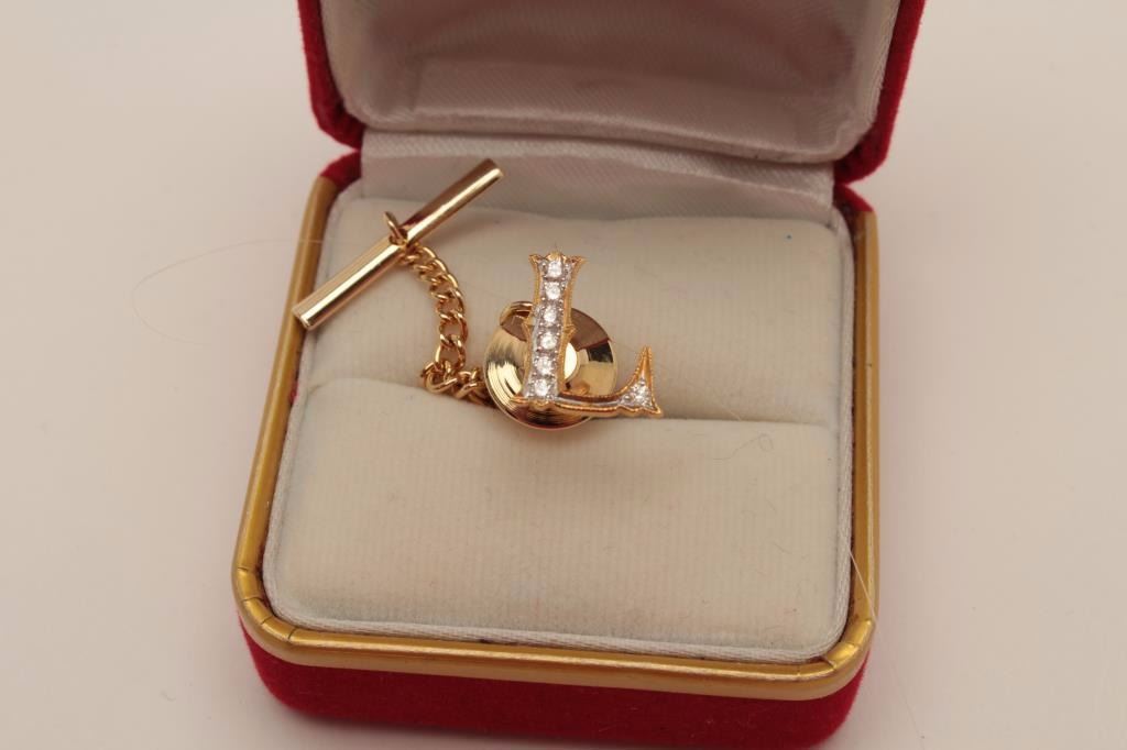 Lot 1691 14k (unmarked) “L” tie tack set with diamonds of Lee of Buddy’s batting cages. Iconic S.F. valley