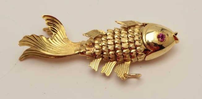 Lot 1695 1960’s Asian made gold fish pendant. Cut stone eyes. 14k-18k. Estate consigned. 10 grams. Est.: $1