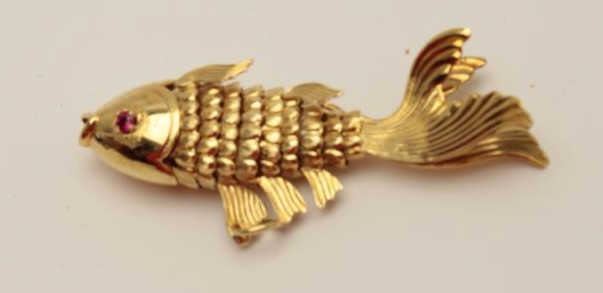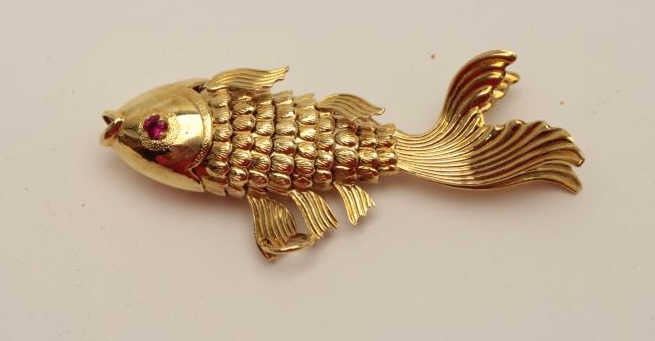 1960’s Asian made gold fish pendant. Cut stone eyes. 14k-18k. Estate consigned. 10 grams. Est.: $150-$300