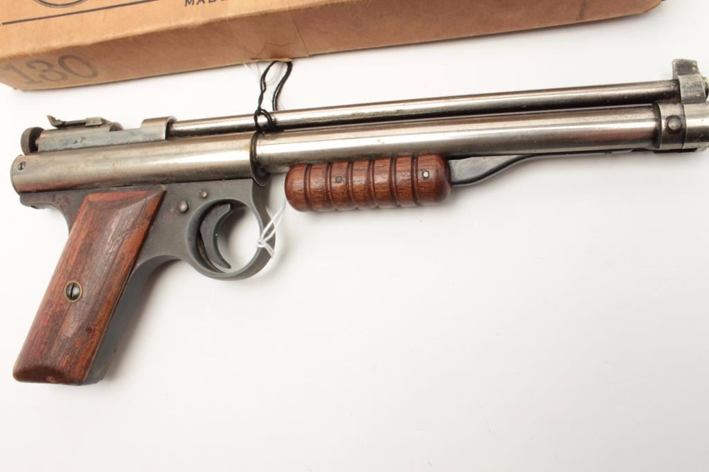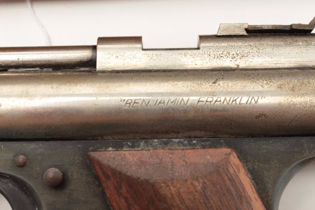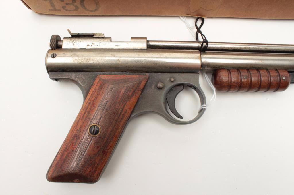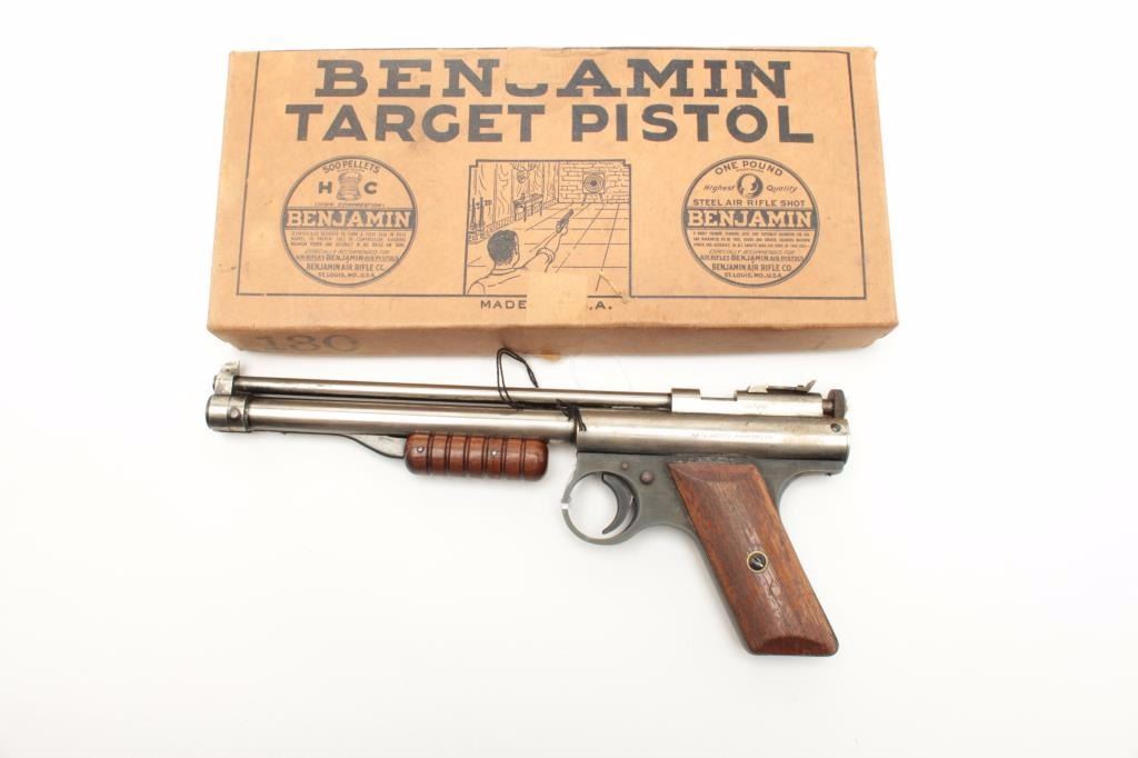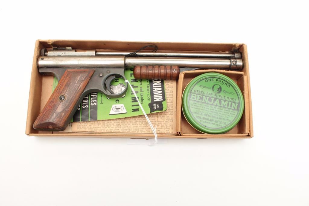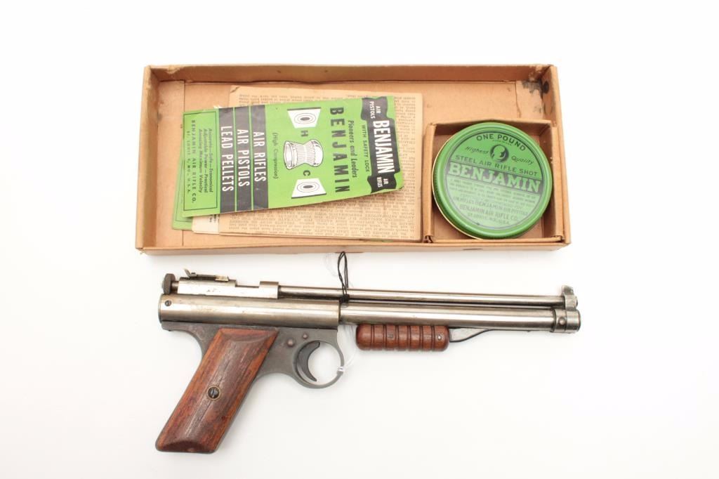 Benjamin pellet Target pistol in original two piece cardboard box with tine of Steel Air Rifle Shot and paperwork; nickel finish, wood grips; working at time of description. Est.: $125-$250.