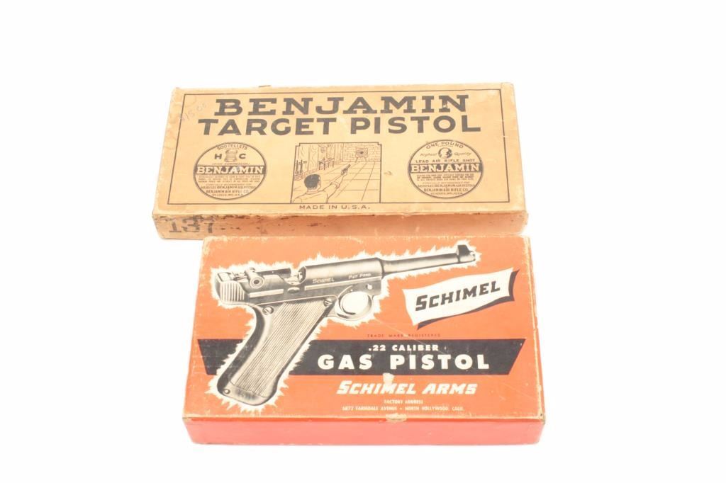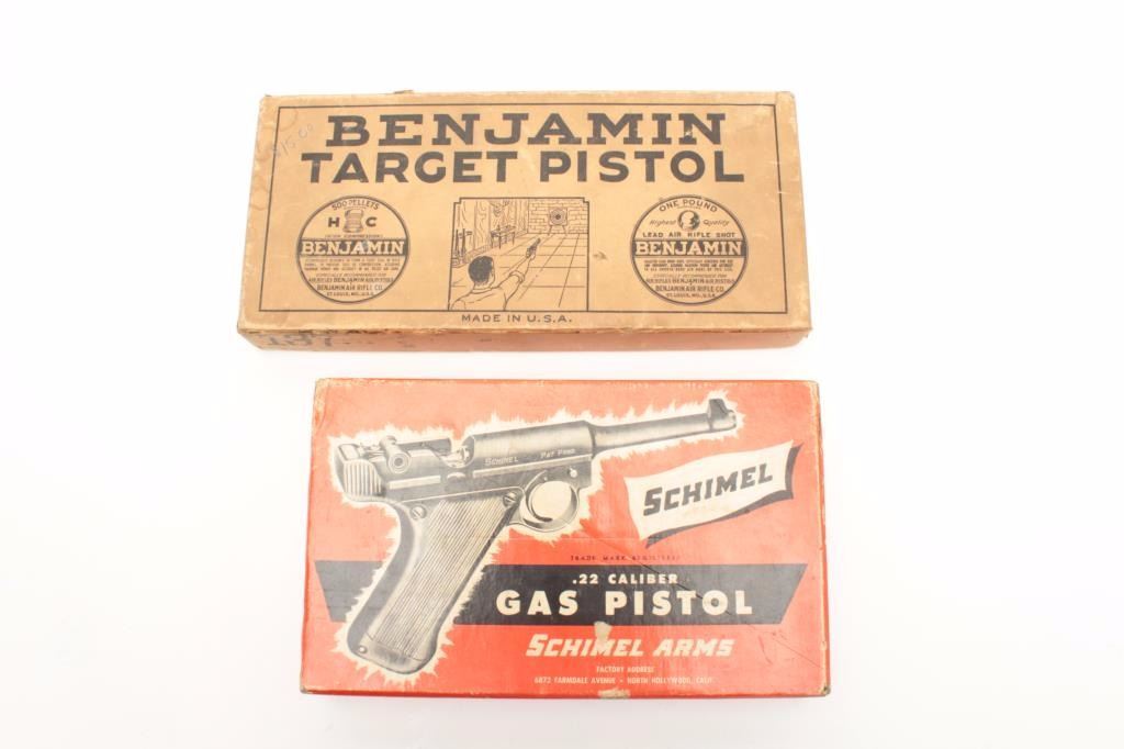 Lot of 2 cardboard two-piece empty pellet pistol boxes, one for the Schimel Arms .22 caliber Gas Pistol, the other for the Benjamin Air Pistol. Est.: $50-$75.