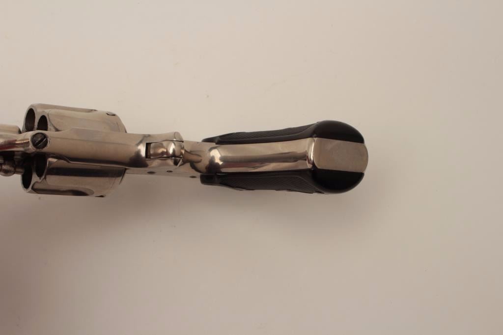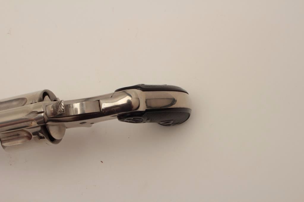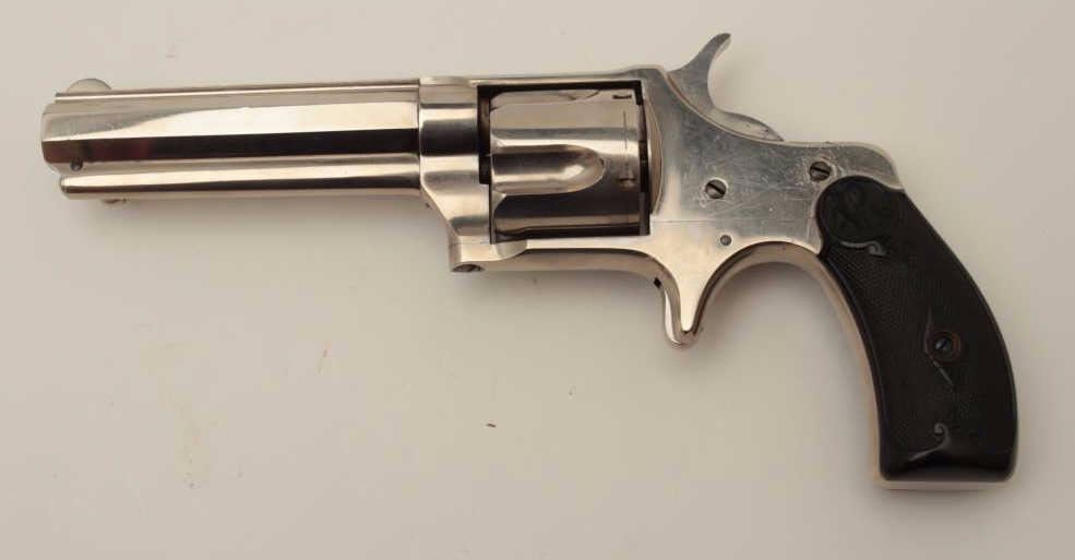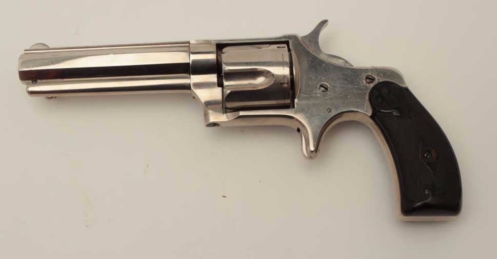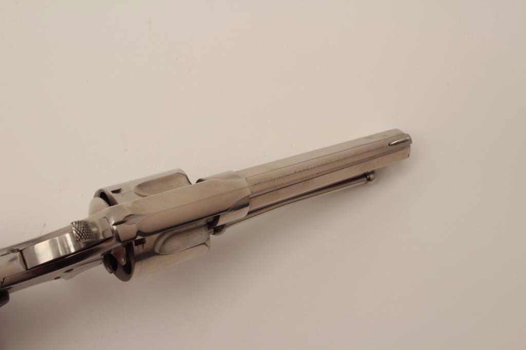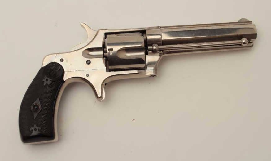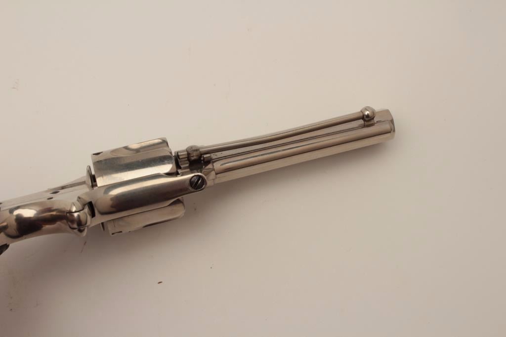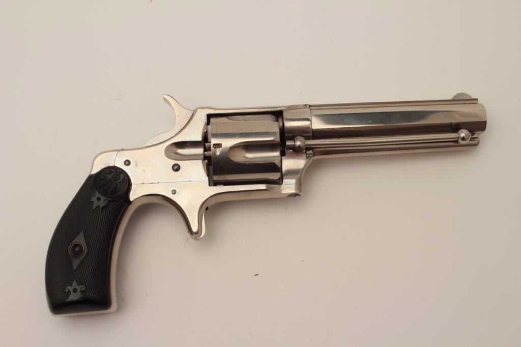 Remington Smoot New Model No. 3 revolver, saw handle style, .38CF caliber, 3.75” octagon barrel, nickel finish, checkered hard rubber grips with “R” monogram at top of each grip, no visible S/N, in overall fine conditionshowing approximately 99% + original finish, crisp action, sharp markings and fine grips. (Antique). Est.: $300-$600.