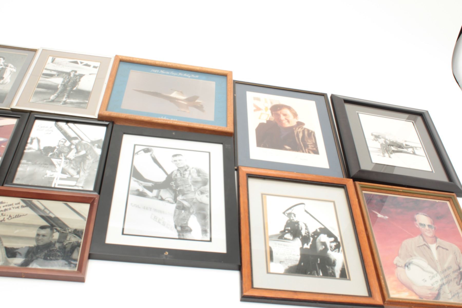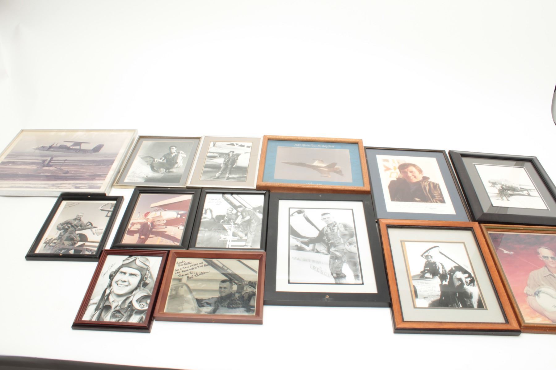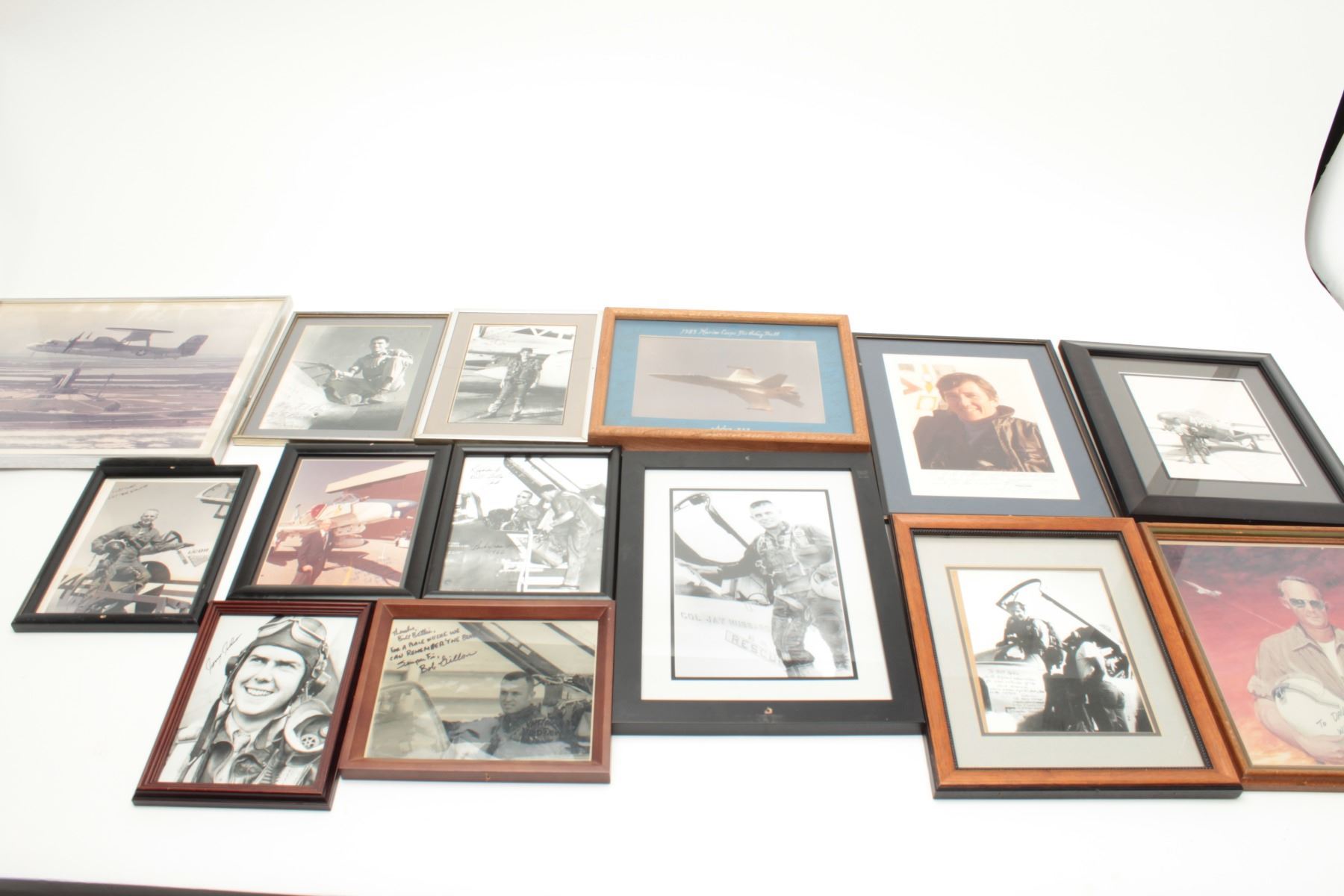 Lot 1723 Lot of 14 jet era aviation framed photos, many signed by pilot like Col. Reto Sayer, “Ozzie” Osegu
